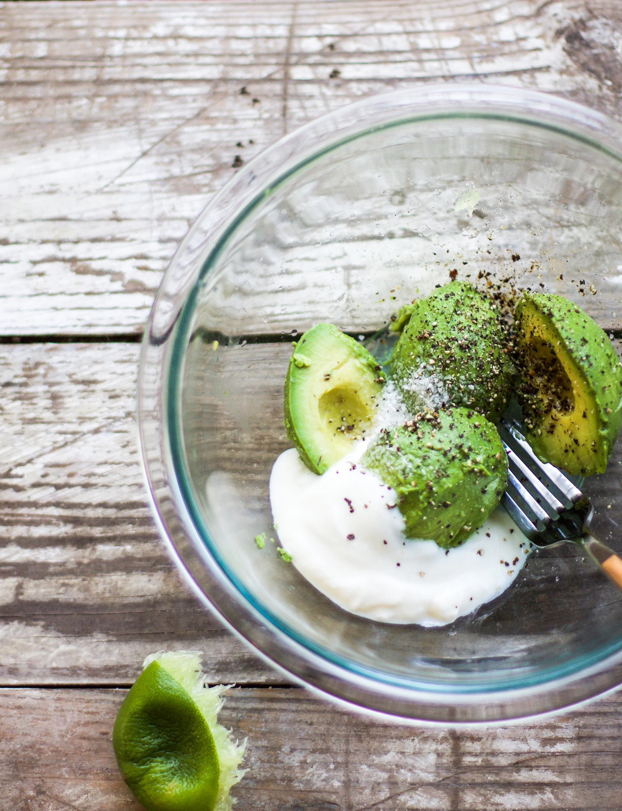 While the burgers are cooking, combine avocados, lime juice, yogurt, salt, and pepper into a bowl and stir to combine until smooth. Set aside.