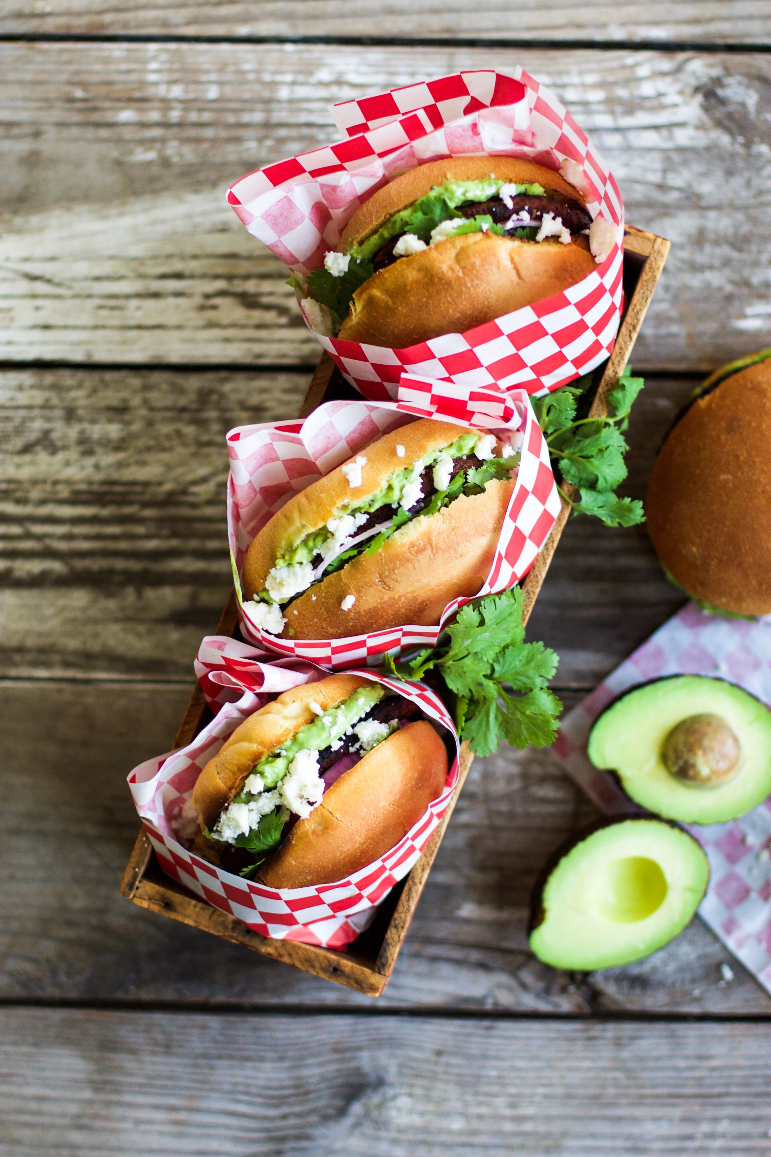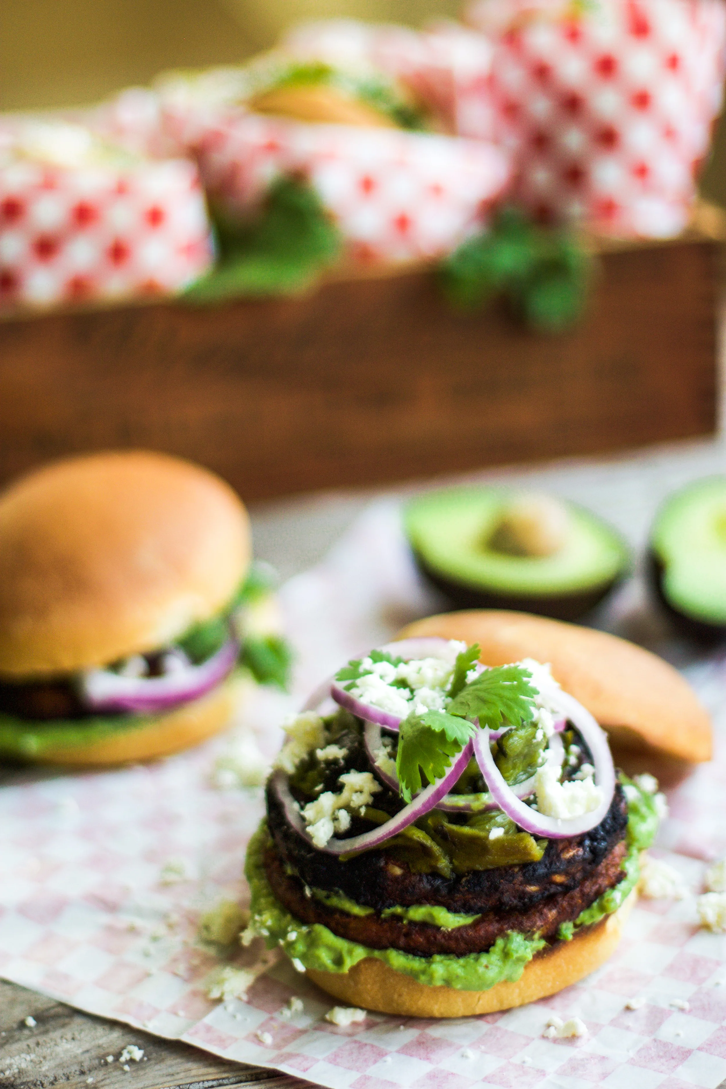 To assemble, spread some of the avocado spread on the bun followed by burger and then topped with the poblano pepper, red onion, and cilantro.