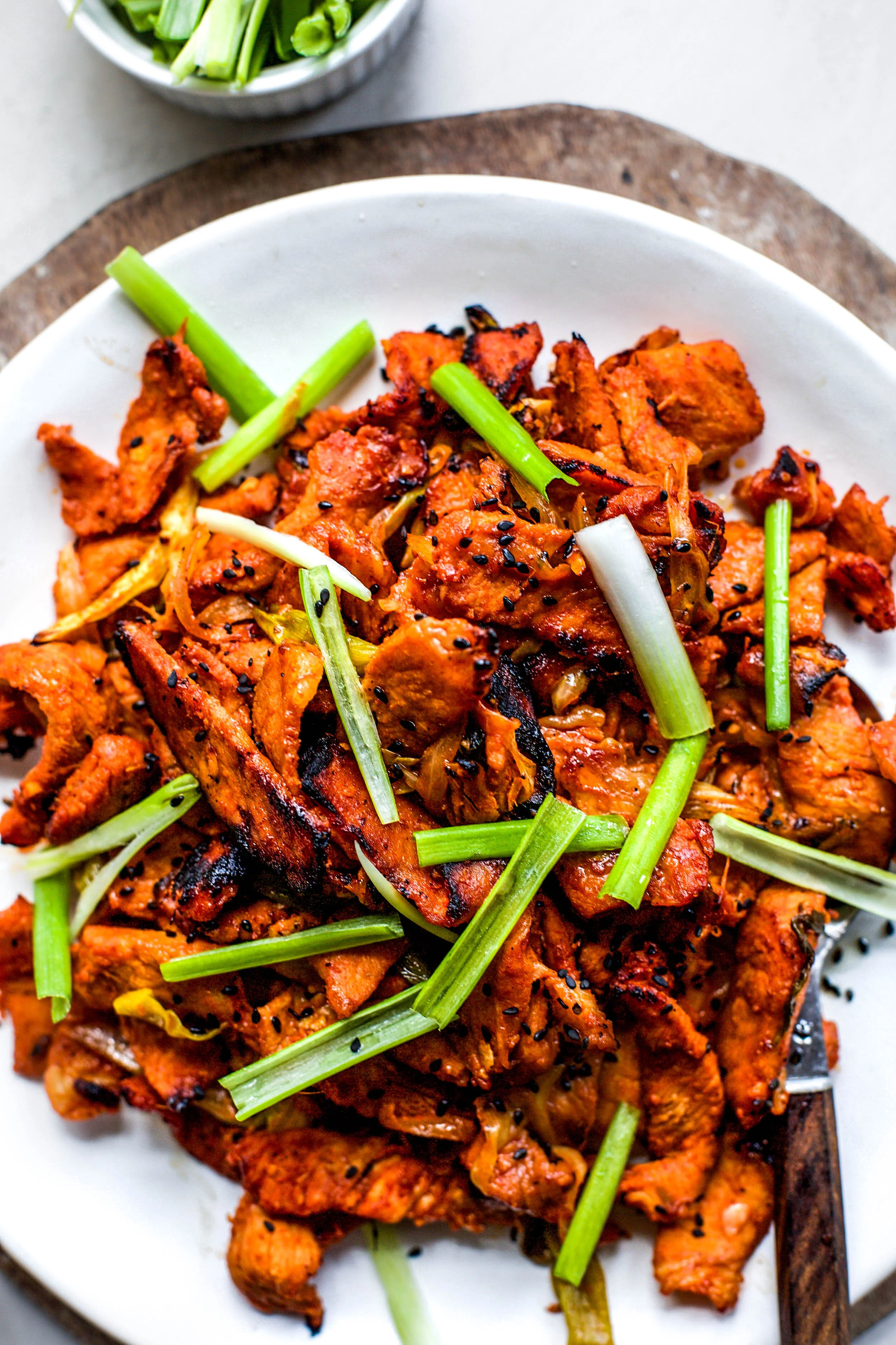 Add the onions to the meat and marinade and toss to combine. Marinate the meat and onions for at least 30 minutes, but up to a few hours in the refrigerator.