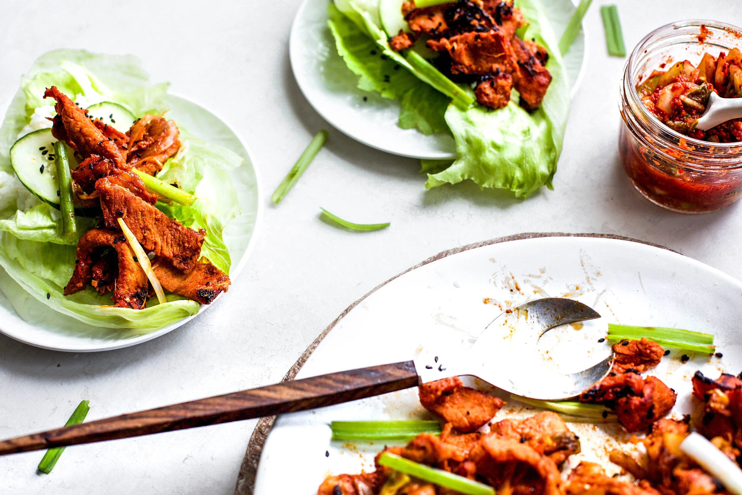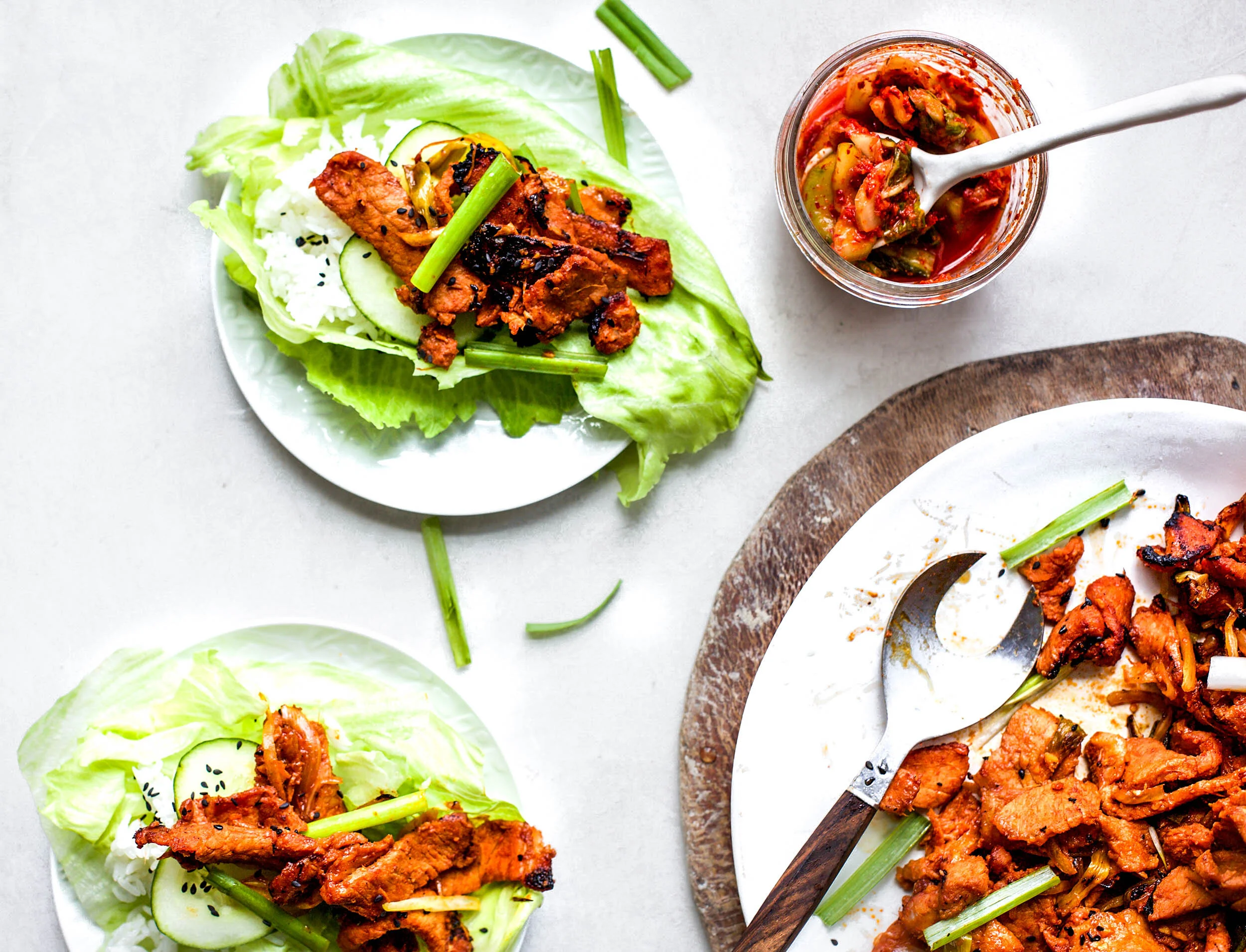 Lettuce wraps are one of those things that I love having almost weekly. There are so many possibilities for flavor combinations and I especially love using lettuce wraps with spicy food because of the crisp freshness that the lettuce gives the dish. While you are probably most familiar with Asian Chicken Lettuce wraps, I love using wraps in other recipes as well. Spicy Korean pork is one of those foods that has an undeniable flavor and is actually really easy to create at home too. These delicious grilled spicy Korean pork lettuce wraps are a great weeknight dinner option and will quickly become a favorite dish in your house.