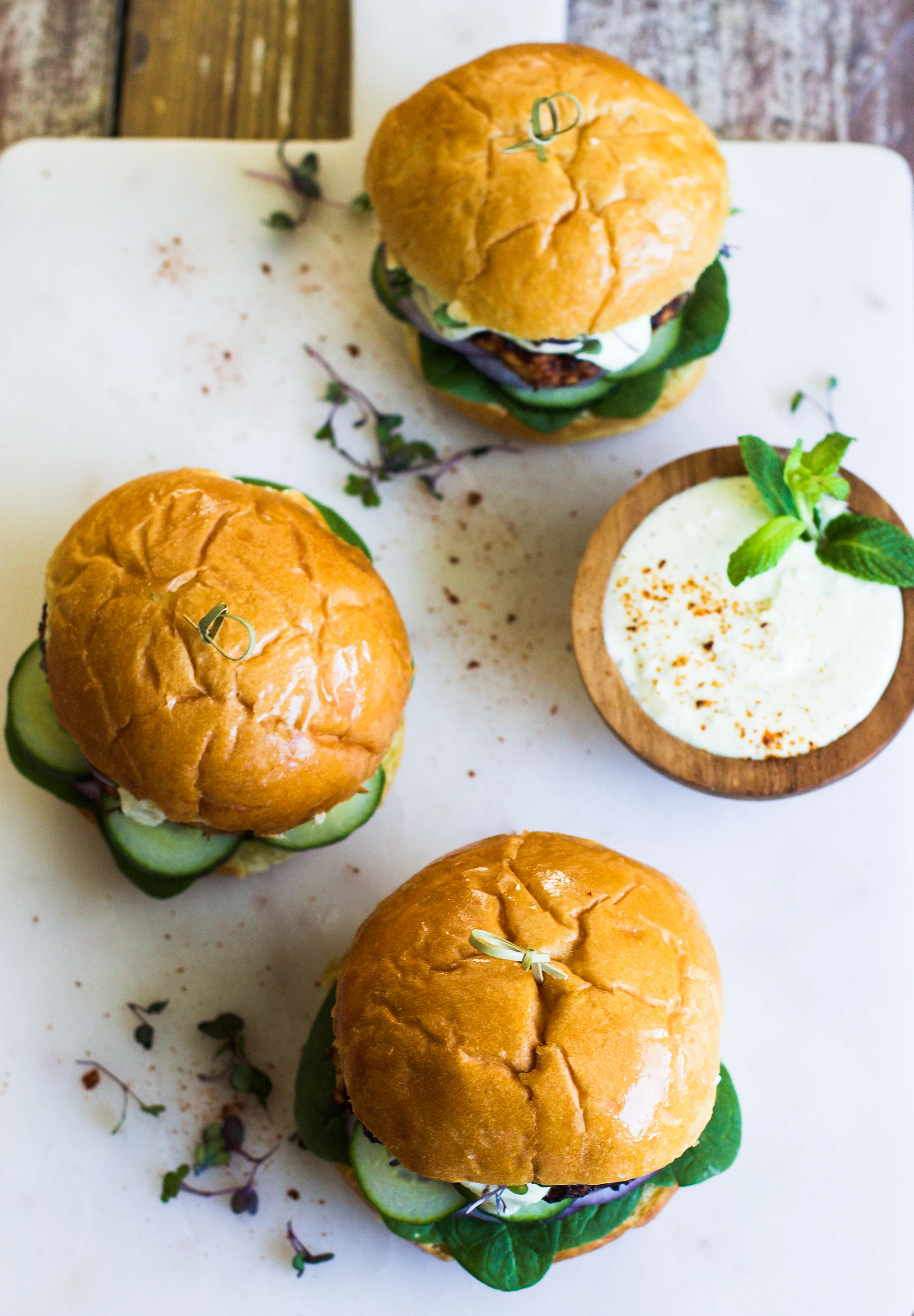 Harissa is a spice that combines smoky chili peppers, cumin, mint, garlic, coriander, and caraway and is found at most grocery stores these days. It's my favorite to use on chicken and fish specifically, and works perfectly with this burger combo! You get a nice (not hot) spice from the harissa in the chicken and that spice is balanced out so nicely with a cool citrus mint feta spread that is equally as delicious served as a dip for veggies and crackers too! Full disclosure, I totally ate on the leftover spread for days after we had these burgers! Top your burger with crispy lettuce, onions, and cucumbers and I'm telling you this burger is going to be a flavor bomb with every bite!