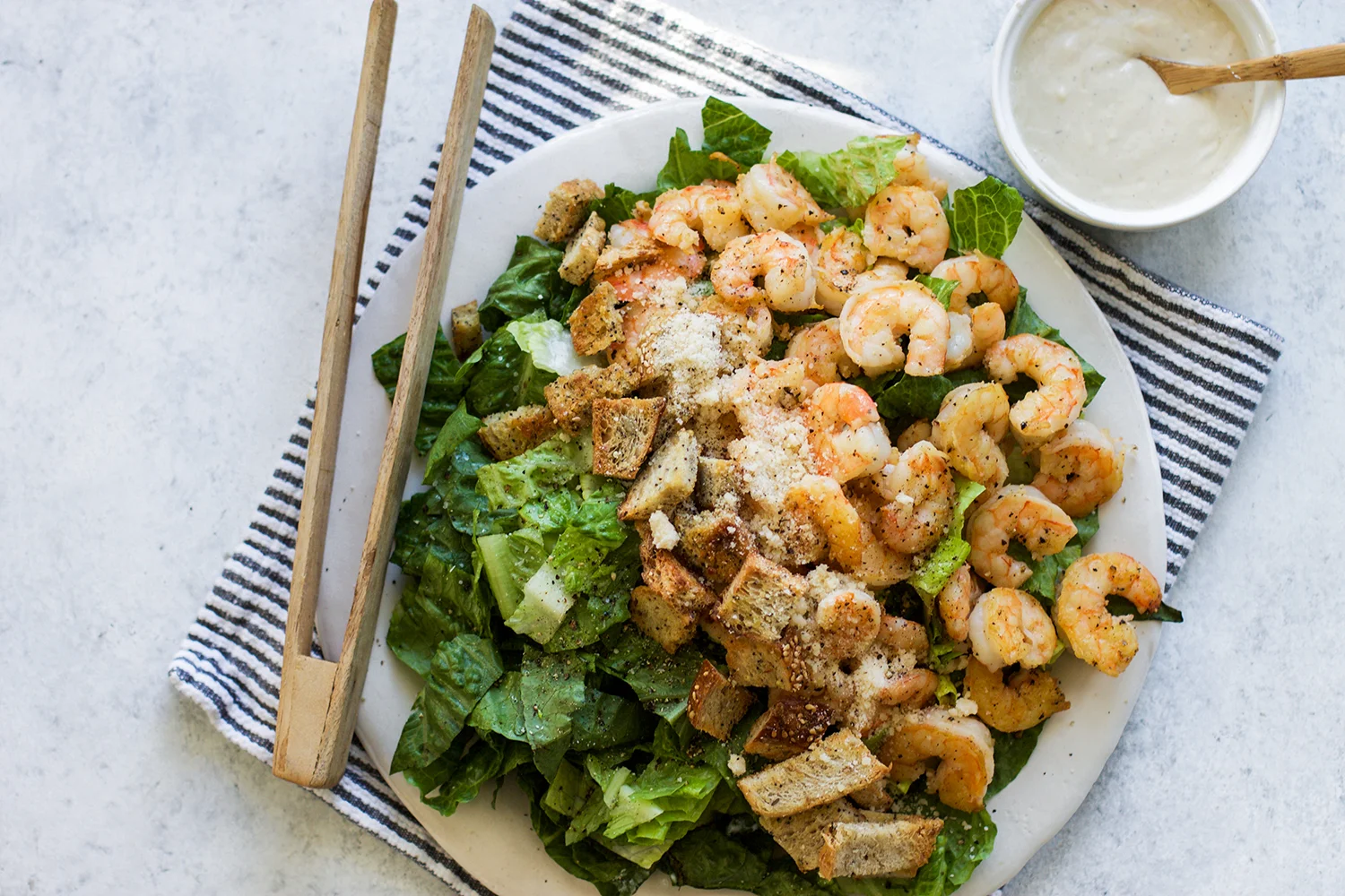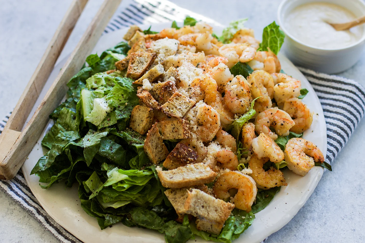 The weather went from crisp but perfectly warm Spring days to almost full on humid Summer heat in what seems like overnight! Lately the thoughts of turning my oven on make me cringe because I know my air conditioner doesn't need any more work added to it's heavy lifting as it is. And you know what, the worst is yet to come! Nevertheless, Summer heat means salads will be making it to our table a few times a week and one of my all time favorite salads just so happens to be a Caesar Salad! What I don't love is that usually when I order a Caesar salad out at a restaurant, I know that it can be super unhealthy and I might as well be eating a cheeseburger in most cases! That's why I love making my own version at home! Add my healthier shrimp Caesar salad to your weeknight routine and see just how easy it is to make right in your own kitchen!
