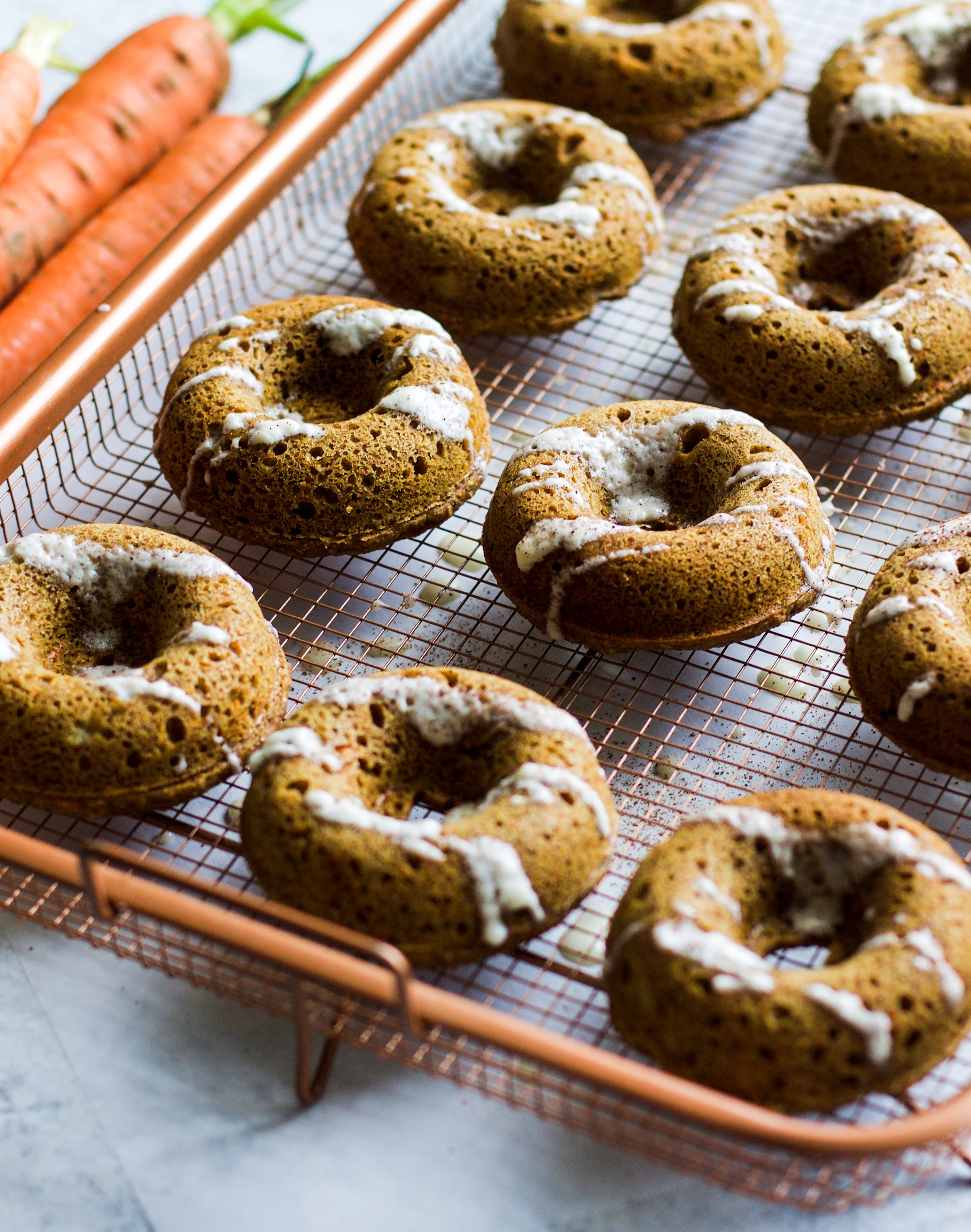 Somewhere along the way, my kiddo decided that he HAD to have a donut every time we were at the grocery store. I mean, I am all about a donut every now and then but y'all...I go to the grocery about 2 or 3 times a week! That is too many donuts for anyone in one week, especially because I try to limit the amount of sugar we get! So because of his new obsession with this very unhealthy food item, I decided to make us a healthier version at home! I love creating my own version of foods that are indulgent right in my own kitchen because I can control the ingredients! My healthy carrot cake donuts are perfect to make in advance for all week long and you can feel good about your family eating them!
