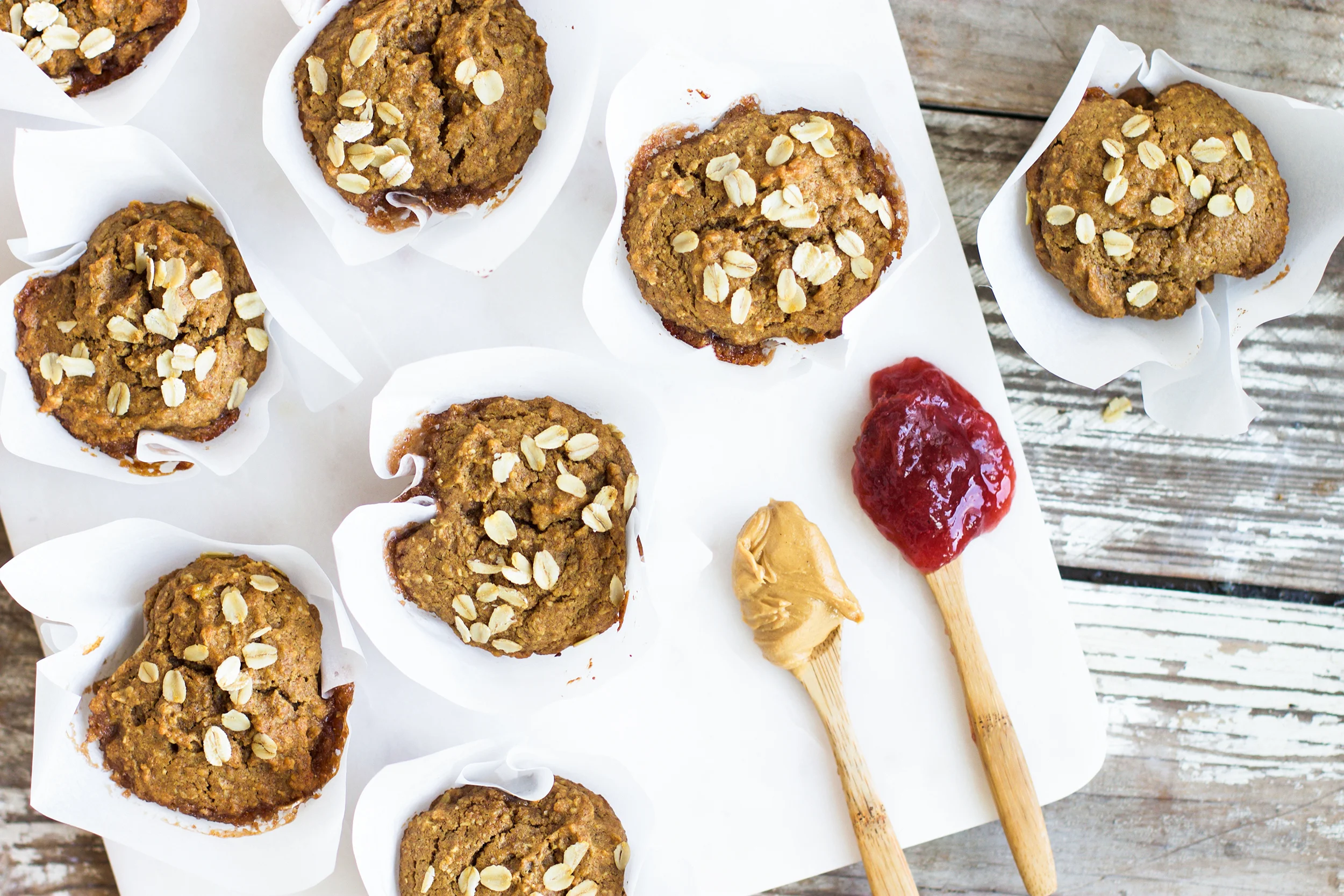Breakfast- Healthy PB&J Muffins —By Thursday mornings can get a little crazy, but no worries because you have a batch of these delicious muffins to take on the go for breakfast!