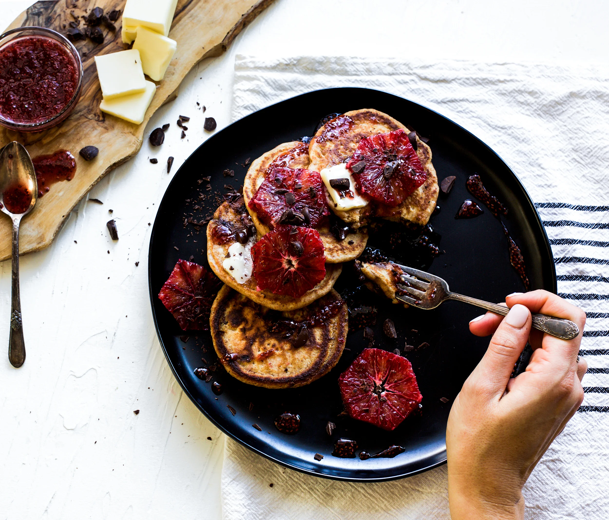 Breakfast- Dark Chocolate Chip Pancakes with Blood Orange Chia Syrup + Chicken Sausage—These pancakes are decadent but still on the healthy side and the best part is you can save the leftovers to eat on all weekend!