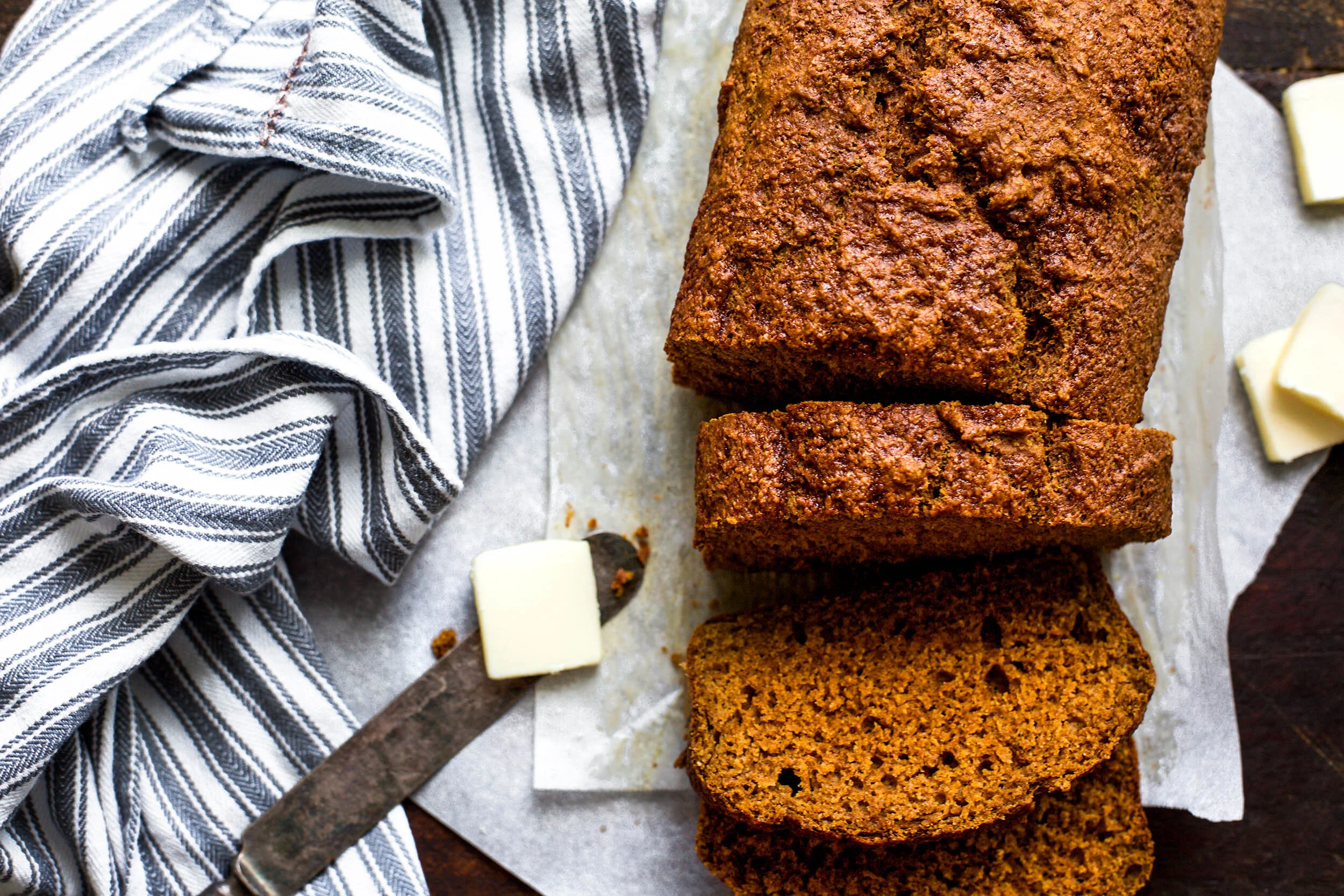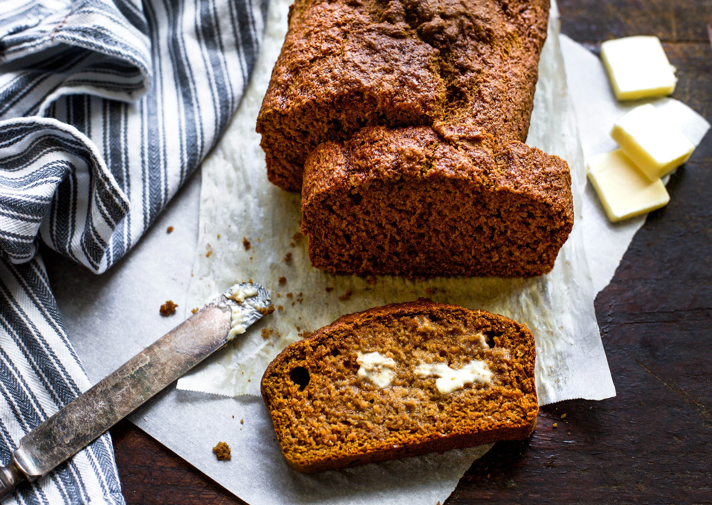 Line bread pan with parchment paper or spray with nonstick.