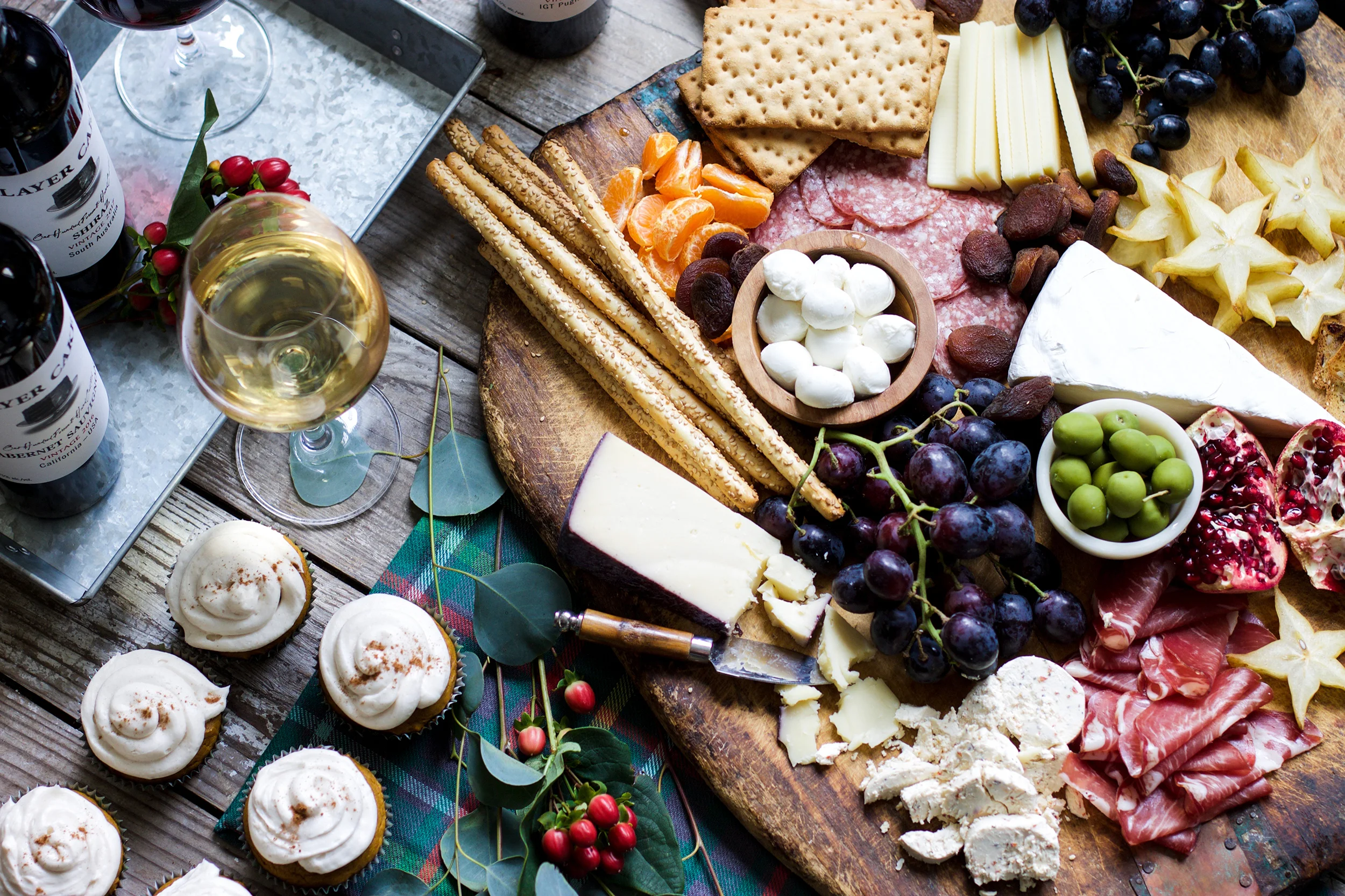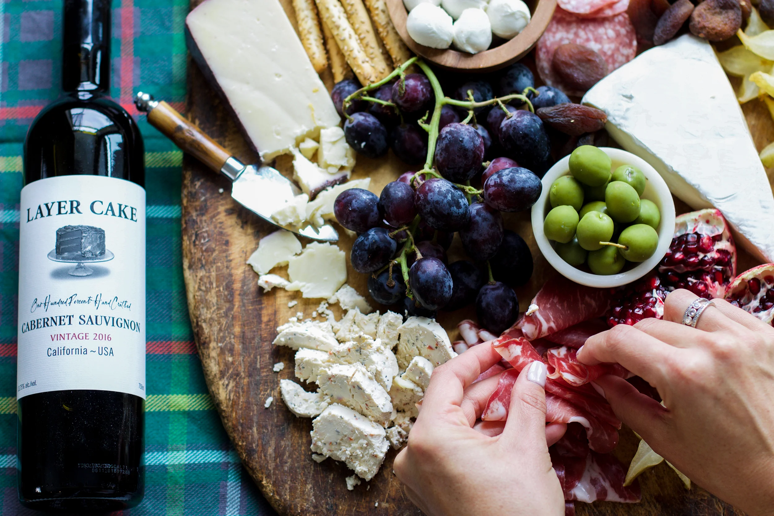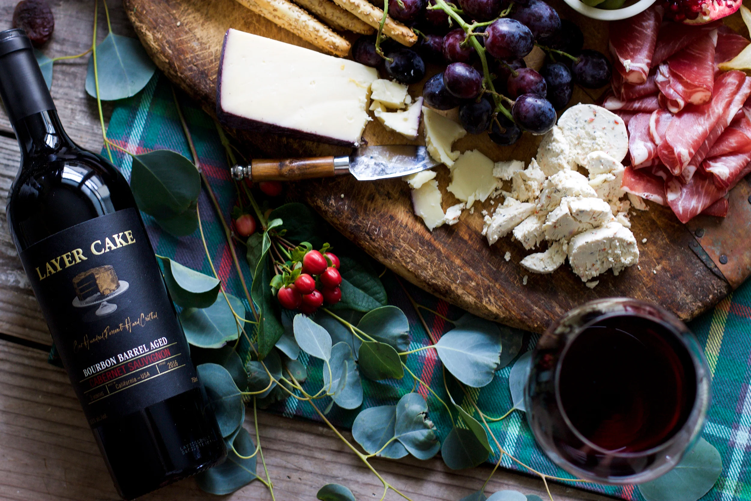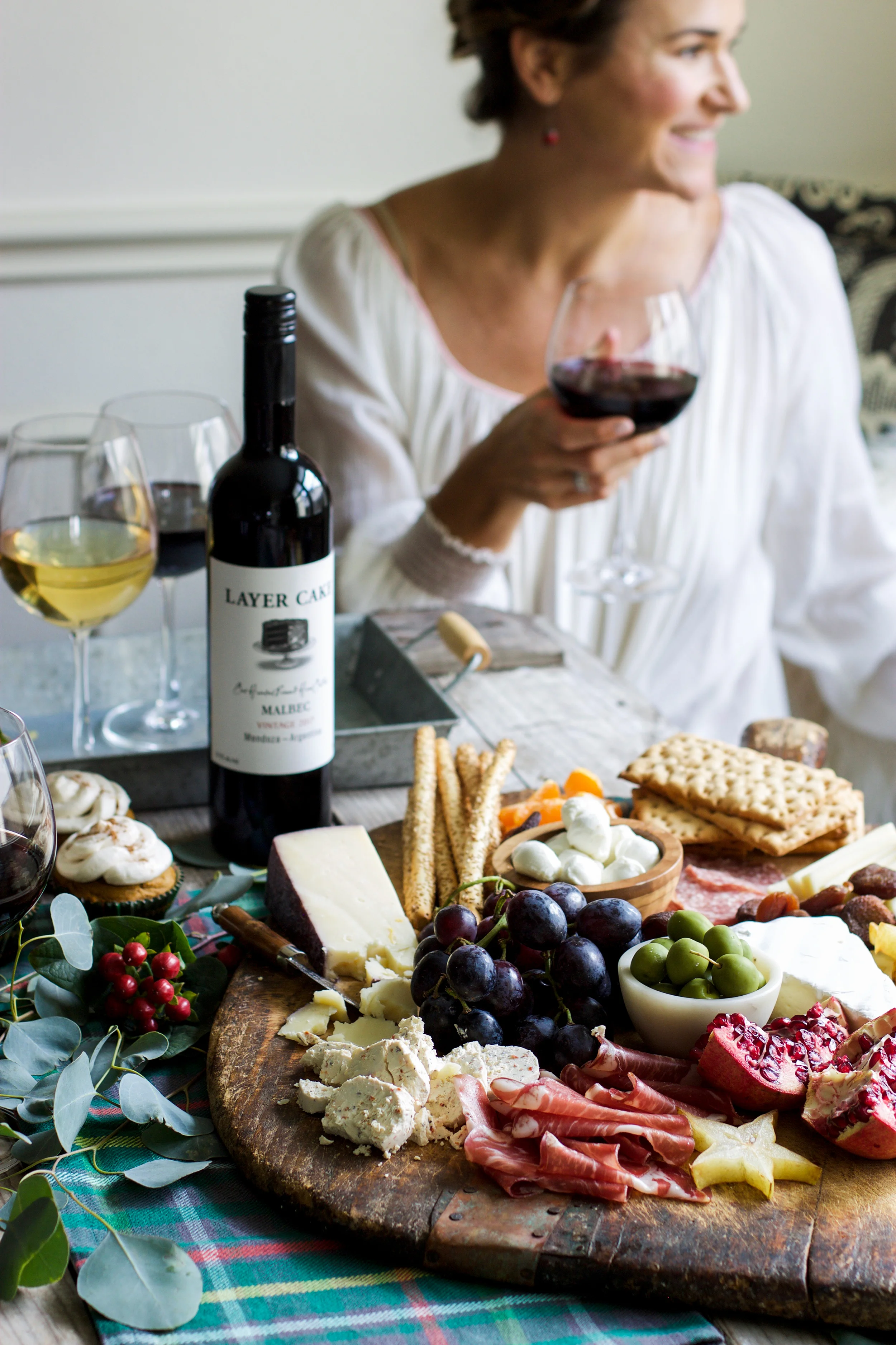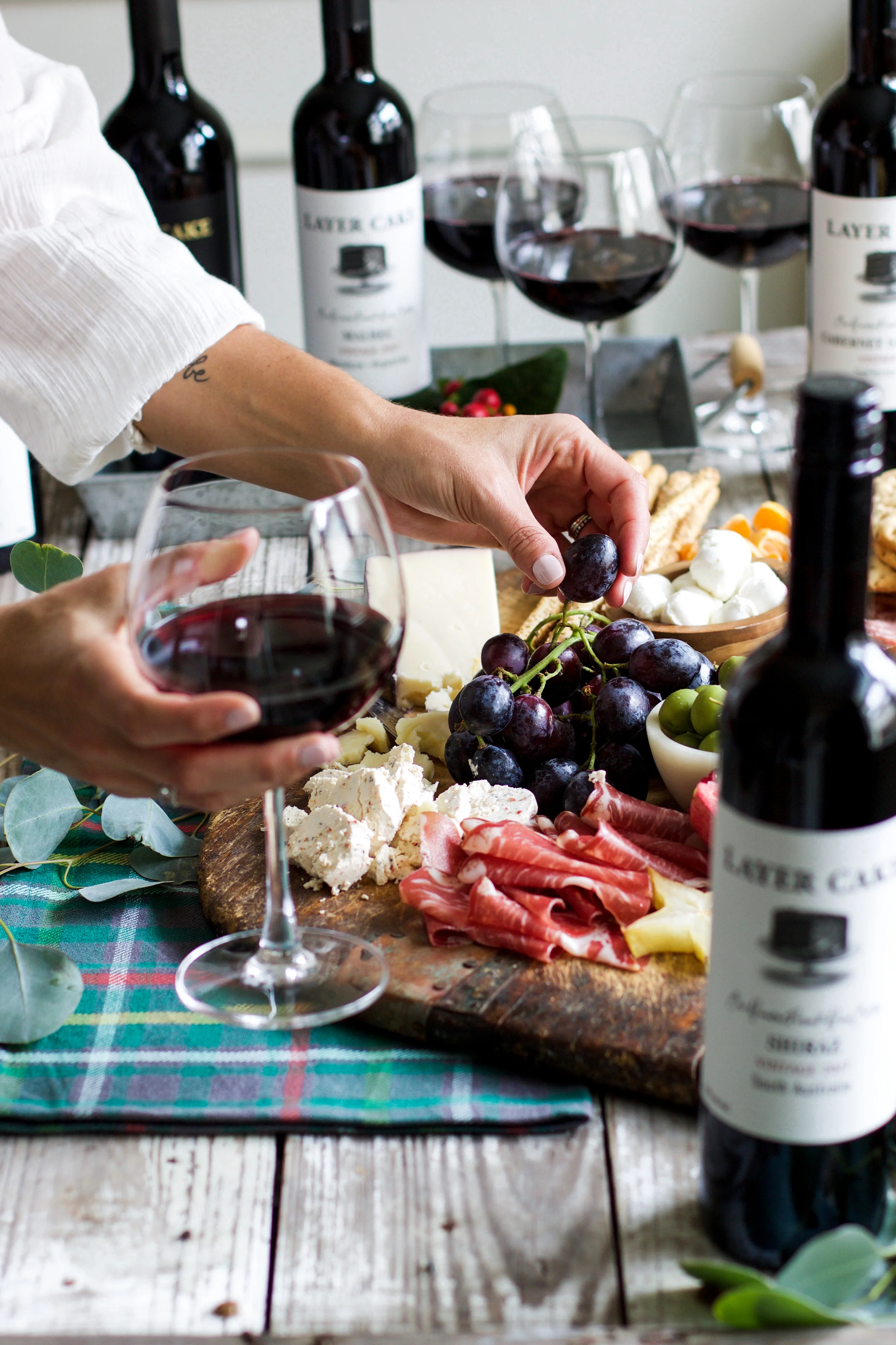 Set the table. Go ahead and set out wine glasses, the linens, and figure out where your cheeseboard and main platters will go, etc. The day of, you can add some fresh cut flowers, candles, and a variety of Layer Cake wines along with the food that has already been prepped!