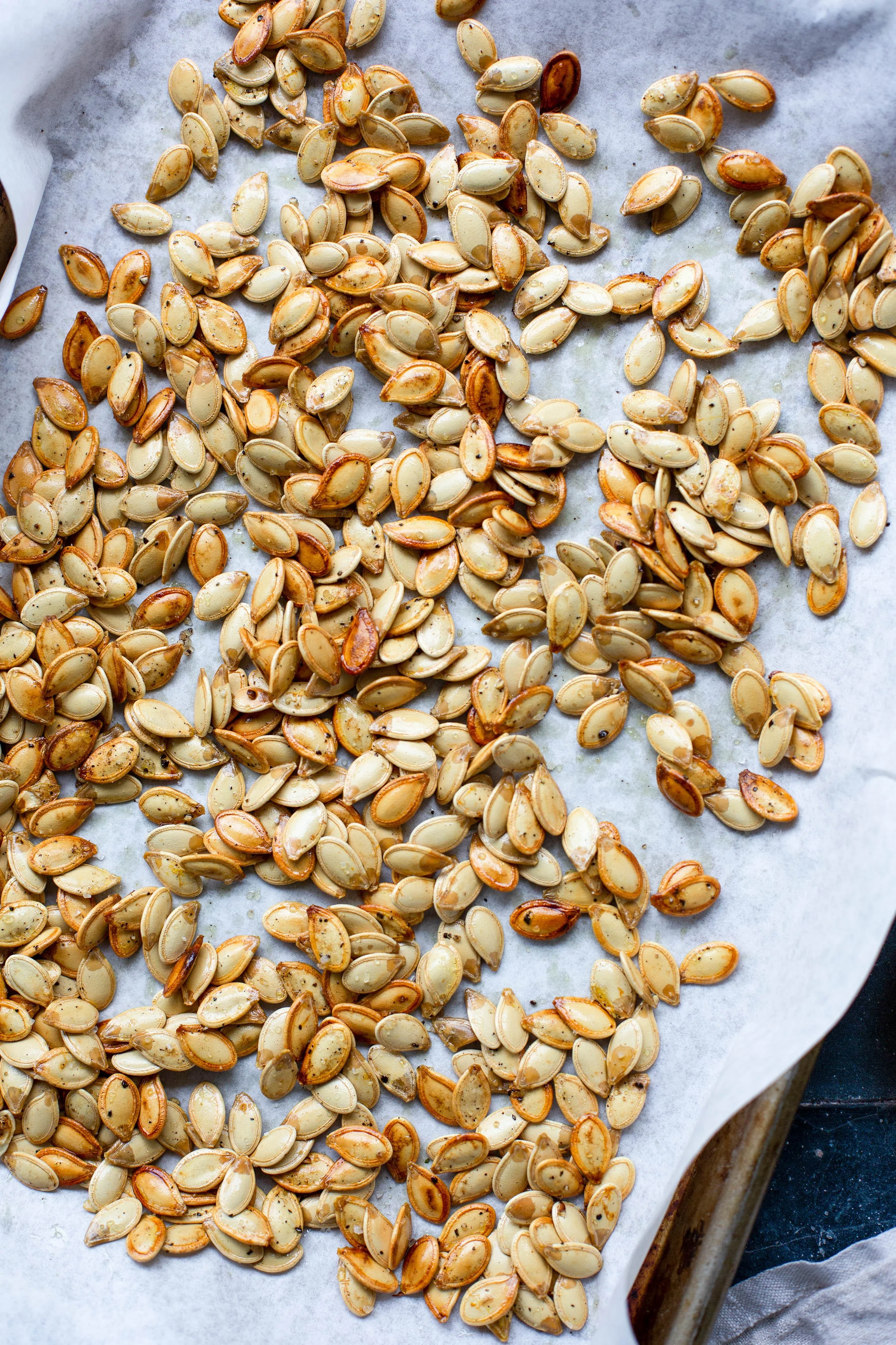 Get creative here, there are so many possibilities for seasonings that you truly can’t go wrong. Make sure you stay close by when the pumpkin seeds are cooking as they can burn easily if you aren’t watching them closely. I like to toss the pumpkin seeds on salads, yogurt bowls, oatmeal, and even toast if I am not just grabbing a handful to snack on. They are so good and full of iron, magnesium, and healthy fats making them an ideal snack to keep on hand during the season.
