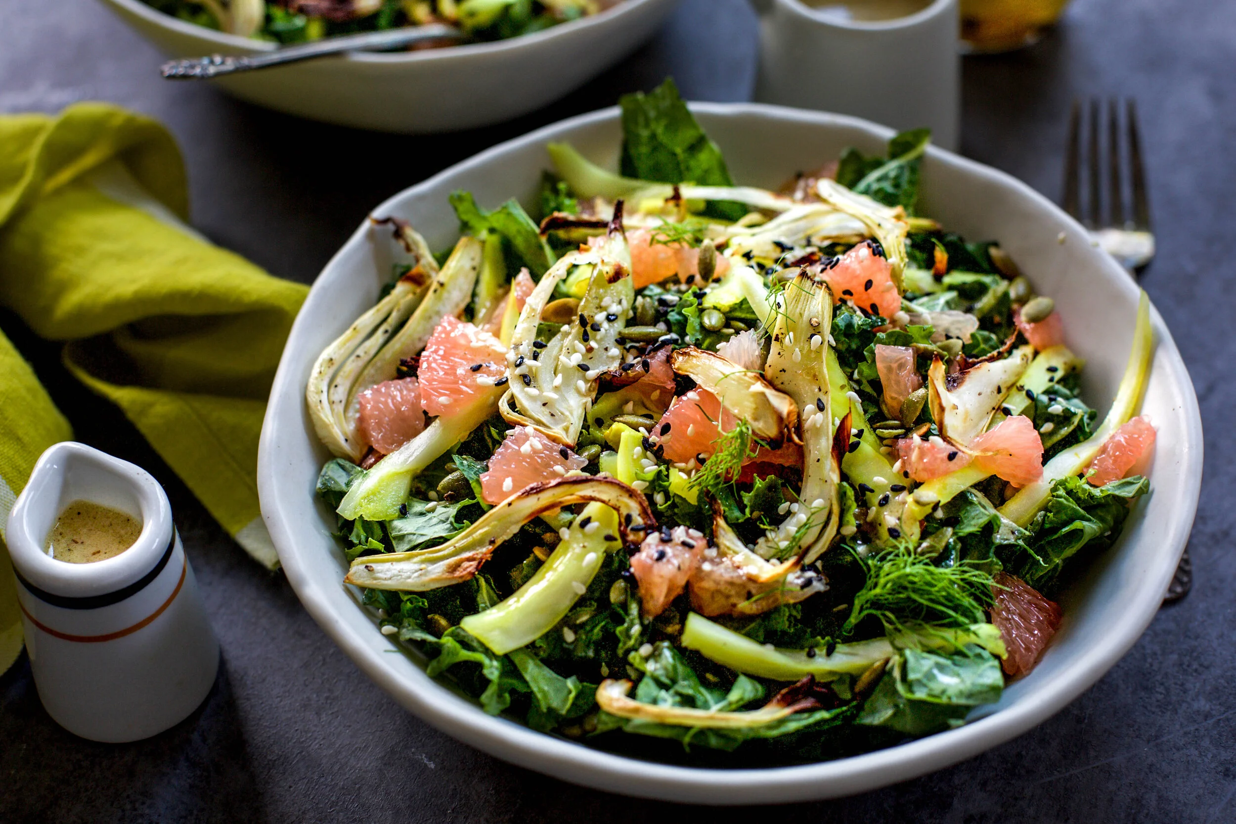 Do you cook with fennel? It’s a vegetable that has a licorice taste to it when eaten raw, but when roasted gets sweet and caramelized and its down right addicting. I happen to love it personally, so I added it two different ways on this salad. I pickled the fennel and roasted it too giving this kale salad two major flavor bombs that are SO good. I added some fresh grapefruit sections and crunchy sesame and pepita seeds to truly give you the best of flavor and texture with every bite.
