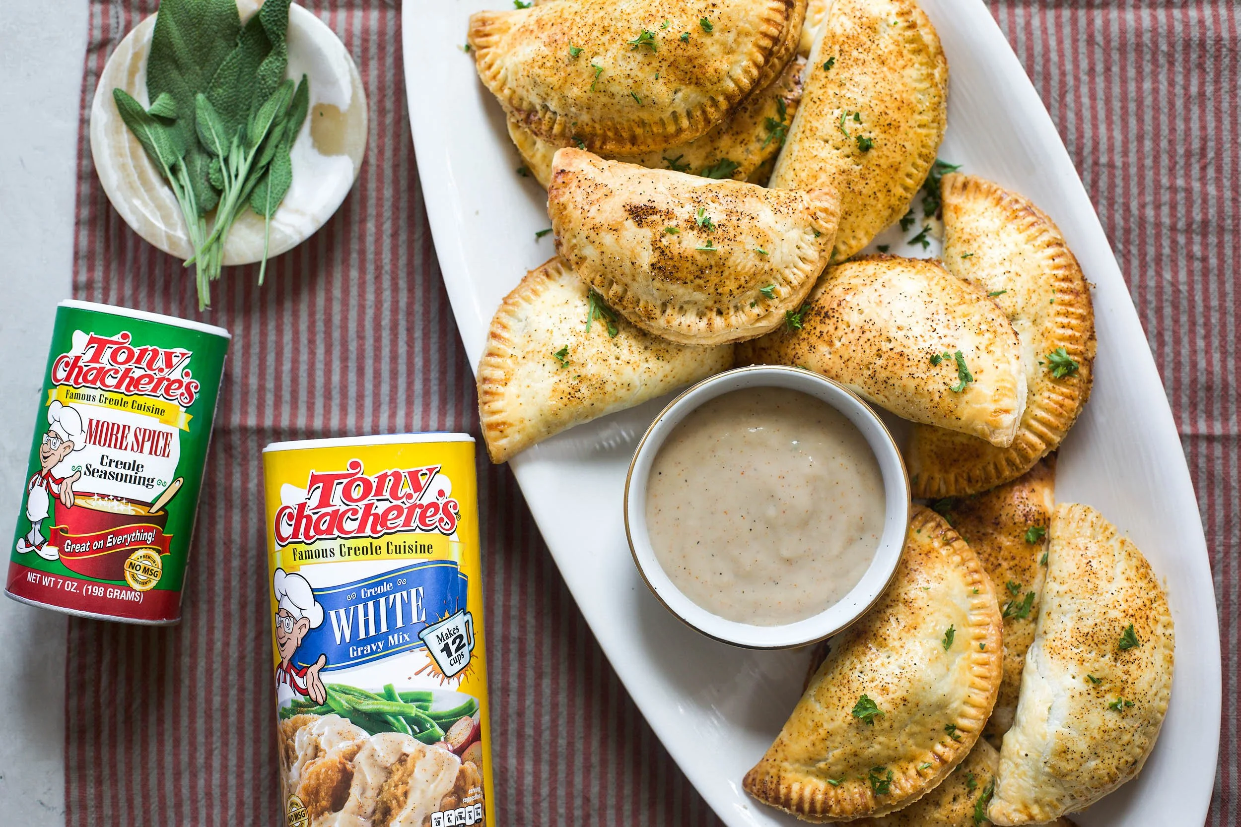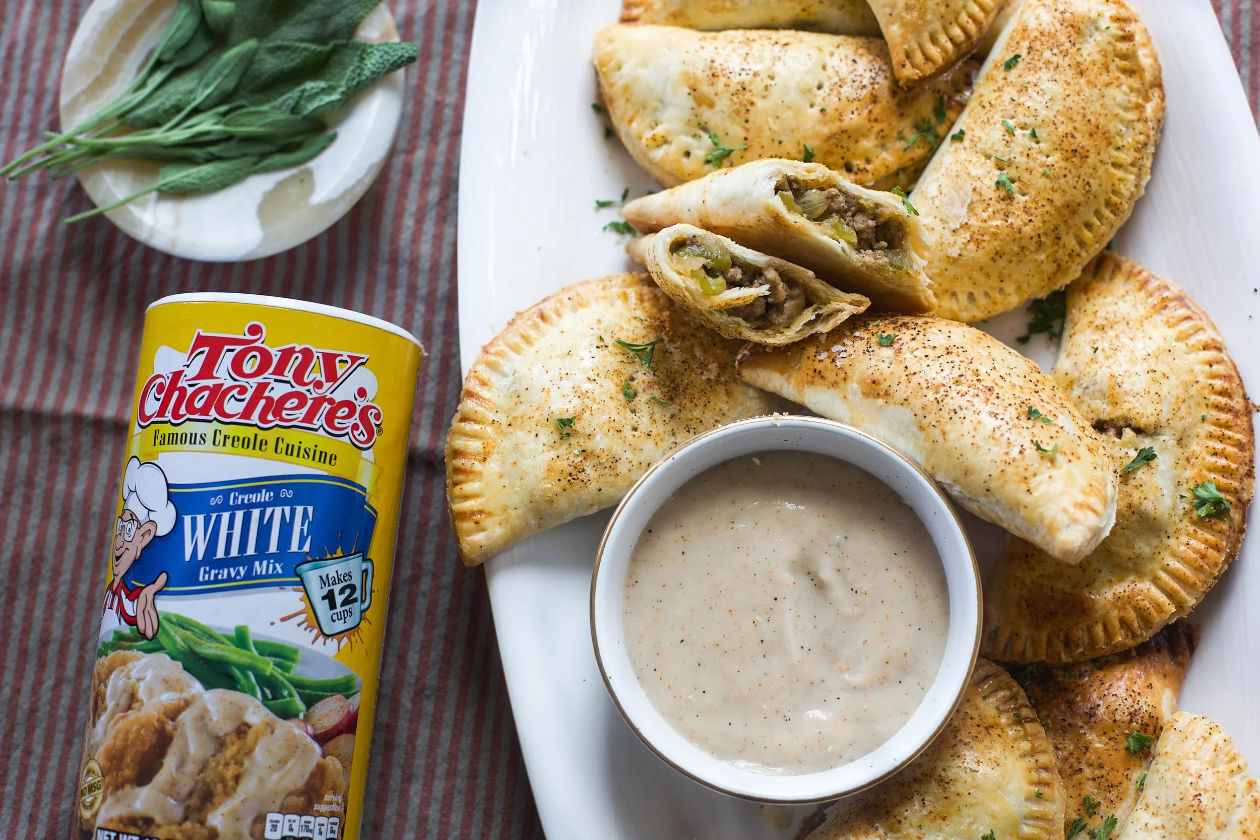 Meat pies originated in Natchitoches in northern Louisiana and is one of the traditional state foods that is basically a savory meat filling stuffed into pie dough and baked or fried until golden and delicious. They are perfect for serving up as an appetizer or alongside any holiday mains you might be having. I like to make a sage infused white gravy using Tony Chachere’s Creole White Gravy mix which makes the perfect meat pie dipping sauce to serve alongside your platter of meat pies.