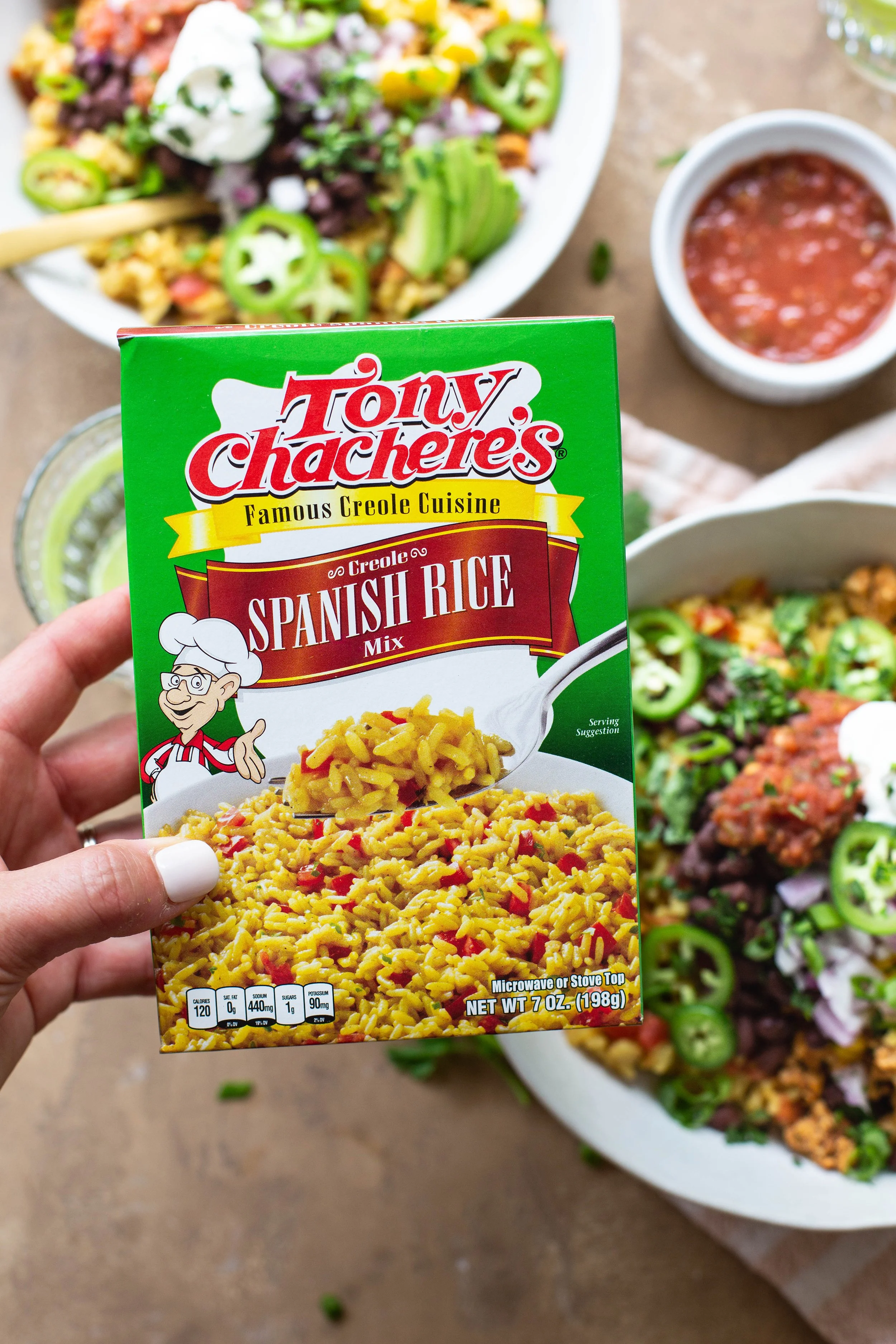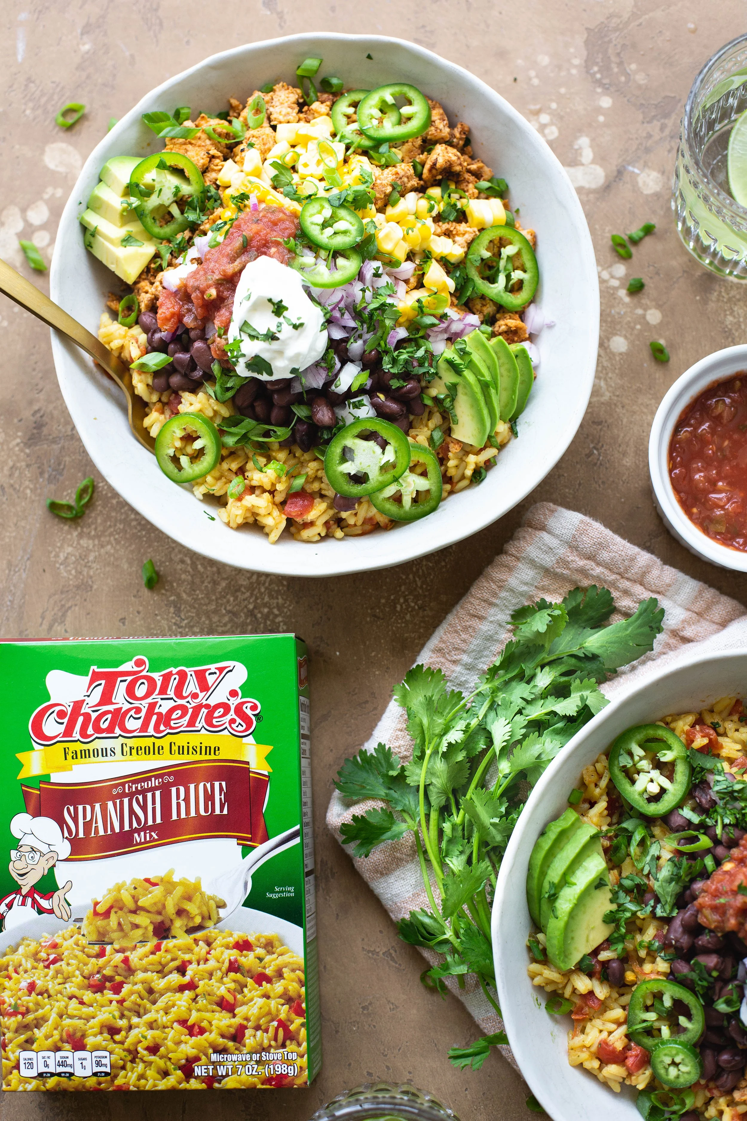 Mexican ground chicken and rice bowls are going to quickly become your new favorite weeknight meal. These bowls are packed with protein and flavor and are simple to meal prep or whip up any night of the week. I partnered with my friends at Tony Chachere’s to create these bowls using their Spanish Rice Dinner Mix that creates the perfect base for the ground chicken and toppings. These Mexican ground chicken and rice bowls are a family-friendly meal that you will want on your regular dinner rotation.