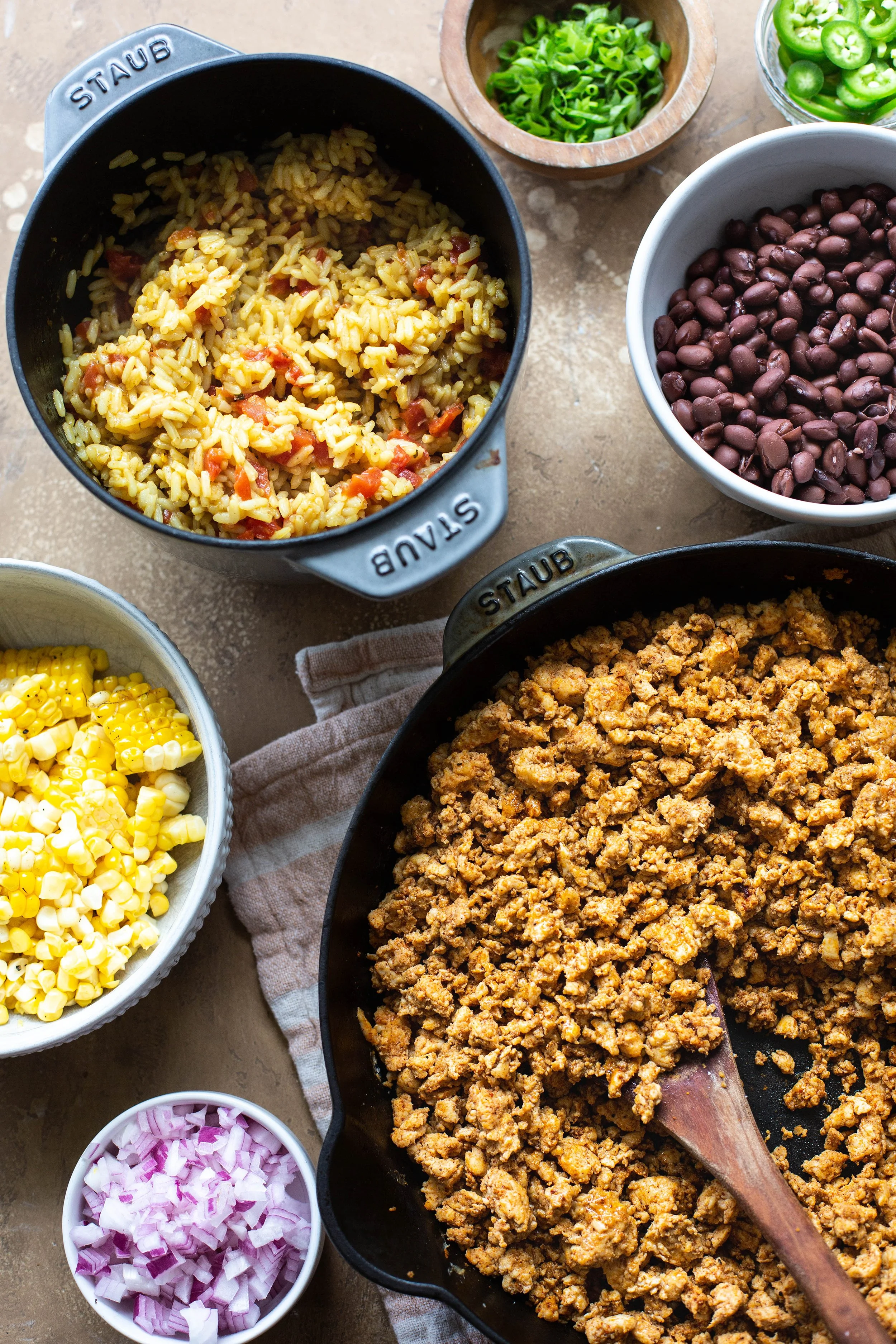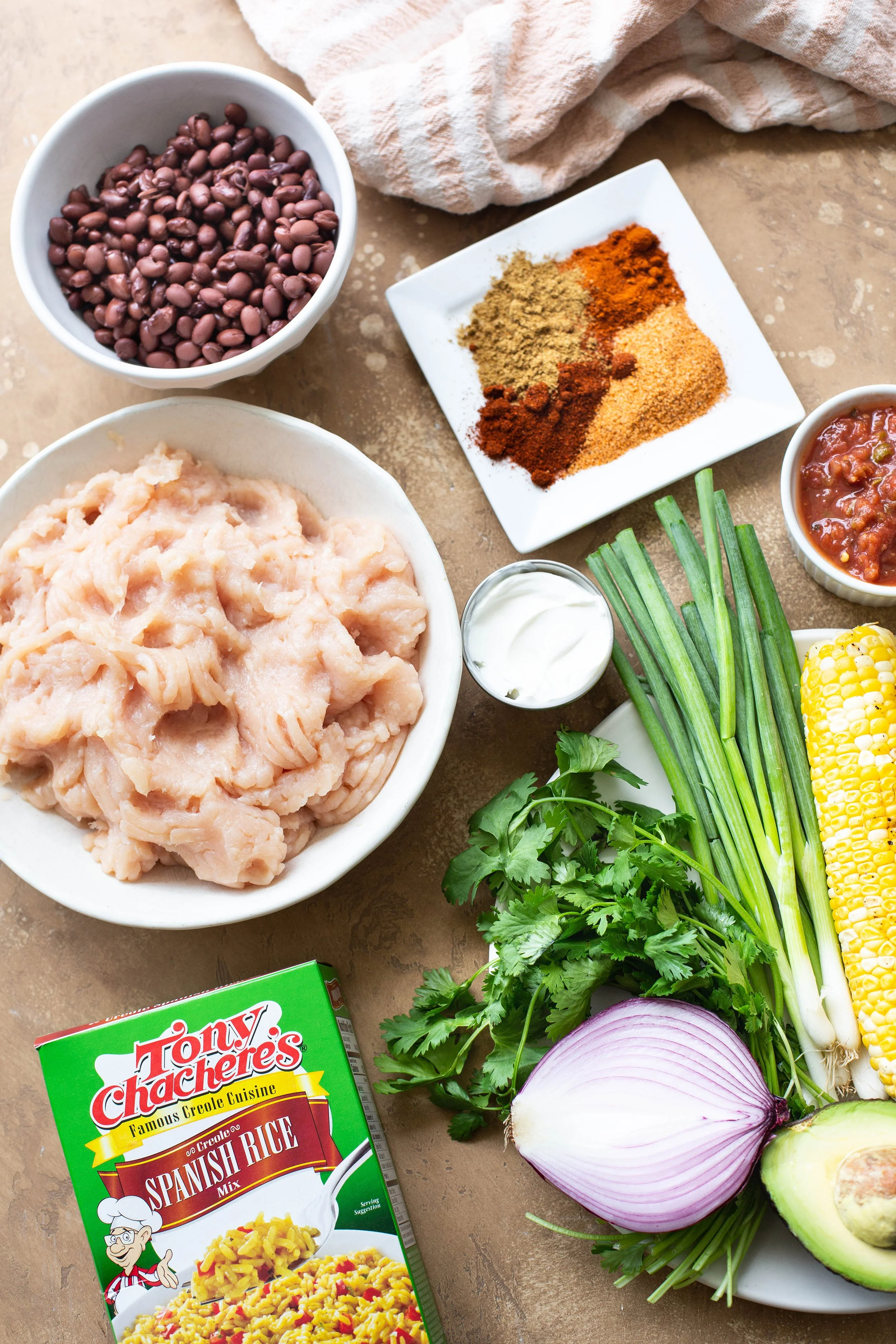 I like to use ground chicken here, but you could easily swap out the chicken for turkey or beef if you prefer. I season it up with some spices while the Tony Chachere’s Spanish Rice Mix cooks up and prep all of my toppings at the same time. The meat and rice could definitely be meal prepped ahead of time and stored in the refrigerator and then simply prep any fresh toppings right before serving.