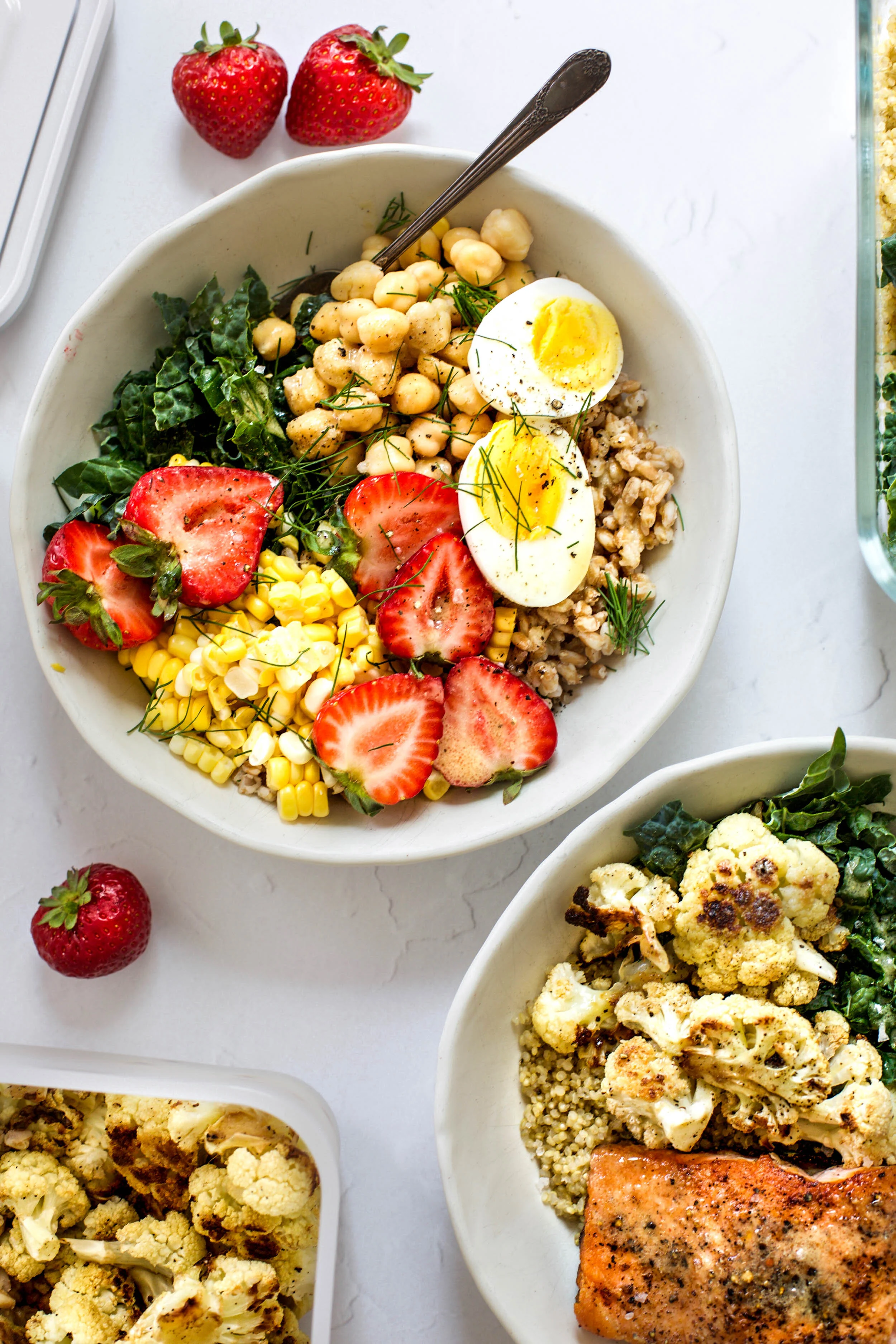For these bowls there is really no right or wrong mix here. I personally love to cook up a few different grains like quinoa, farro, or even some pasta and then also like to cook up some proteins like salmon, chicken, and eggs, and I also make sure to roast some veggies to go into the mix as well. I also cut up some fresh fruit to throw into a bowl if I am feeling in the mood for it. Truly the options are endless.