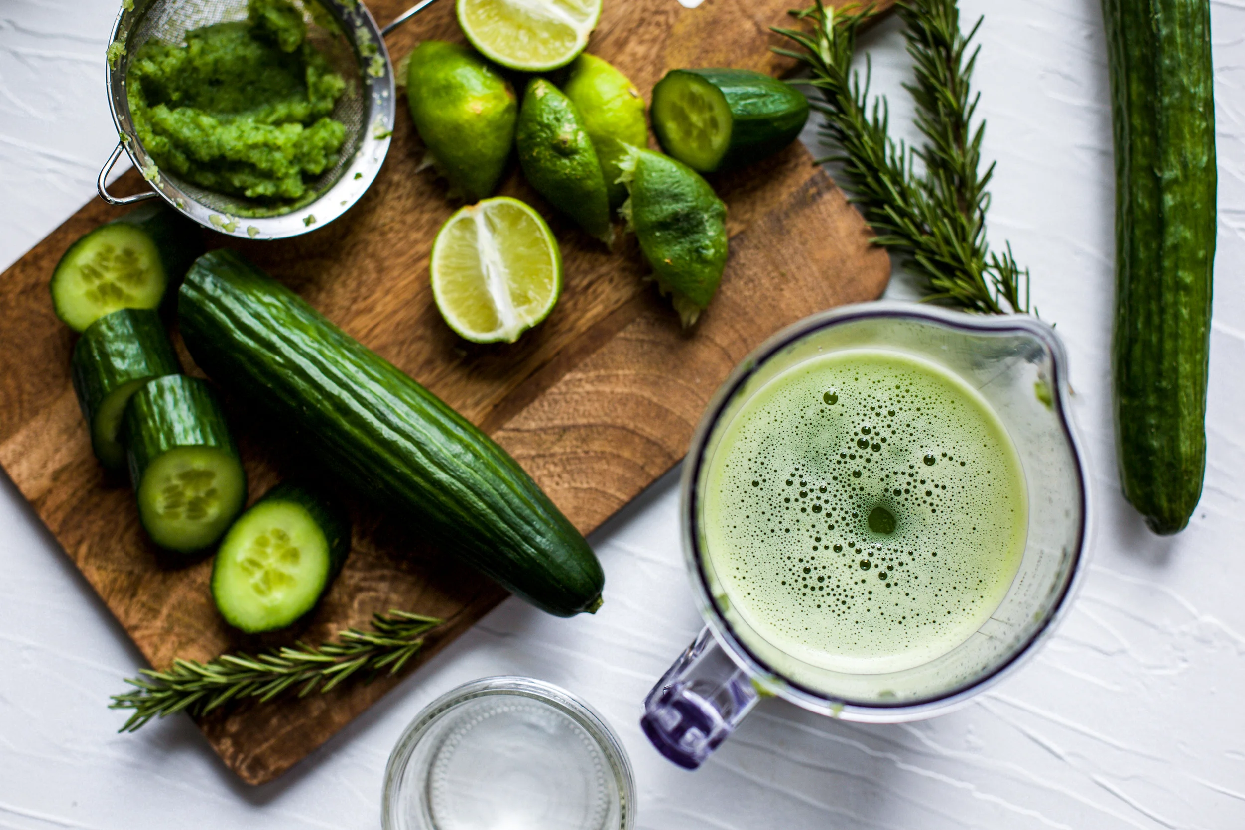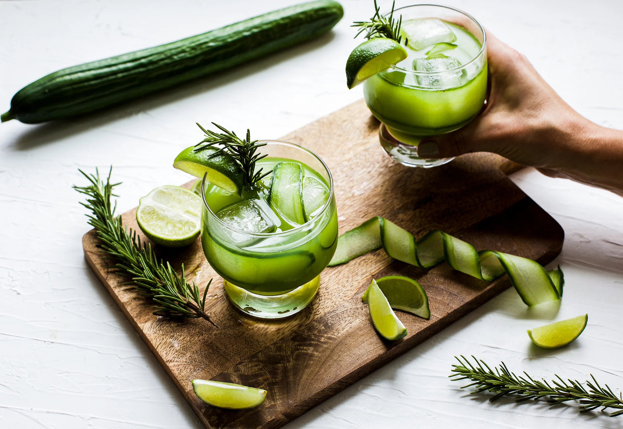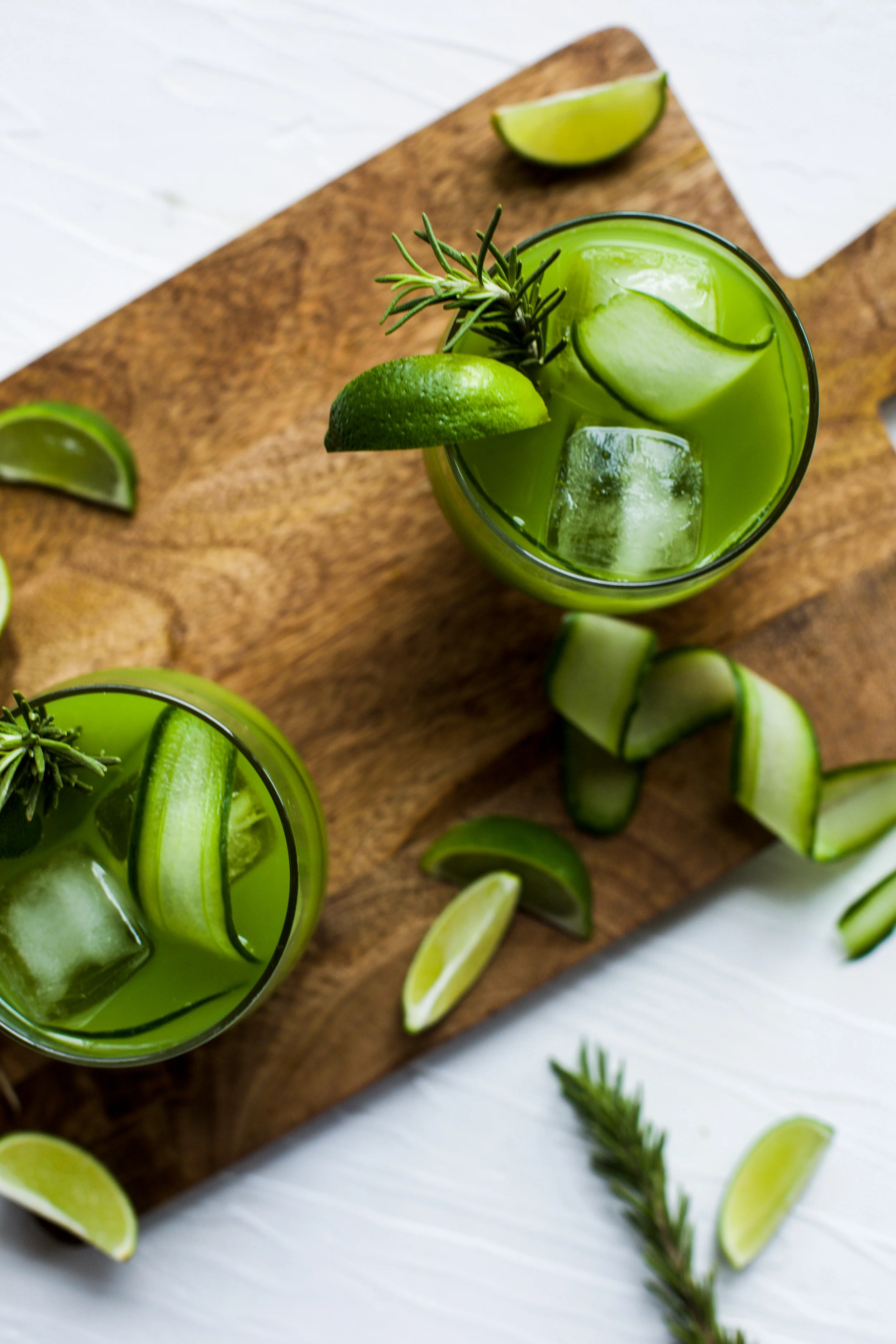 Garnish with fresh limes, rosemary, and cucumber slices.