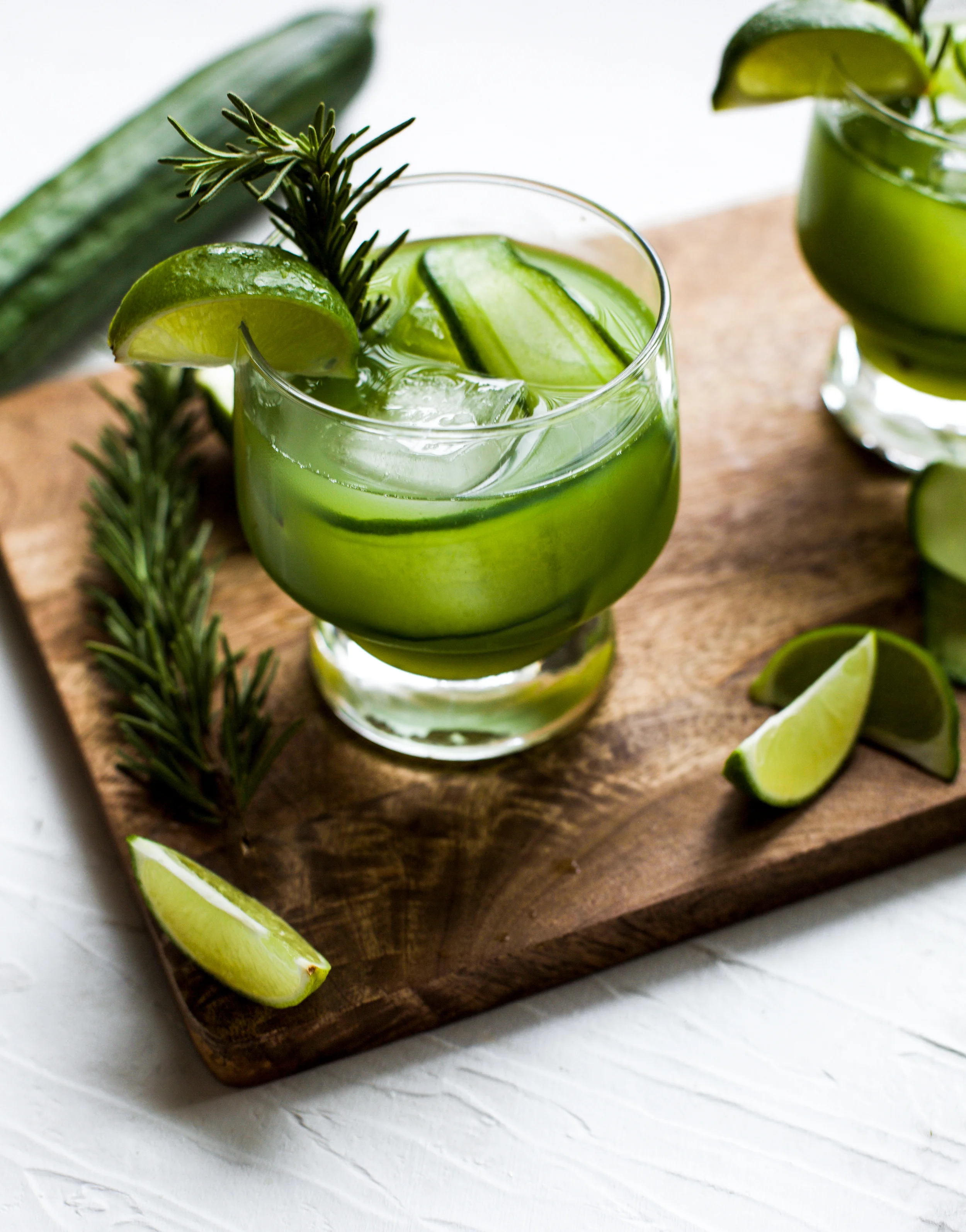 While you are enjoying the company of your family and friends, ring in the New Year with one of my Cucumber Rosemary Gimlets made with Village Farms Luscious Seedless Long English Cucumber® and skip the sugary champagne this year! This cocktail is mixed up with delicious fresh cucumber juice, lime juice, gin, and a rosemary simple syrup and just so happens to be as stunning as it is delicious! You will love this healthier cocktail swap and you can be sure your guests will too!