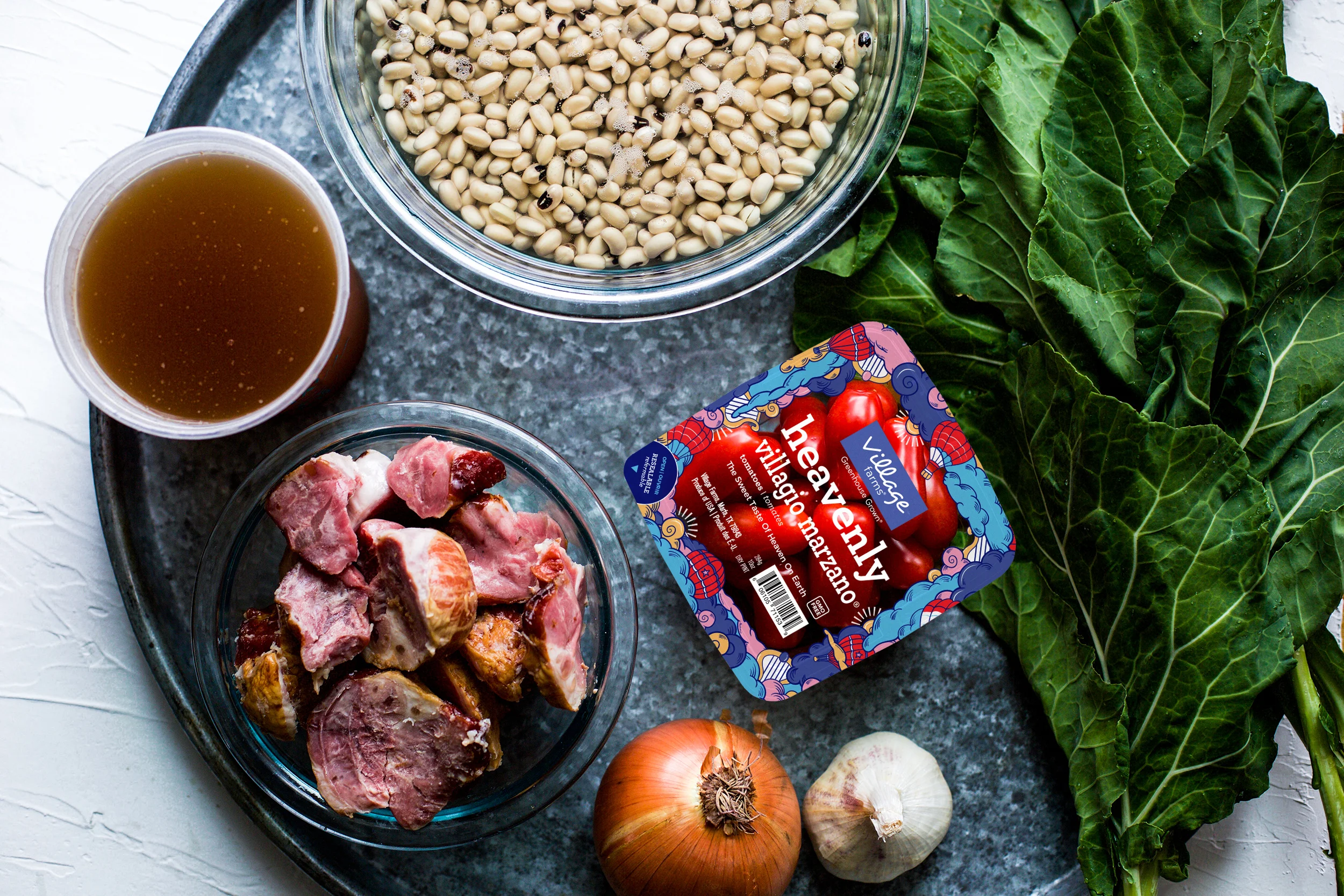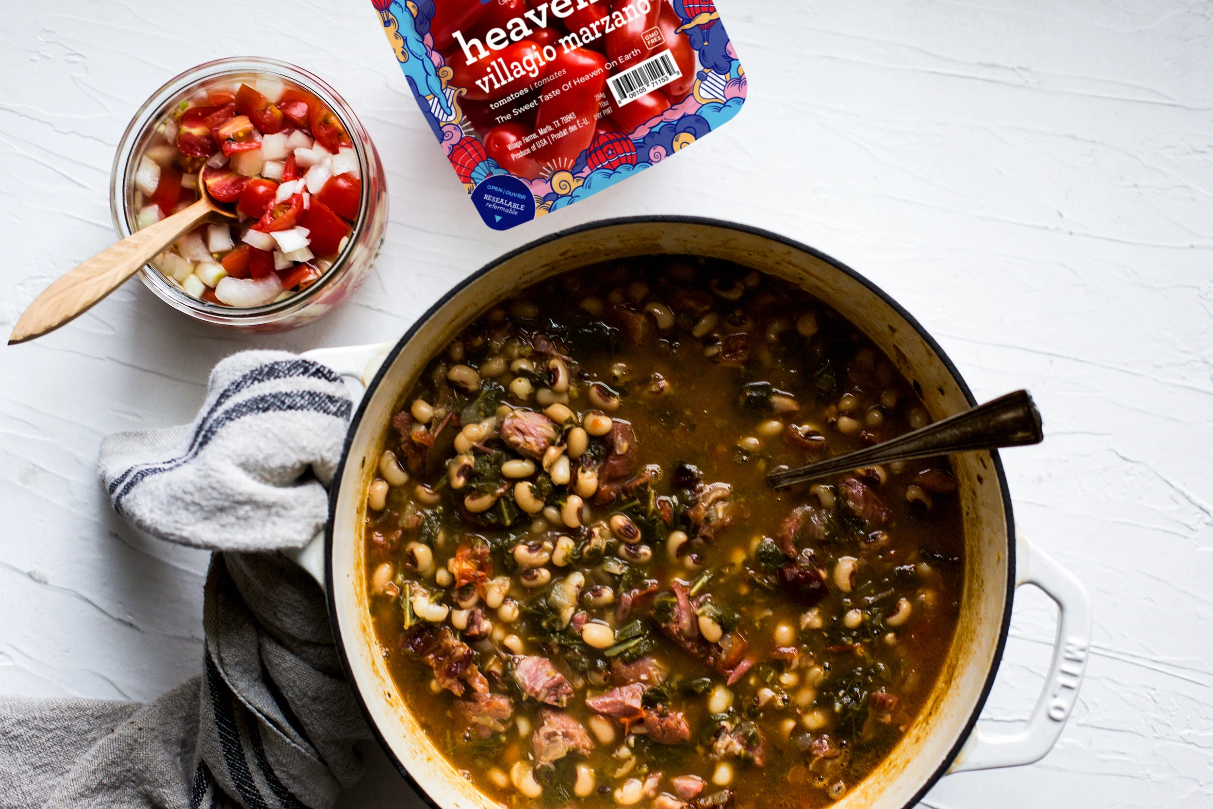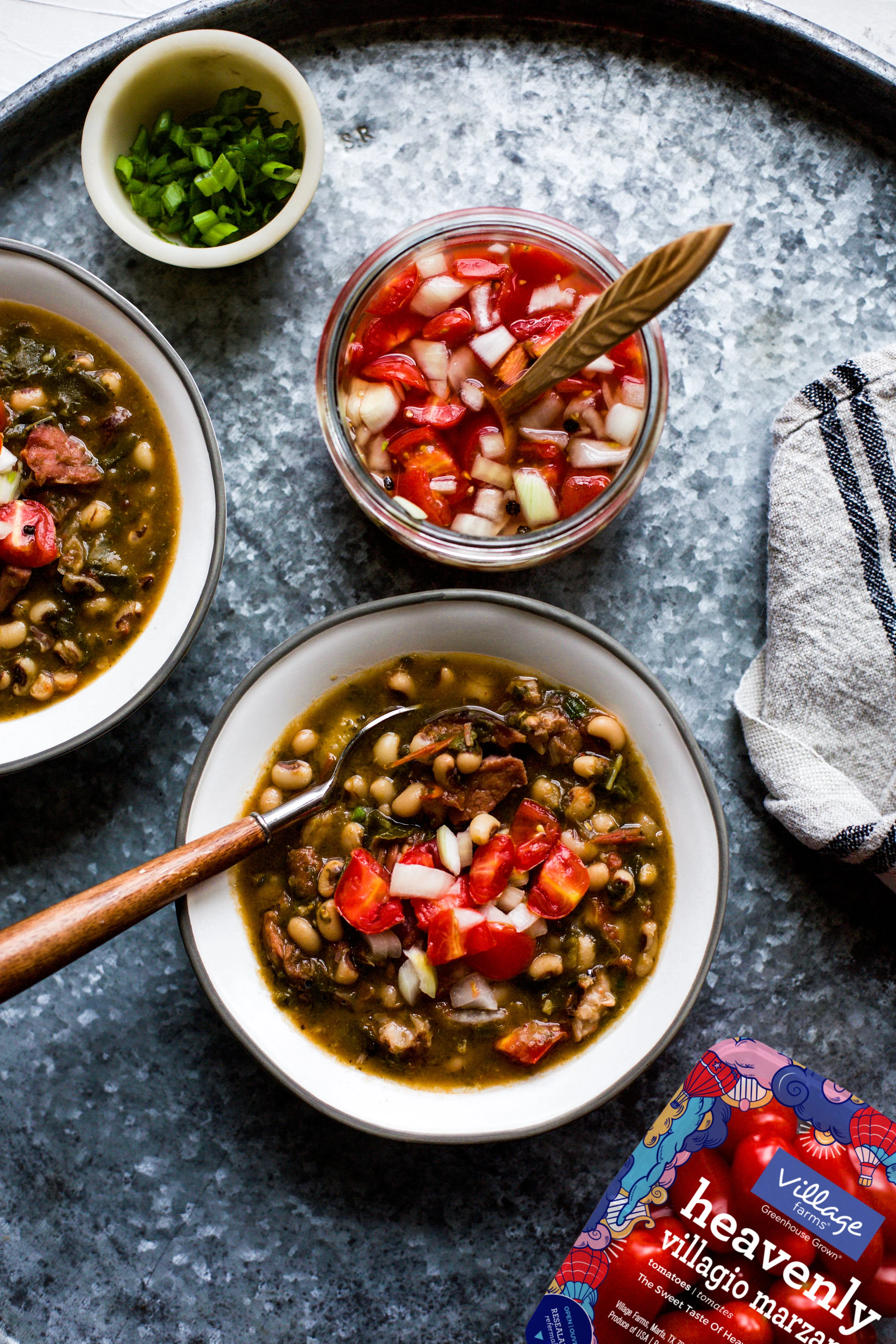 The next day you can recover from a possible rowdy evening with my hearty Black Eyed Pea Stew, made extra special with Village Farms Heavenly Villagio Marzano® tomatoes mixed right in and used in a tangy tomato relish topping. This will be your new favorite way to embrace tradition! In Texas, we believe that on New Year’s Day you should eat ham, black eyed peas, and greens for a little luck and this dish combines all of those components into one easy and tasty dish!