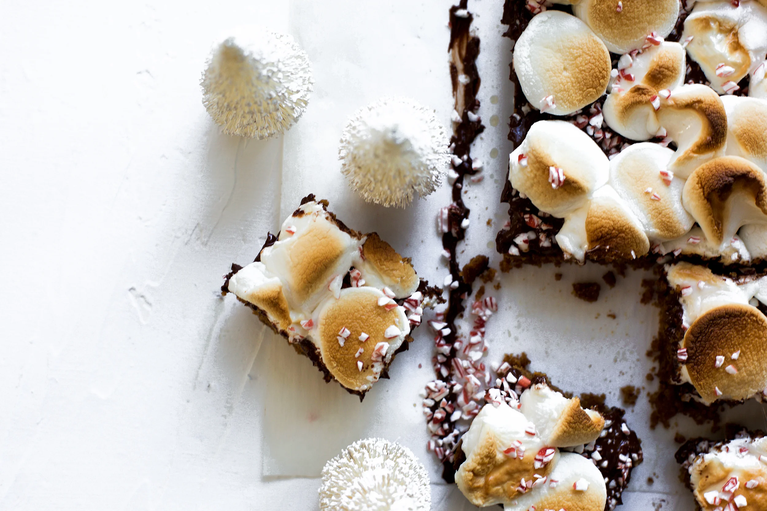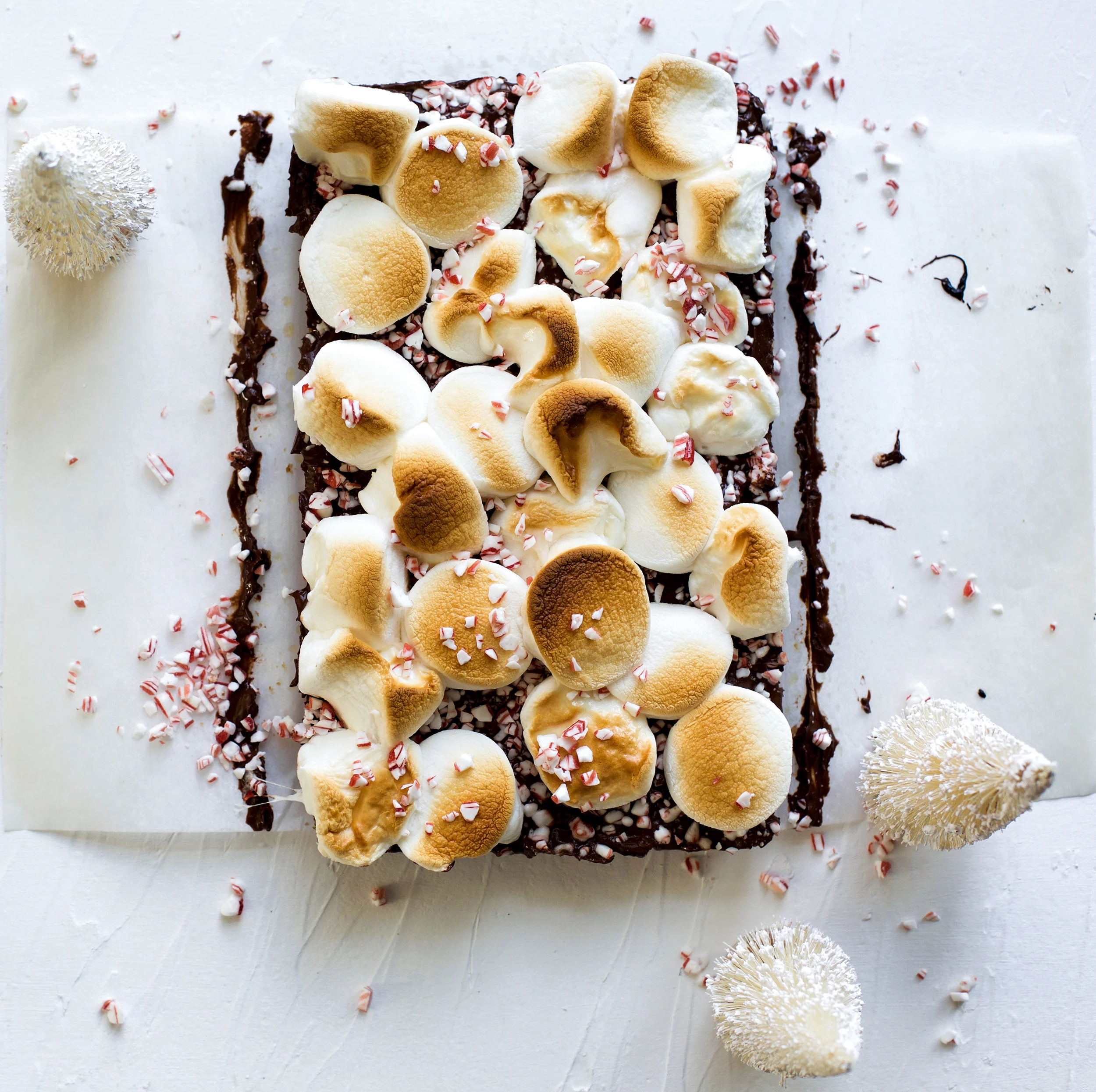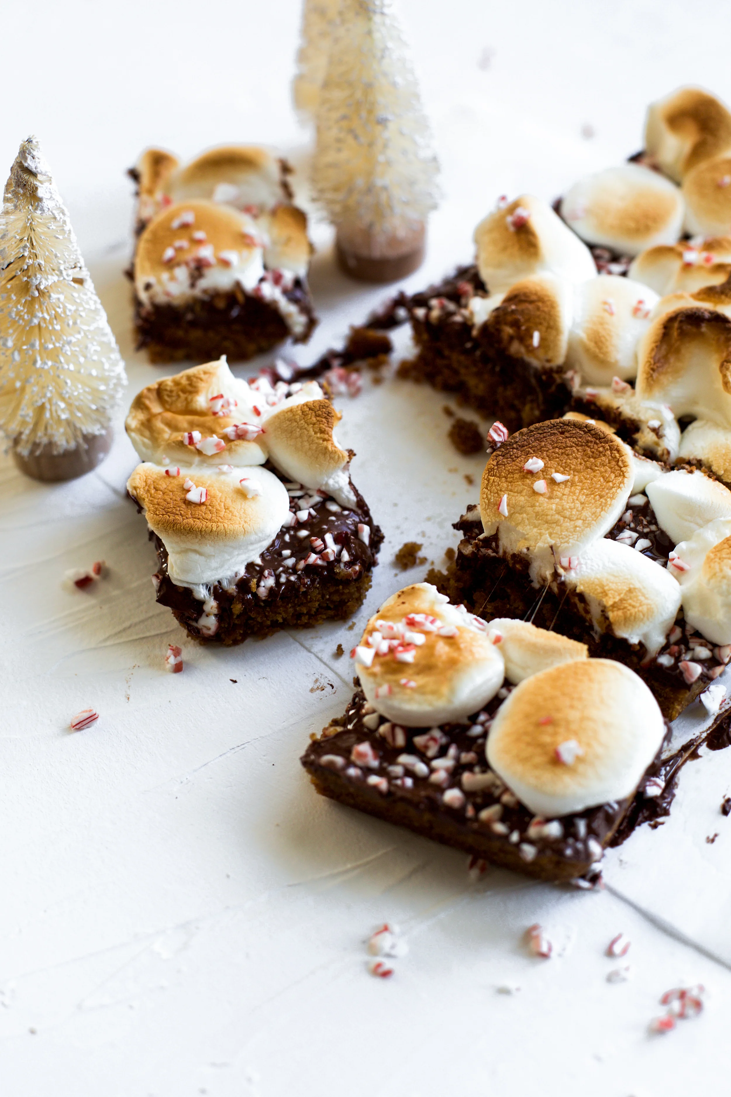 Anyway, these bars are 100% and have a graham cracker crust that is layered with dark chocolate, crushed candy canes, and toasted marshmallows that you can do right in your oven, so no campfire needed! They are delicious served warm and gooey, but I also kind of love them after they have been in the fridge too! So you can definitely make them in advance this way for a holiday party!