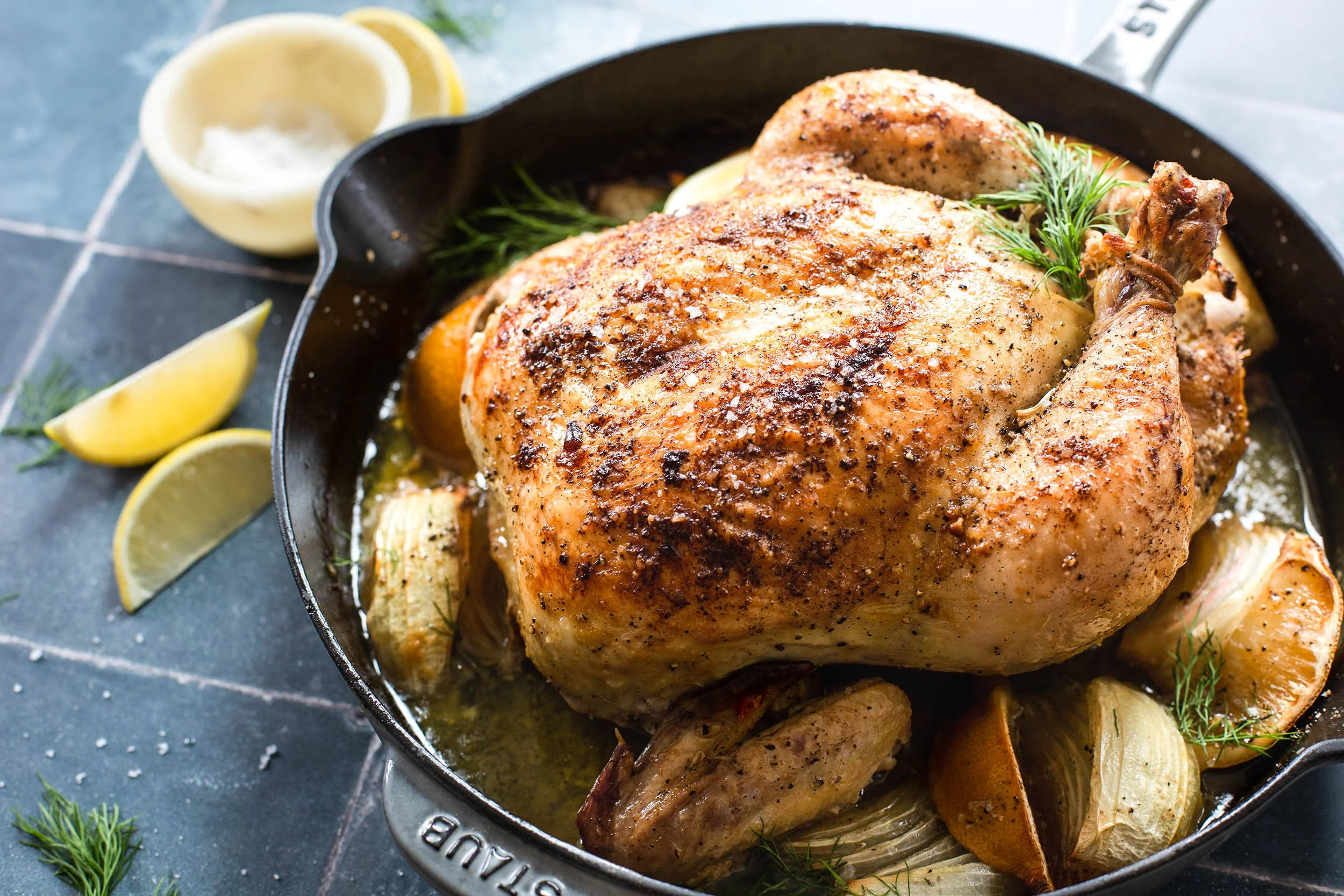 Use salt and pepper liberally inside the cavity and outside of the chicken and then stuff the cavity of the bird with lemon, onion, and garlic. I also like to nestle extra onions and lemon wedges around the chicken in the pan.