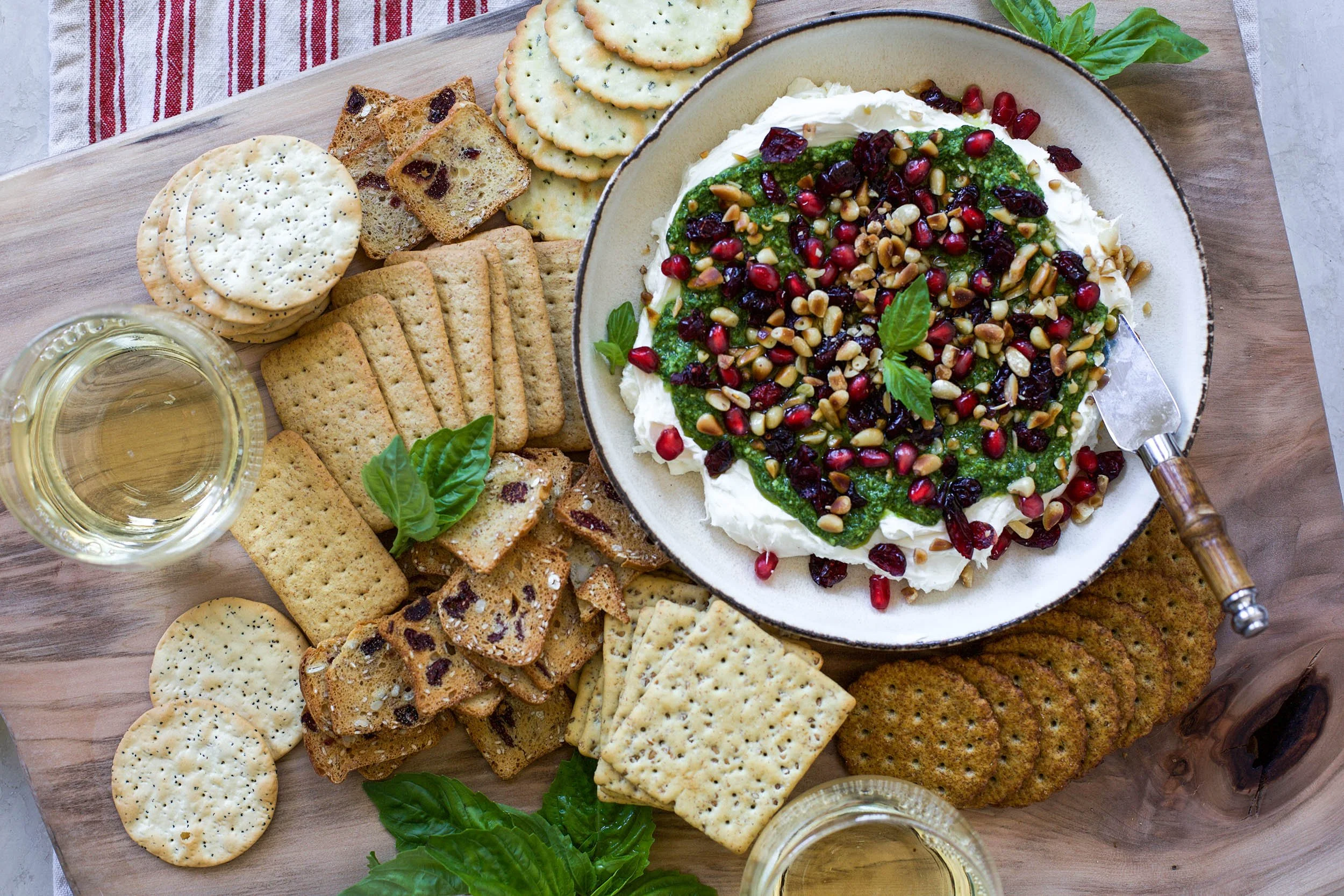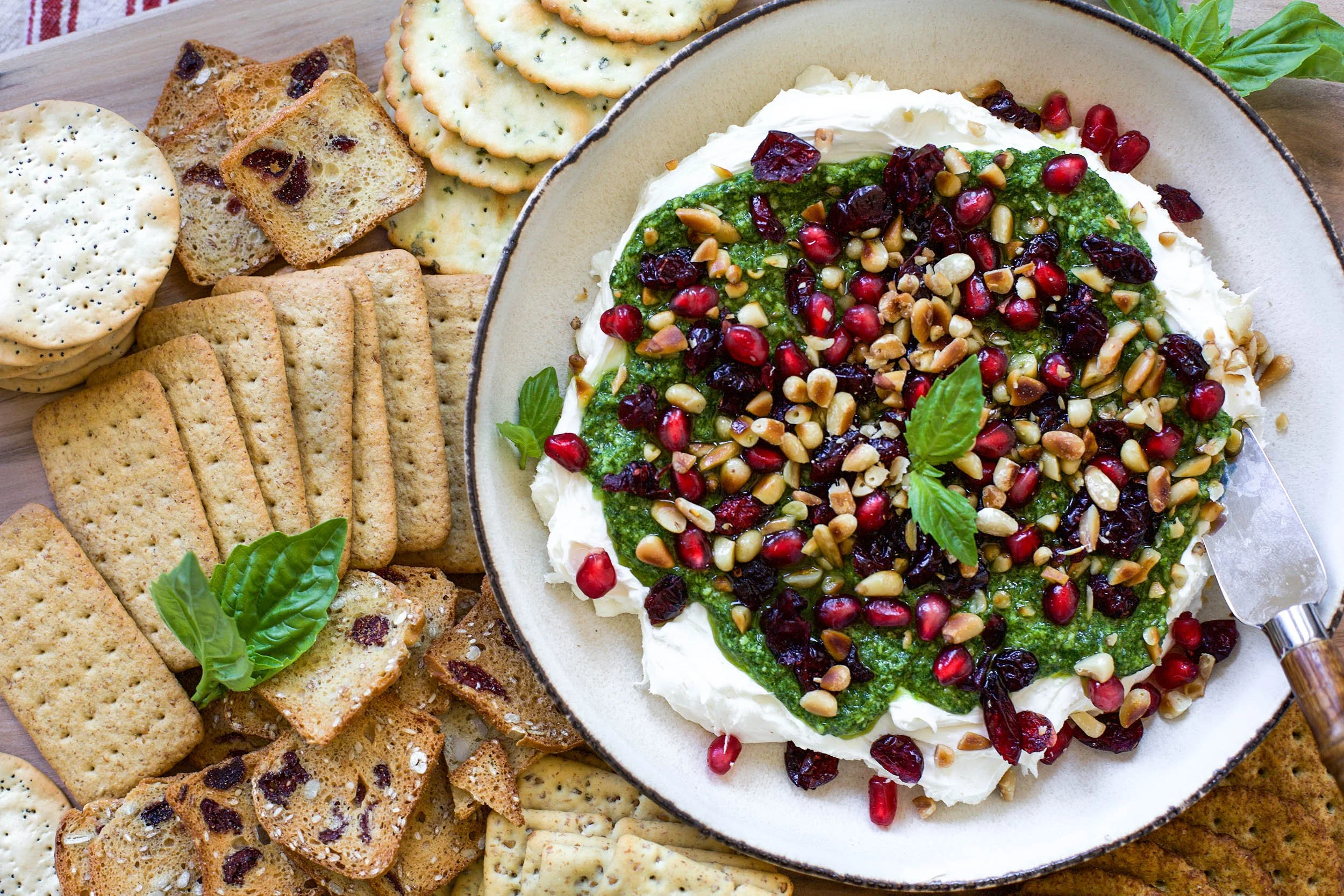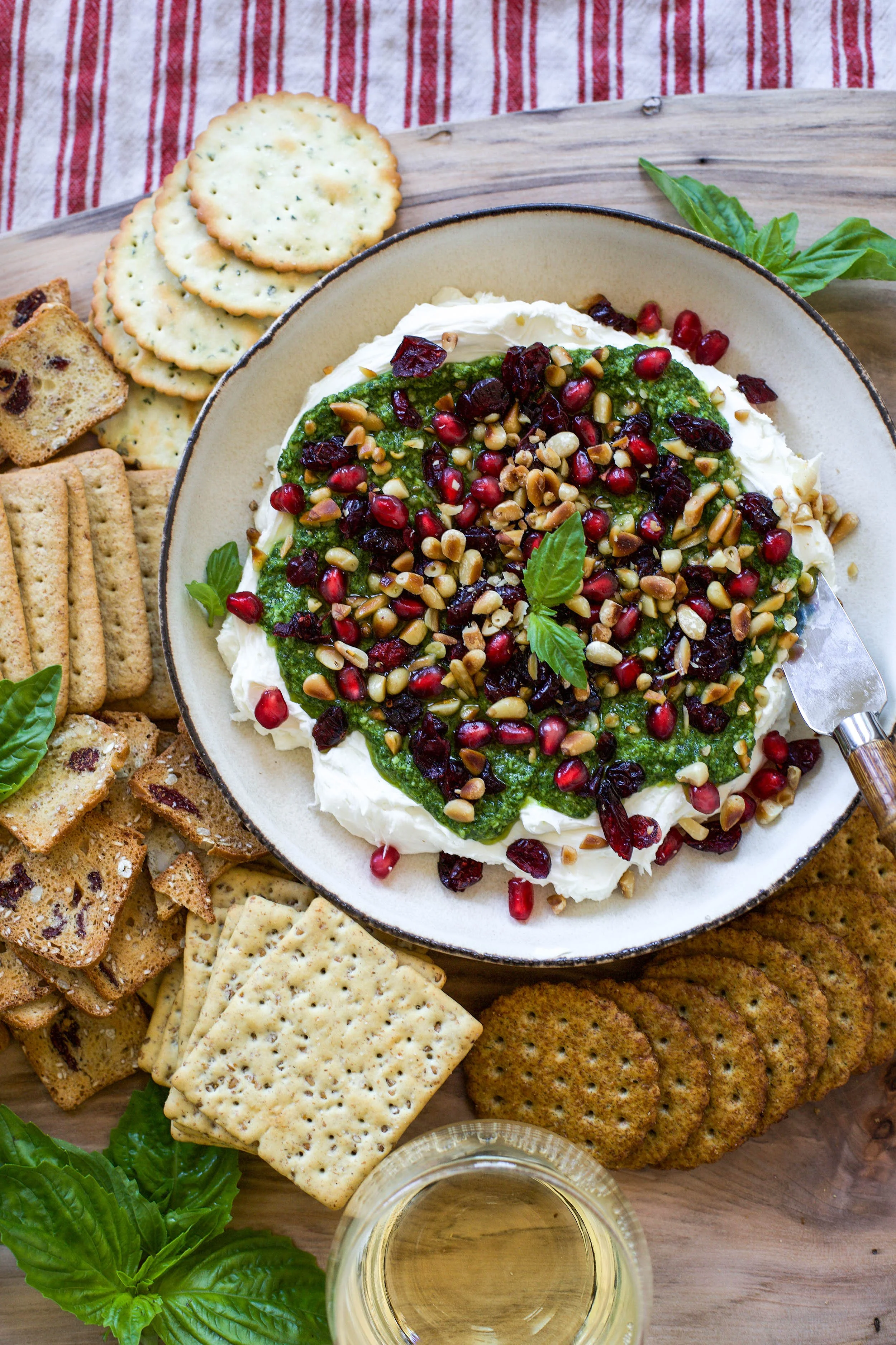 You simply bring goat cheese and cream cheese to room temperature and then mix together until smooth. From there you top of it off with homemade pesto (or store bought if you want to make it even easier), and then top off with dried cranberries, toasted pine nuts, and a few pomegranate seeds. Itβs so pretty and so tasty. I just serve it with a mix of crackers, but it would also be great on a baguette as well.