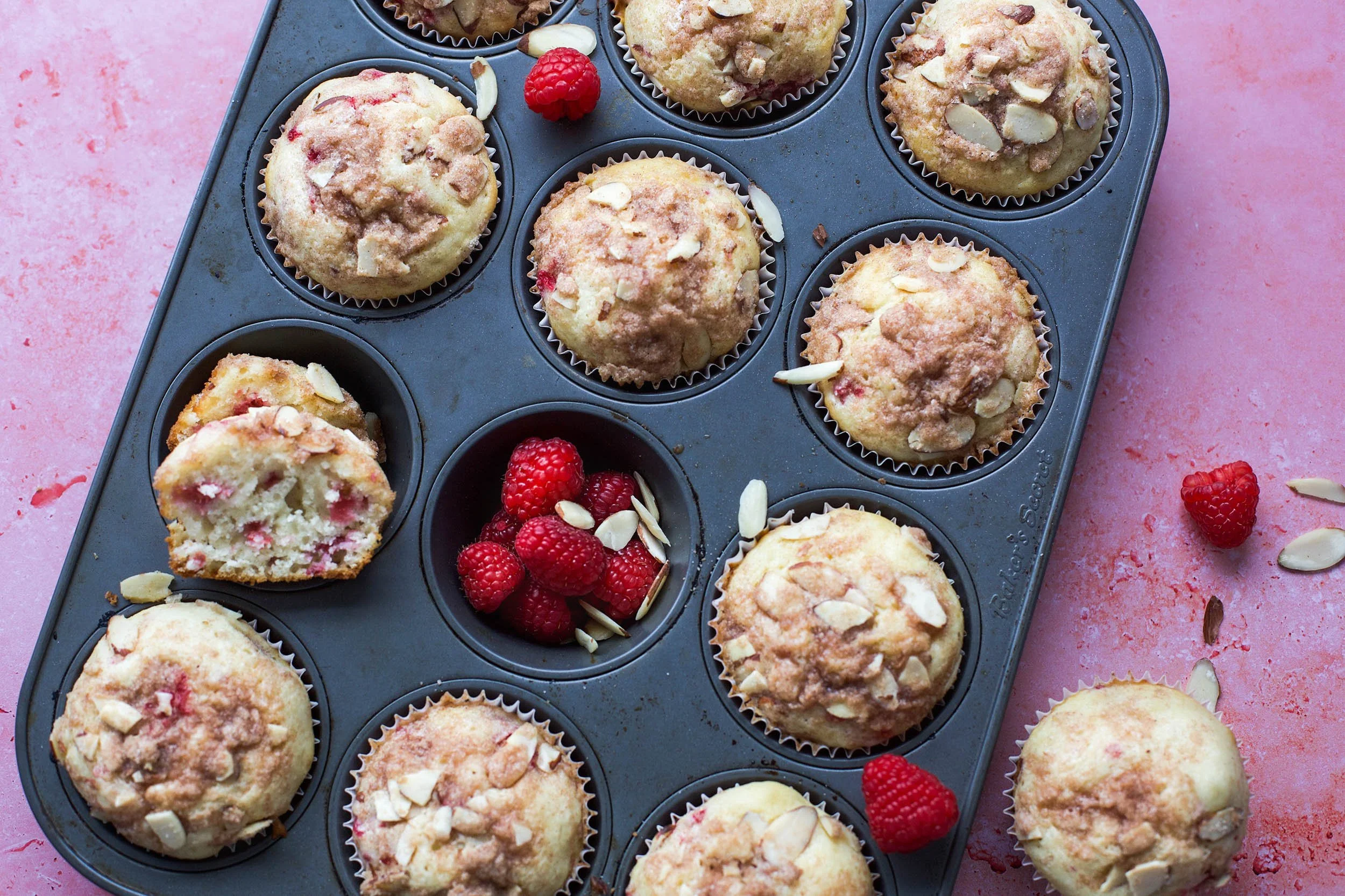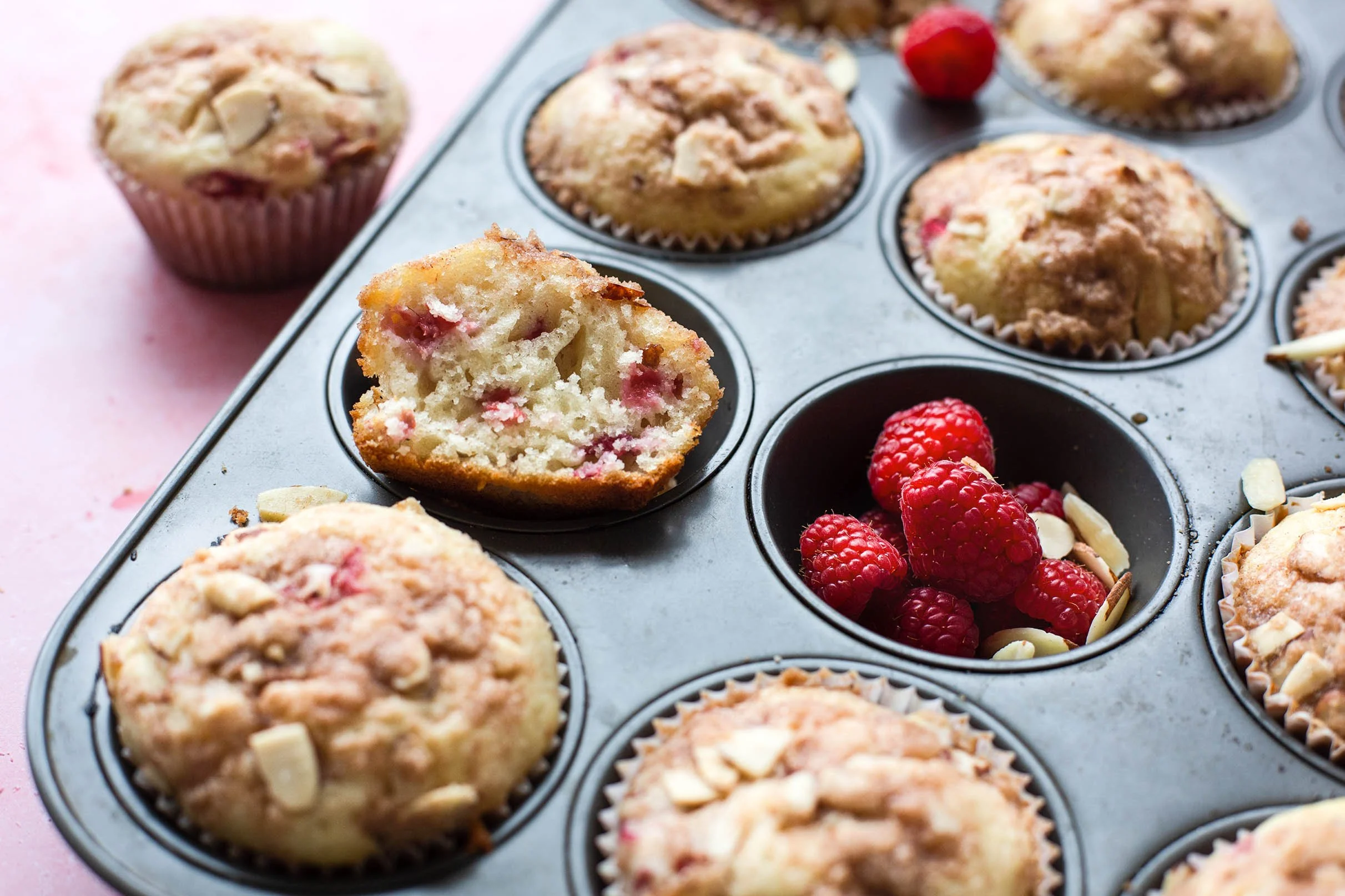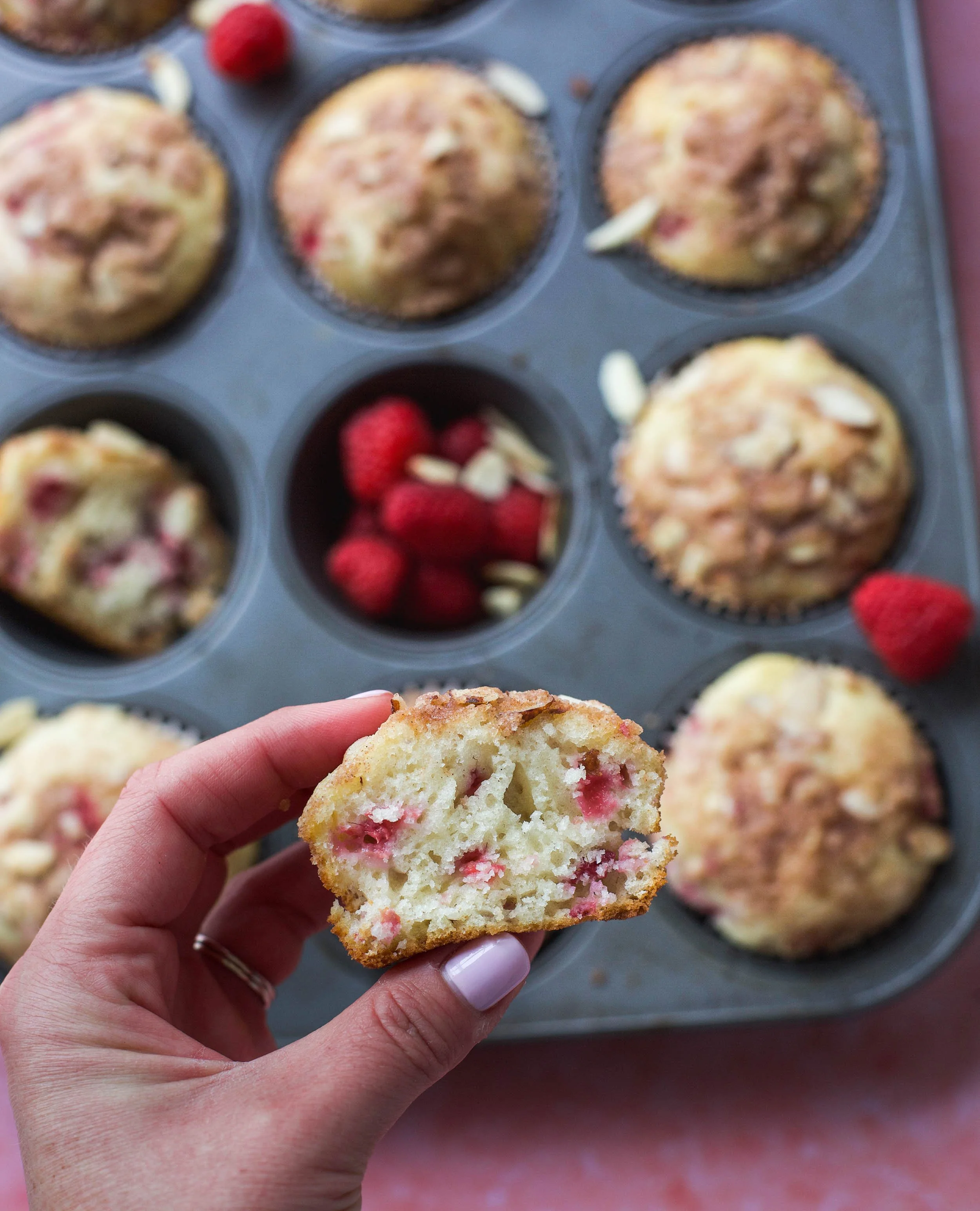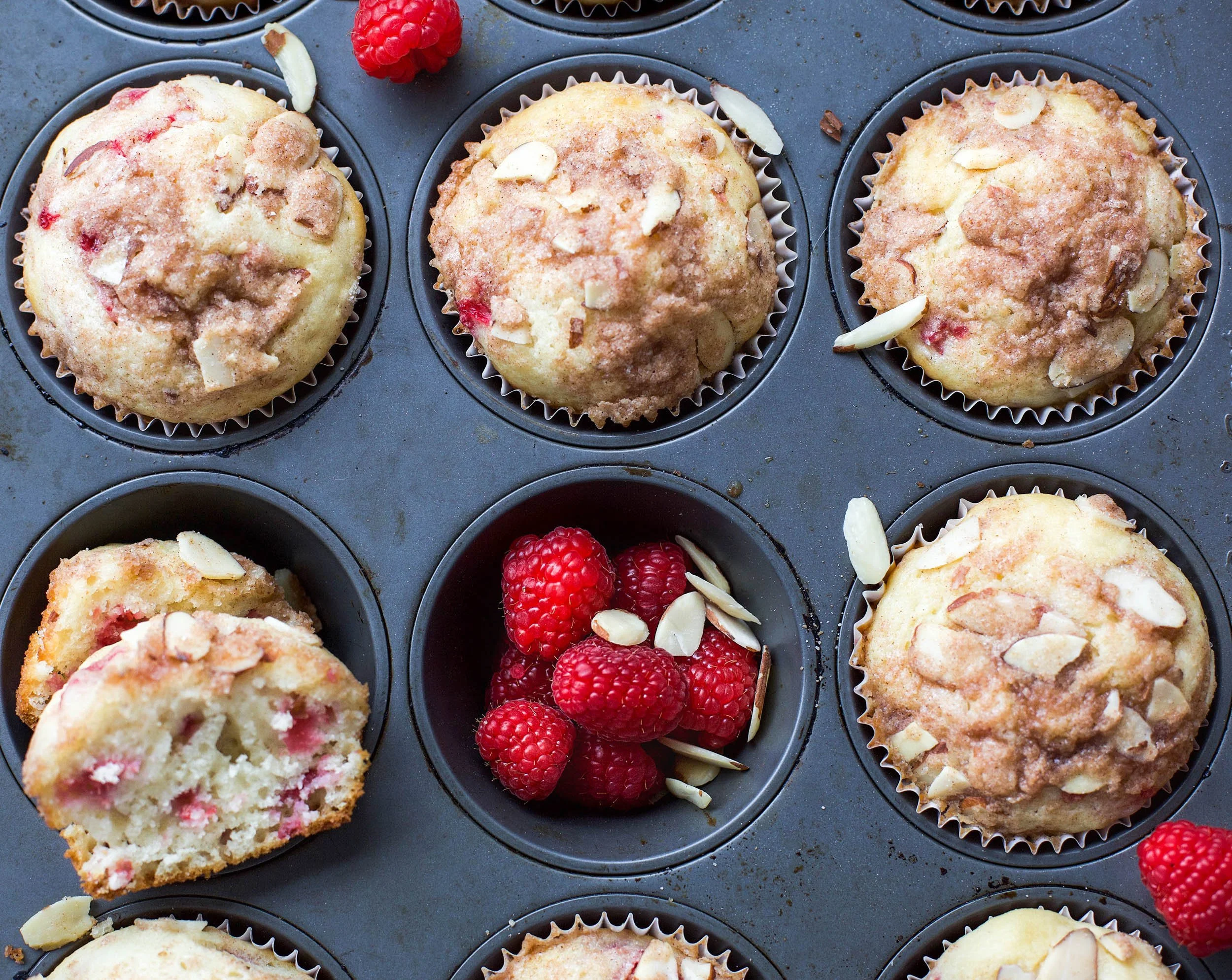 These raspberry almond streusel muffins are light and fluffy and I just love the beautiful color of the raspberries throughout each muffin. I can’t wait for you to give this recipe a try for yourself.