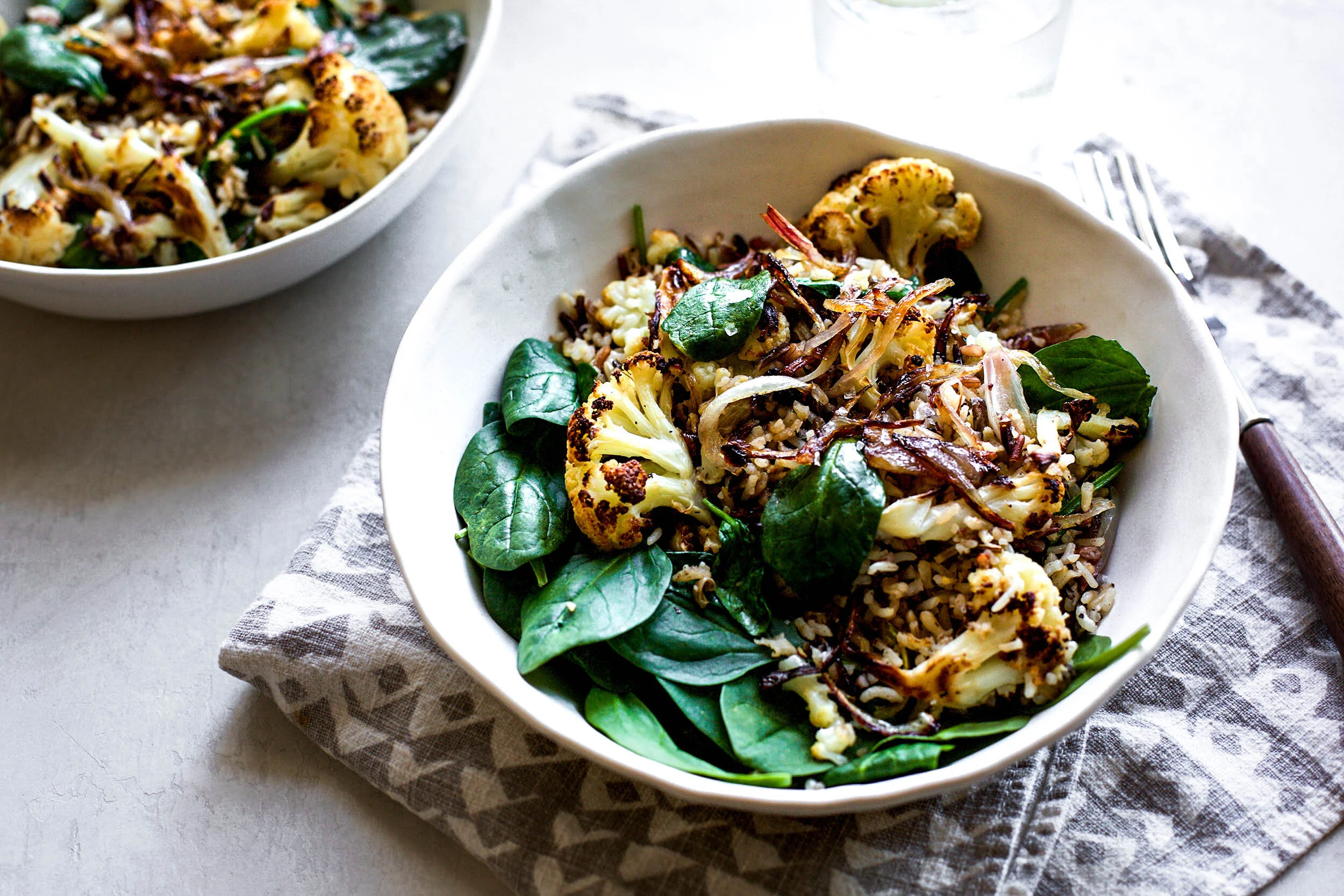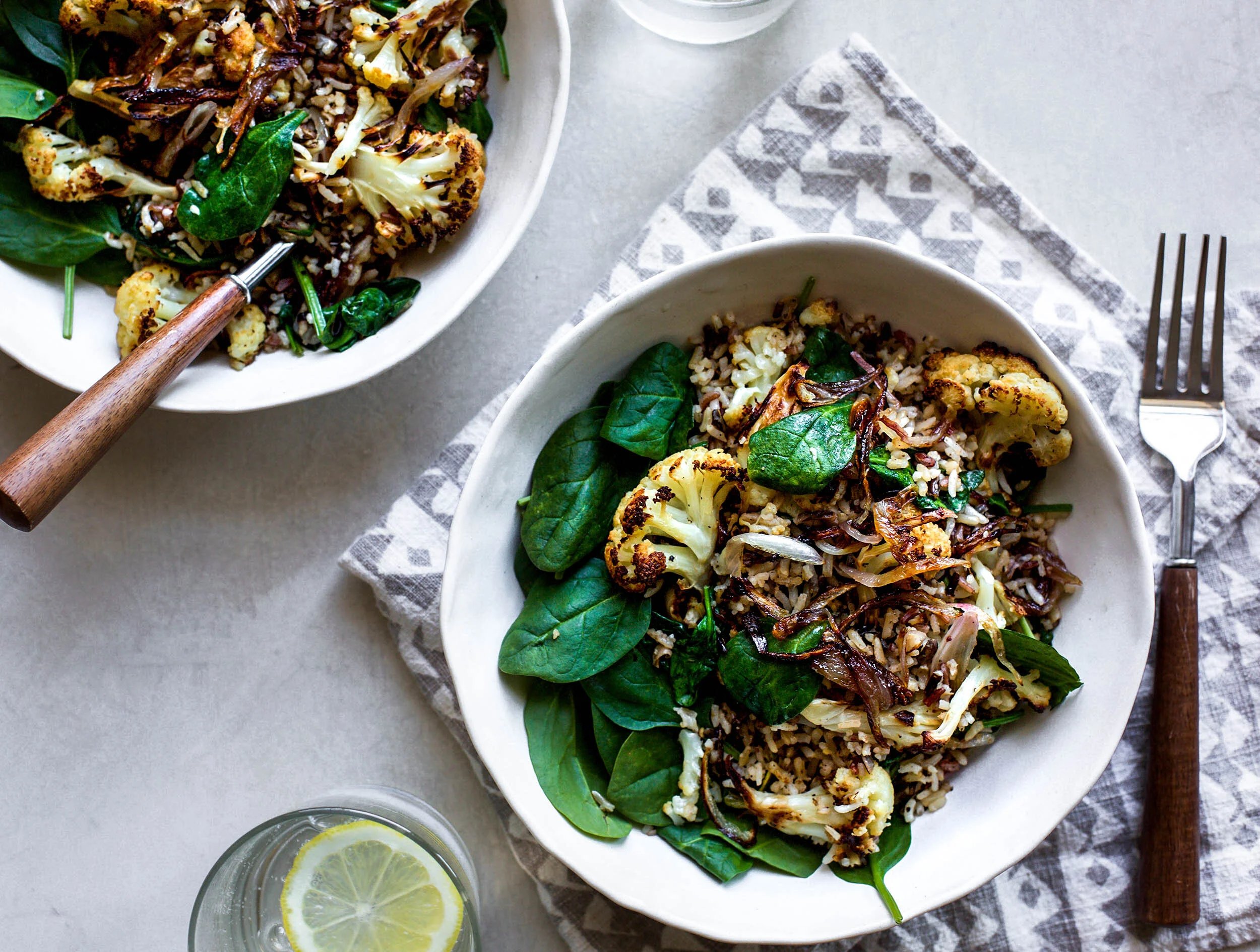 In a large skillet add rice, cauliflower, and spinach and toss to combine over low heat until spinach is just wilted.