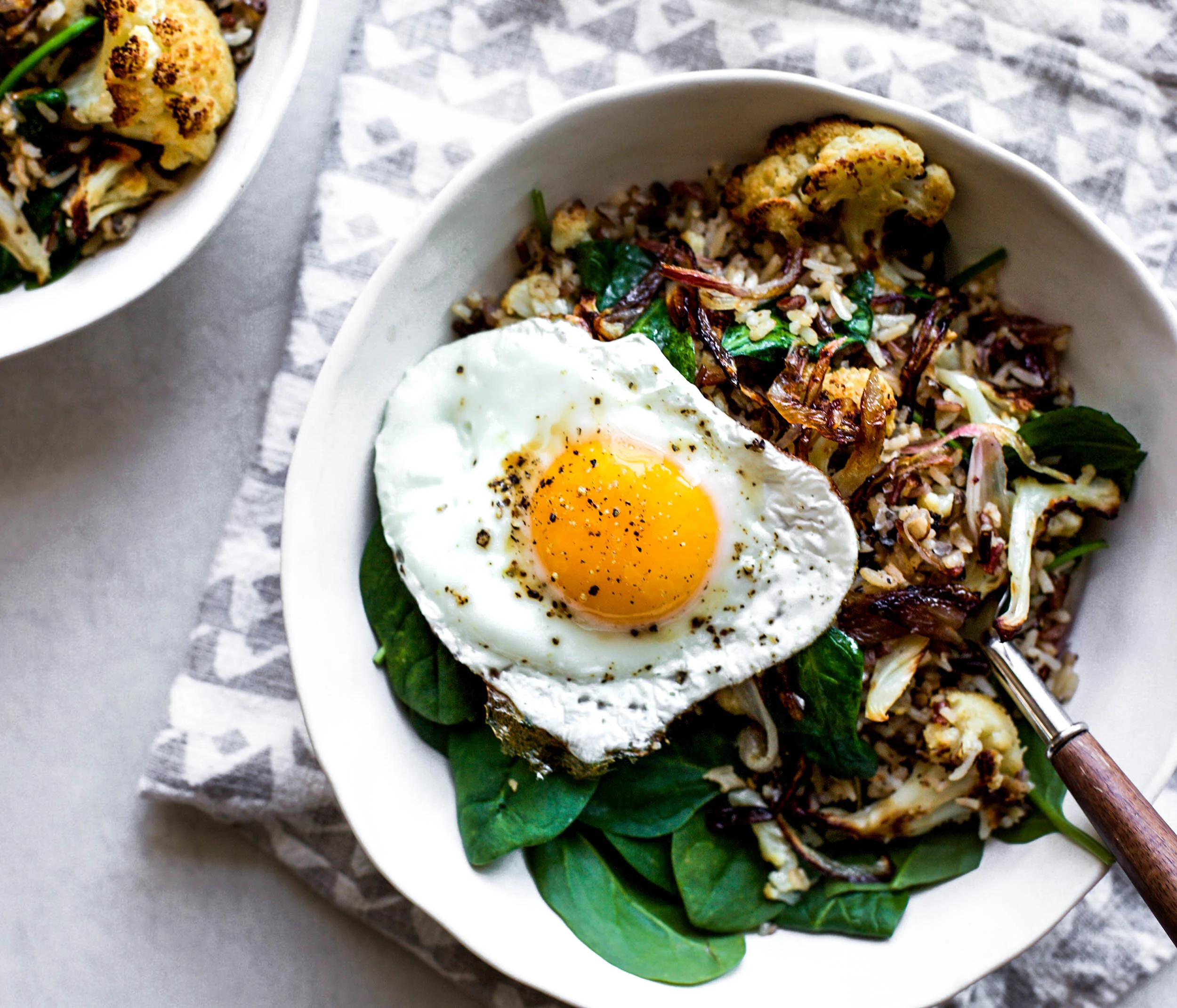 This recipe happened sort of by accident. It was a use what’s left in the fridge kind of night and I ended up tossing all of the ingredients together and bam, it was magic! So much so that we have eaten this meal twice in the last week. This dish is definitely going to make my fellow roasted cauliflower fanatics super happy! I love that it could easily be breakfast, lunch, or dinner and truly has all of the components that every meal should have to stick with you and give you energy. If you need a little extra protein, just add a fried egg, legumes, or serve alongside some fish or chicken.