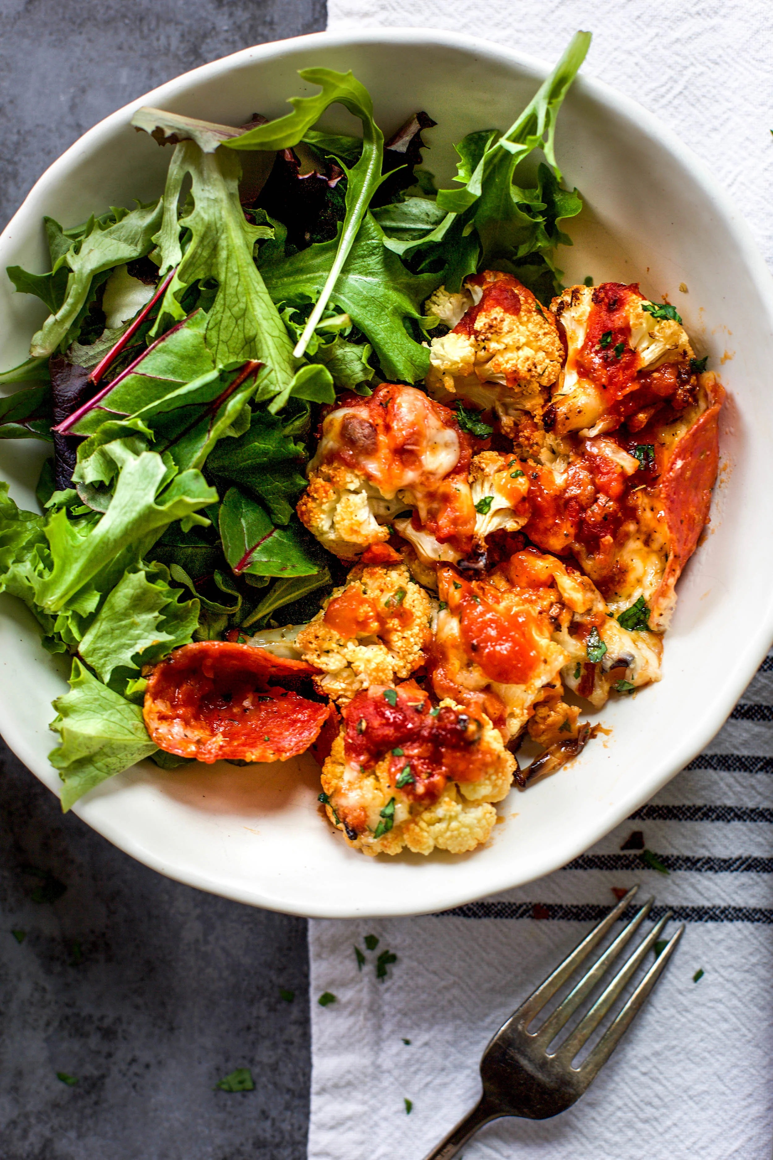 I simply roast up a whole head of cauliflower, and then top it off with my homemade pizza sauce, a few pepperonis, and some cheese and place back into the oven to melt that cheese and let all the flavors get happy together. You could honestly add in some other veggies to the mix here or keep it vegetarian and skip the pepperoni. I think adding some sliced Italian sausage would be awesome in the mix too in place of the pepperonis…I mean you get the idea, the options are endless!
