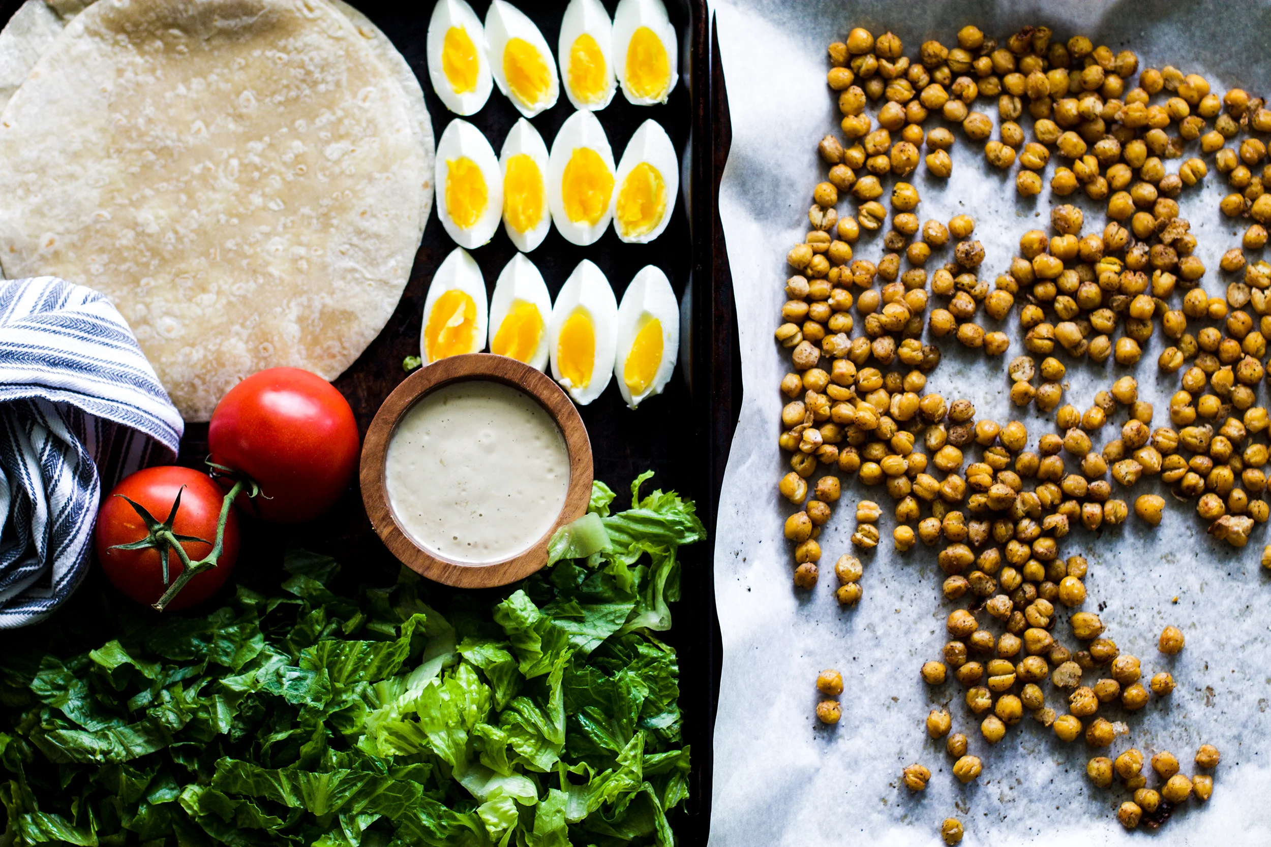 Hey hey Monday! I see you, trying to intimidate us all, making us wish it was still the weekend..but that’s not going to work this week! I’m ready for you. I woke up motivated, rested, and ready to tackle this week’s to-do list! How about you? Not so much? Don’t worry if you aren’t feeling quite as enthusiastic about Monday morning just yet, I am here to change your outlook! One of the ways I prepare for a successful week is by meal planning and lunches are the one thing that sometimes get the short end of the stick! I have had several requests for not only kid friendly lunches, but also adult lunches, and I have a great one that you can prep in advance for the week! My roasted chickpea caesar wraps are so easy to make, healthy, and satisfying to keep you going through any day of the week!