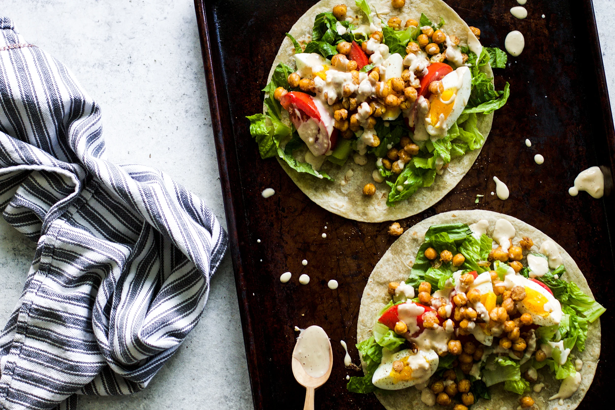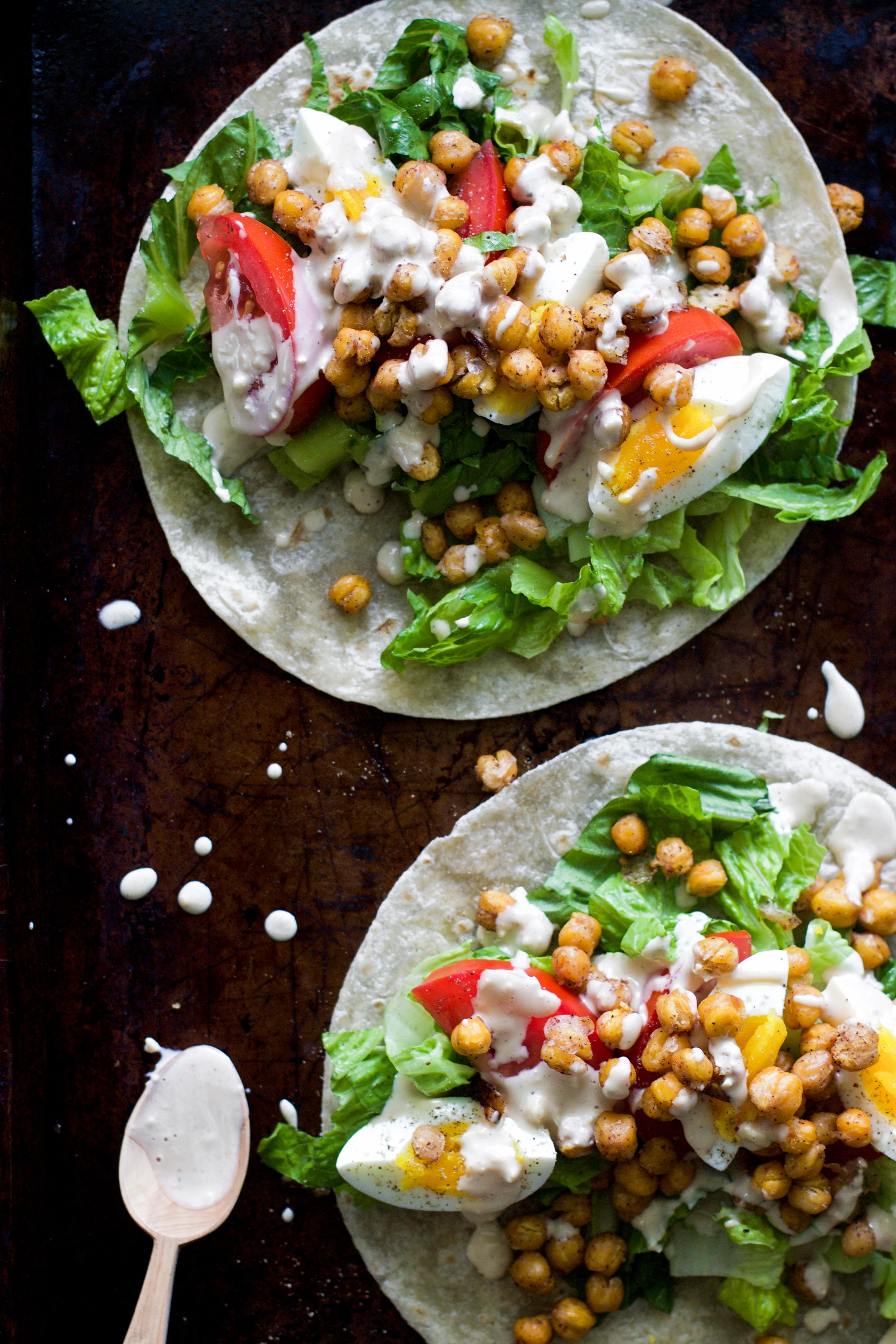 Layer romaine lettuce, tomatoes, 1 egg, and chickpeas in the middle of the tortilla.