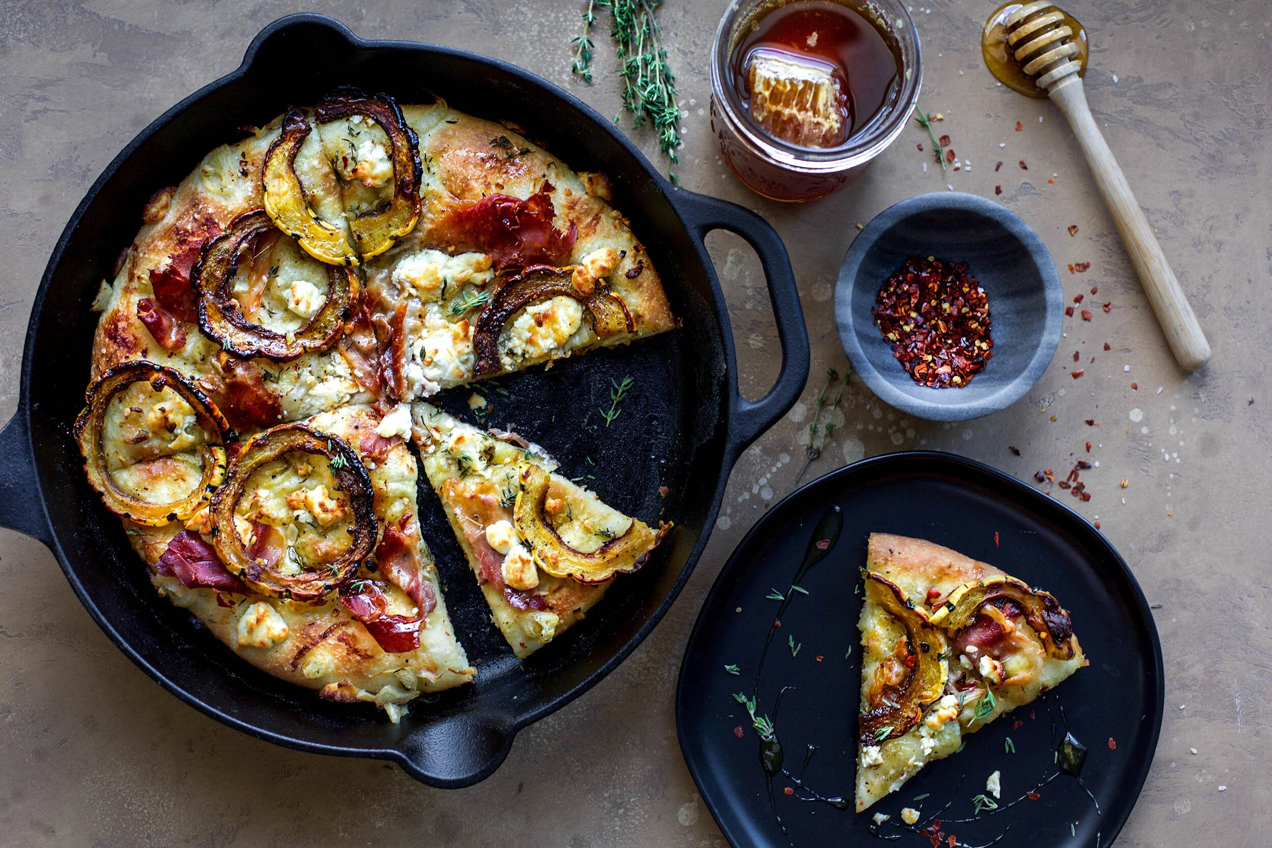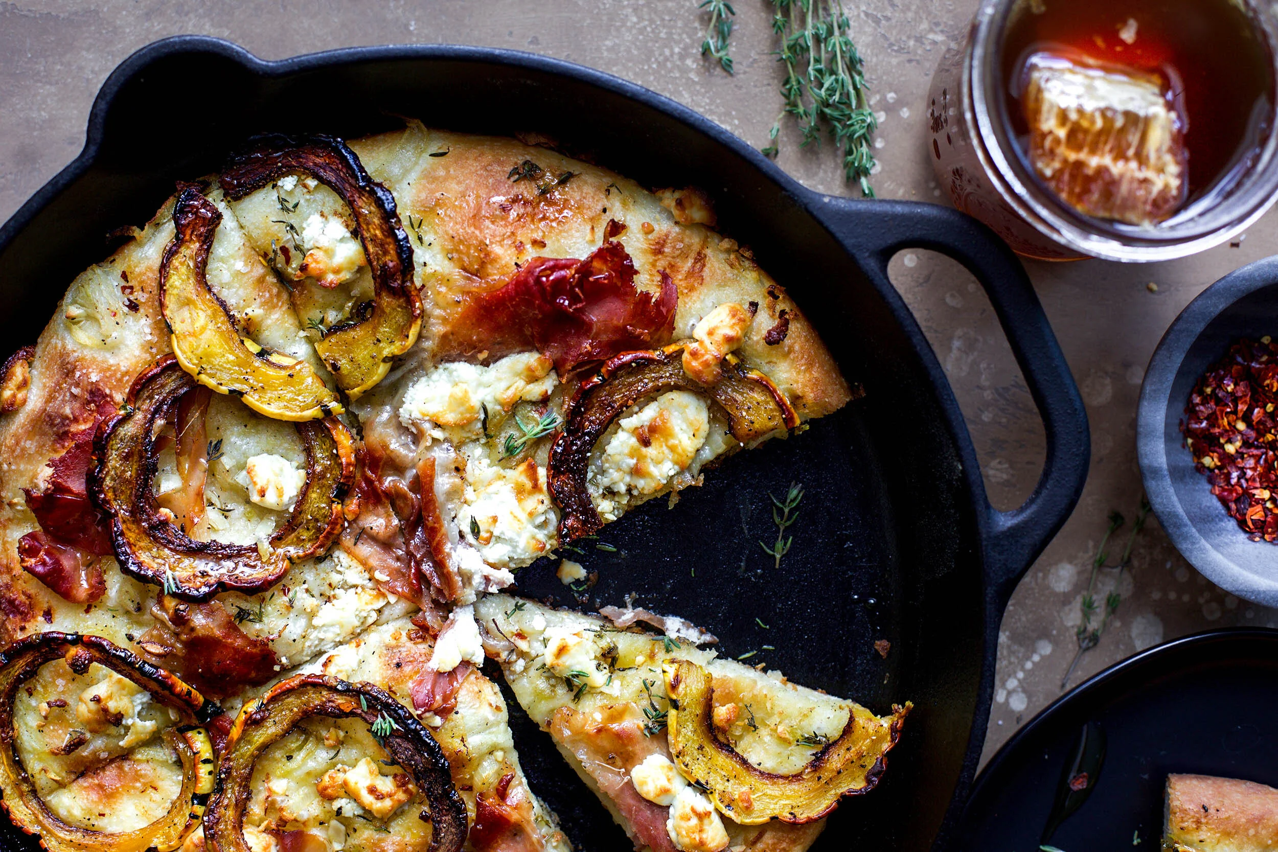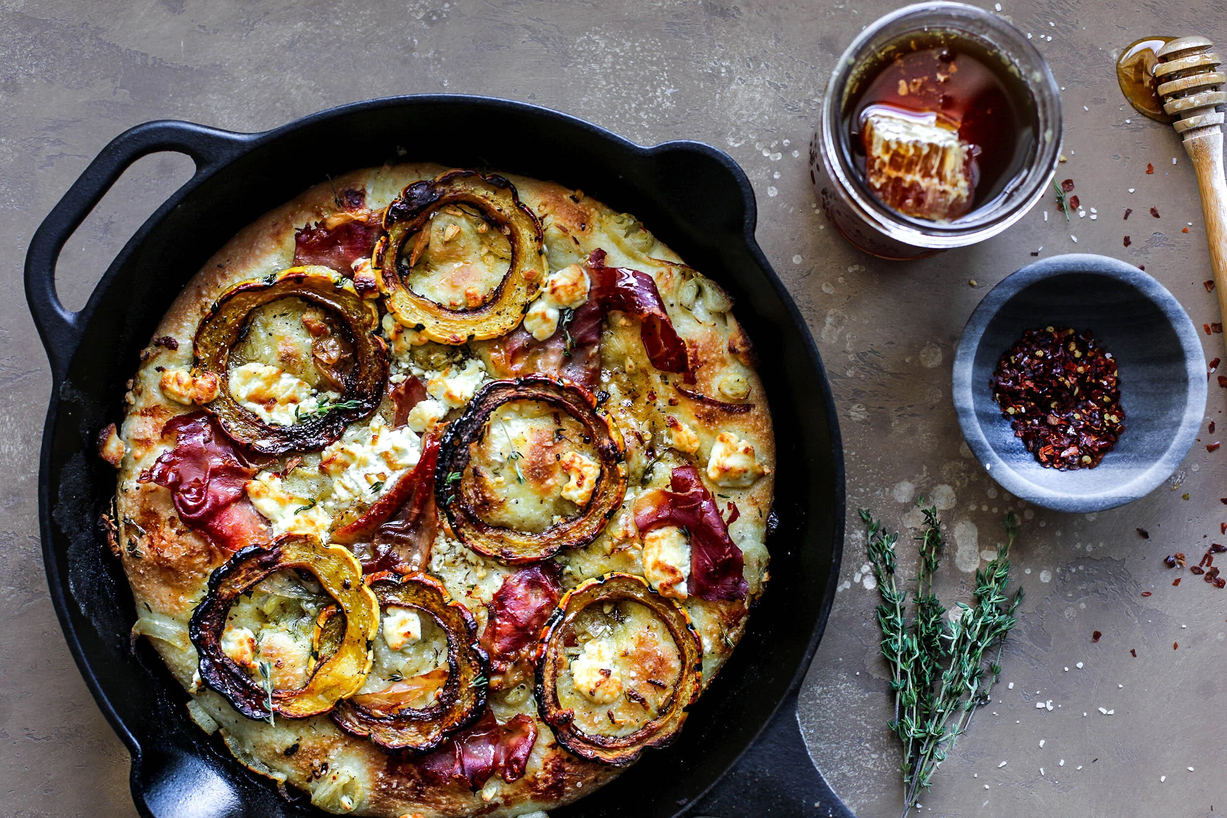 I bake this pizza in a cast iron skillet for the ultimate crispy crust and top it simply with a shallot and garlic infused oil, fresh thyme, and then top it with roasted delicata squash, prosciutto, and creamy goat cheese and then finish it all off with a drizzle of honey! The flavor combination here is out of this world! This pizza will give you total restaurant quality vibes here and it’s such a delicious way to use up some of those squash varieties you might have.