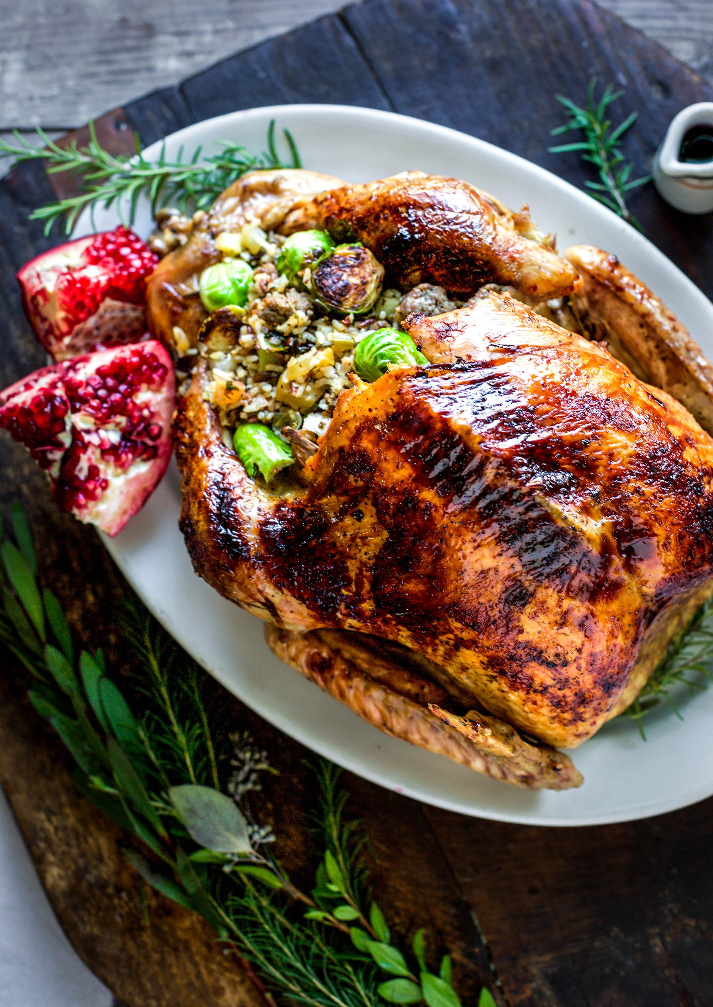 Celebrate Thanksgiving this year with three brand new recipes that are sure to wow your friends and family including a turkey that is a major show stopper. I created a simple, but flavorful and special turkey that is easy enough for any at home cook, no matter the skill level. No fancy equipment needed, just a few really flavorful ingredients that transform a turkey into a gorgeous centerpiece for any Thanksgiving table! Lucky for you I included a few of my favorite side dishes to make your menu complete! My Rosemary Pomegranate Maple Glazed Turkey is easy to make and is topped with a rosemary infused pomegranate glaze that takes this roasted turkey to a whole new level.