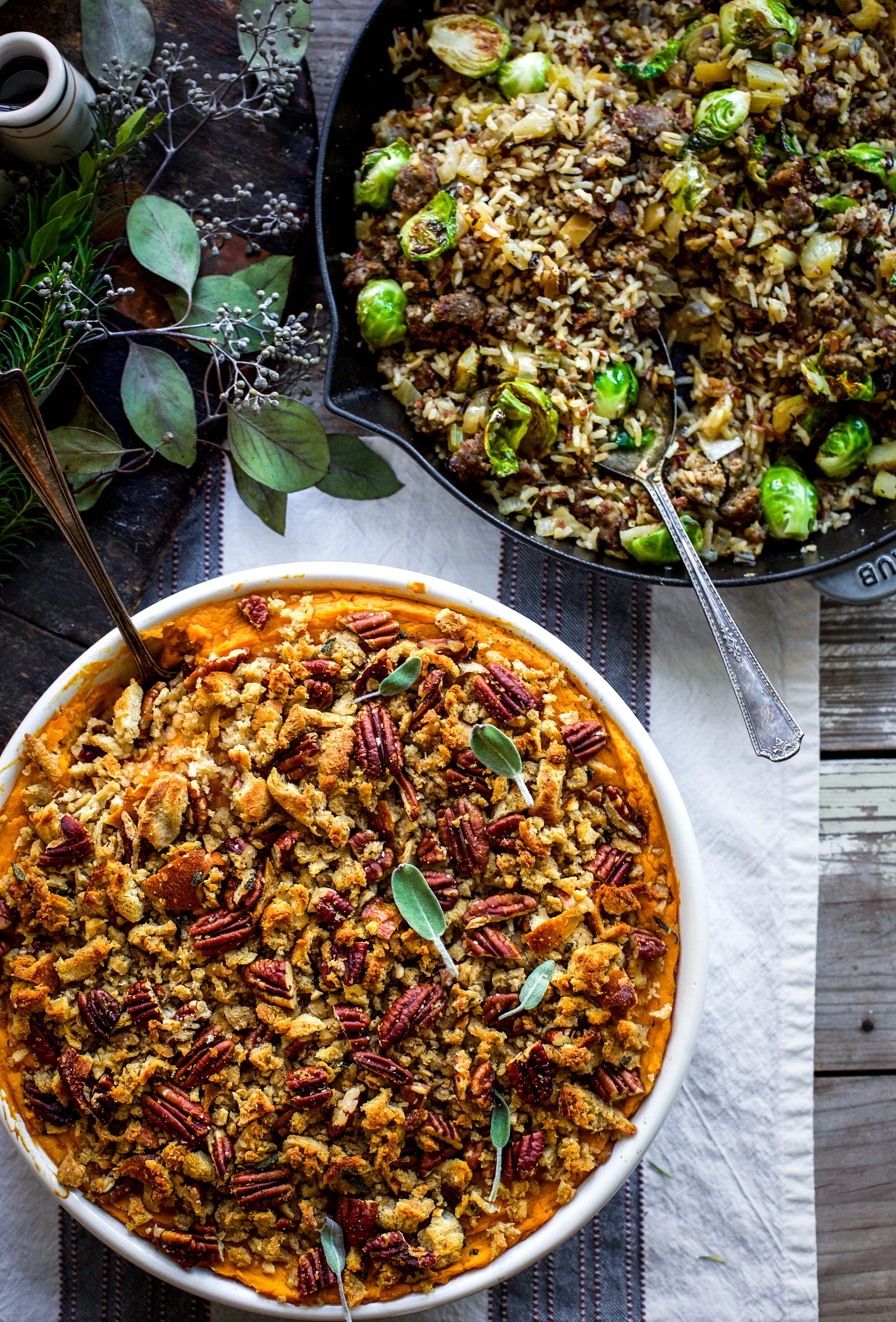 Savory Chipotle Sweet Potato Casserole with a Sourdough Sage Pecan Bread Crumb Topping
