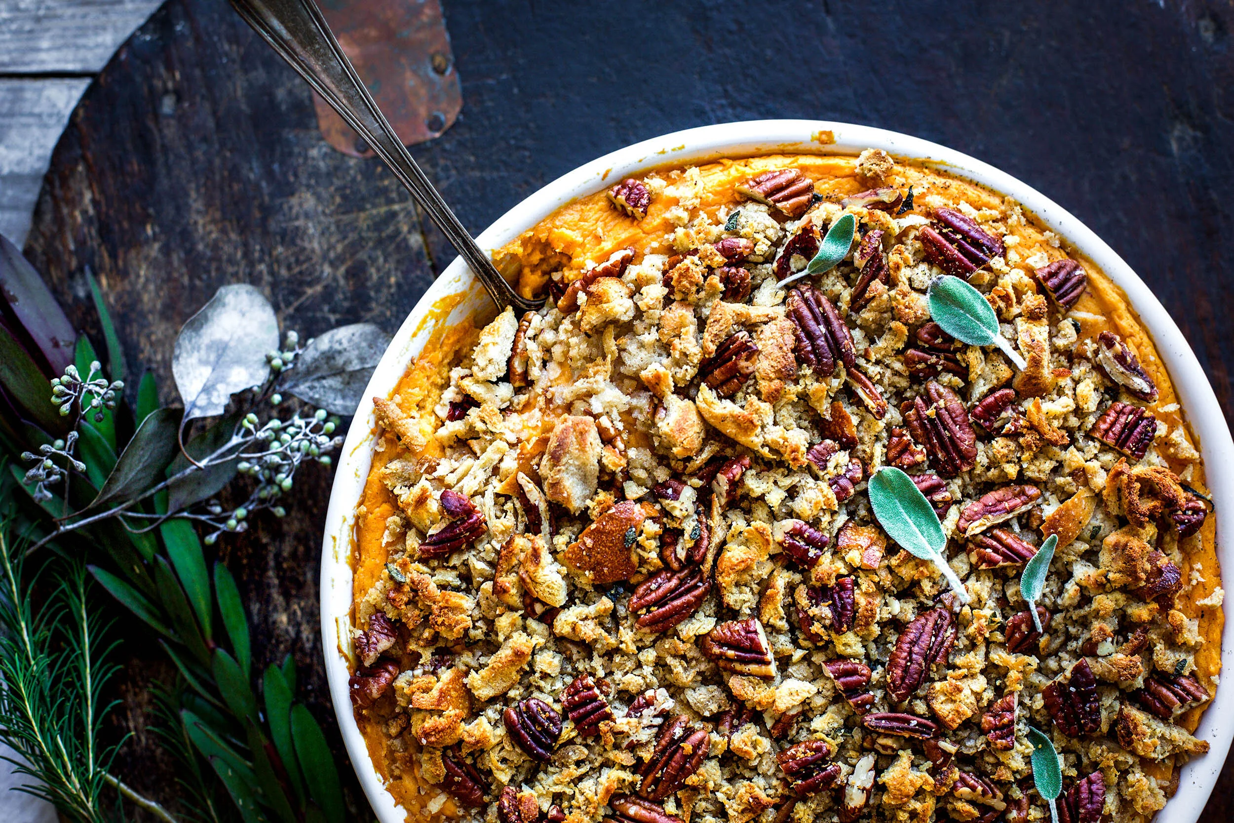 The inspiration for this recipe came from a recipe in my first cookbook, The Unexpected Cajun Kitchen. I have a recipe for whipped chipotle sweet potatoes that is to die for so I took that recipe and turned it into a casserole that is just the right amount of savory with a little kick from the chipotle peppers that is just the best combination of flavors. To top it all off, I created a sage pecan sourdough bread crumb topping that quite honestly could be eaten on it’s own because it’s so delicious, but really takes this casserole to the next level! This crumb topping turns an already great recipe into a spectacular one that is fit for any Thanksgiving table full of those classic holiday flavors we all love.
