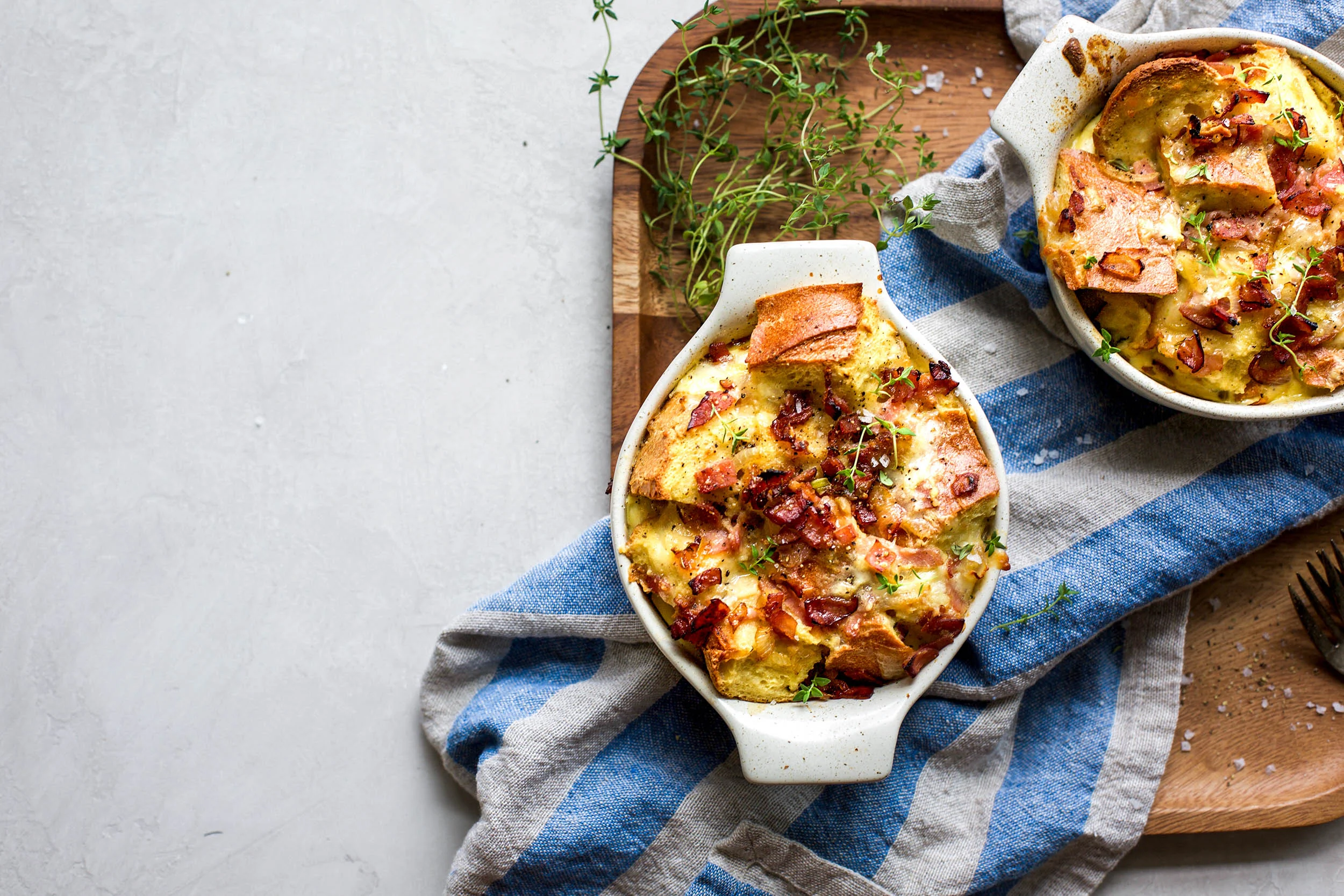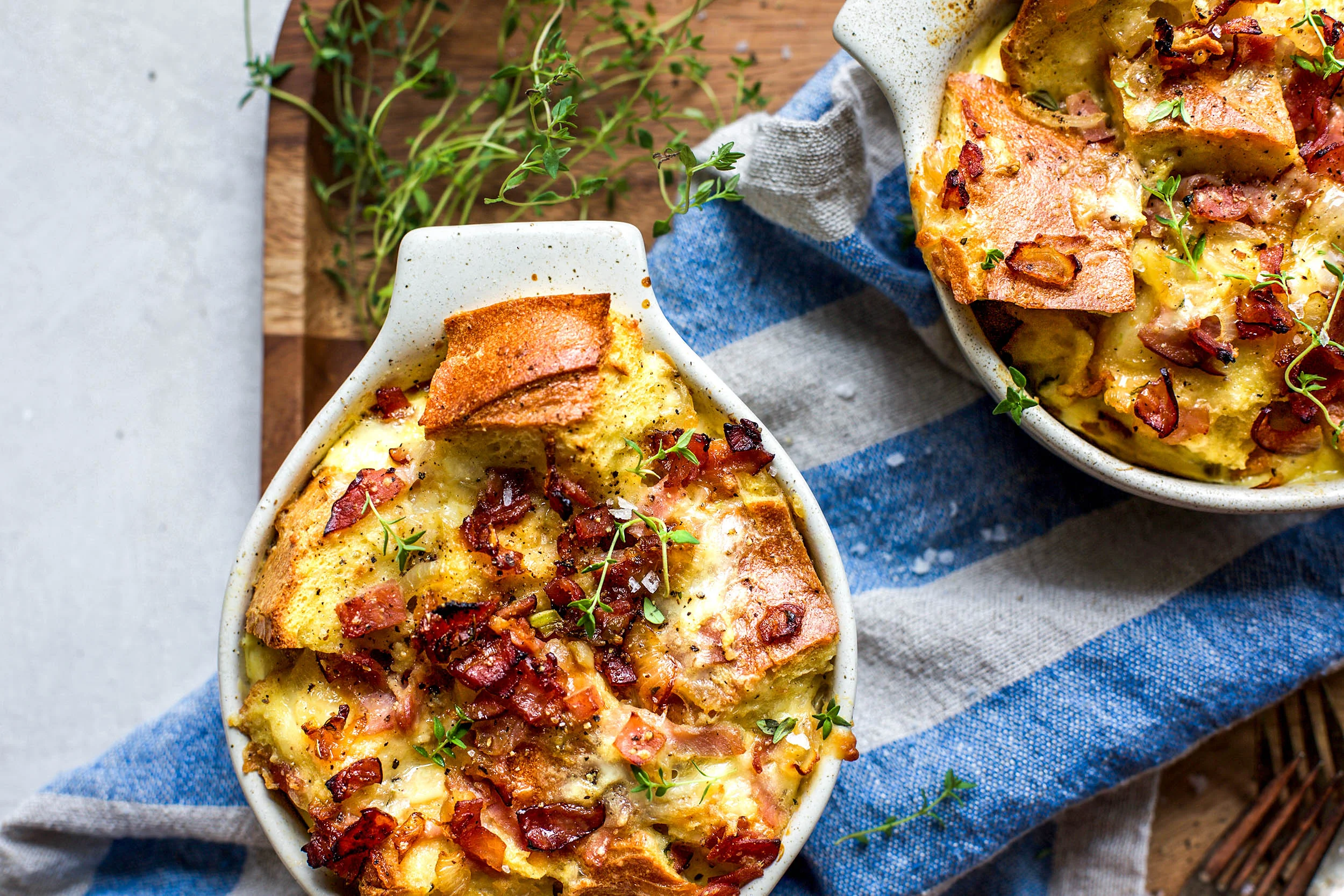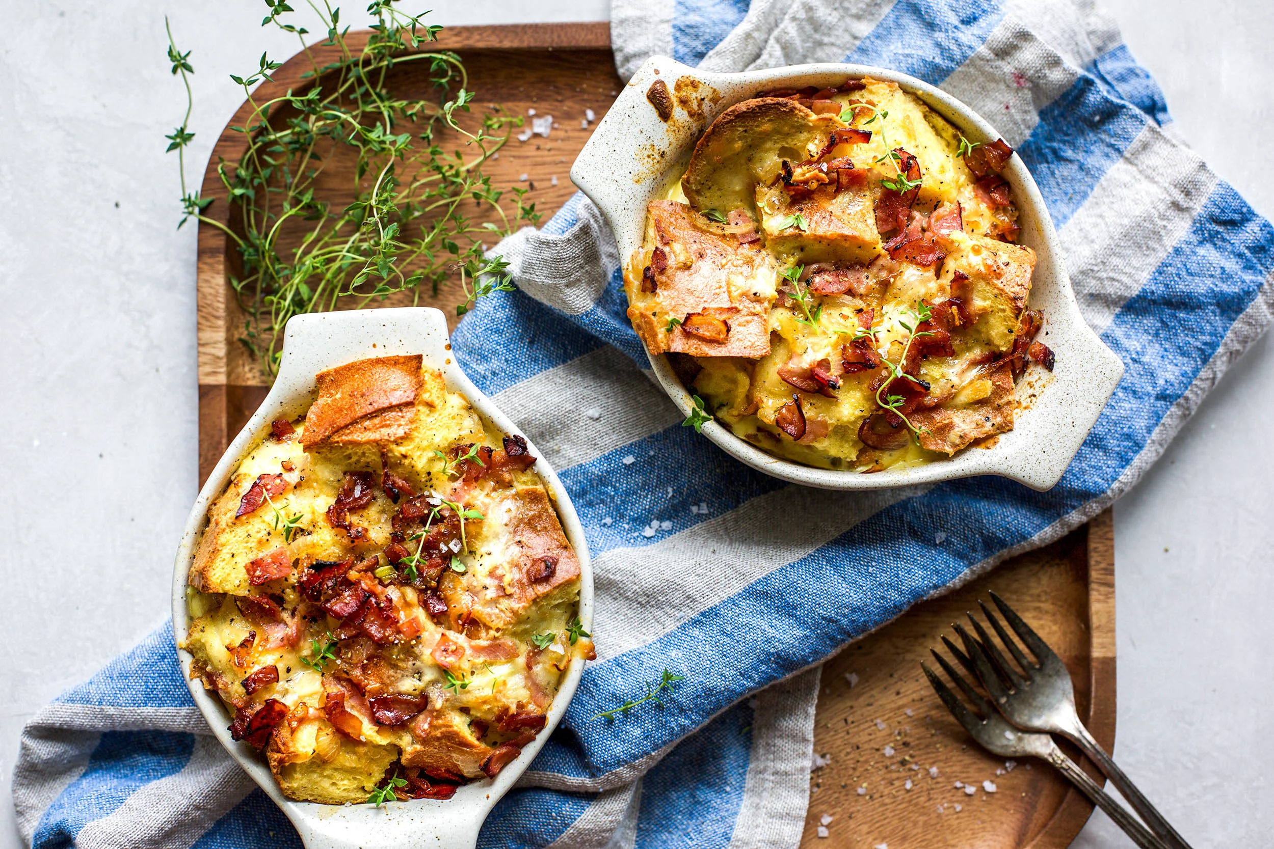 Stale French bread gets transformed into custardy goodness with the help from milk, eggs, dijon mustard, Manchego cheese, salty ham, and fresh thyme! It’s truly such a delicious recipe that everyone in your crew will love! It’s the perfect recipe for a weekend brunch or even an easy weeknight dinner! I like serving it alongside a green salad and a big bowl of fresh fruit salad to balance the richness out! It’s the easiest recipe, but feels really special too!