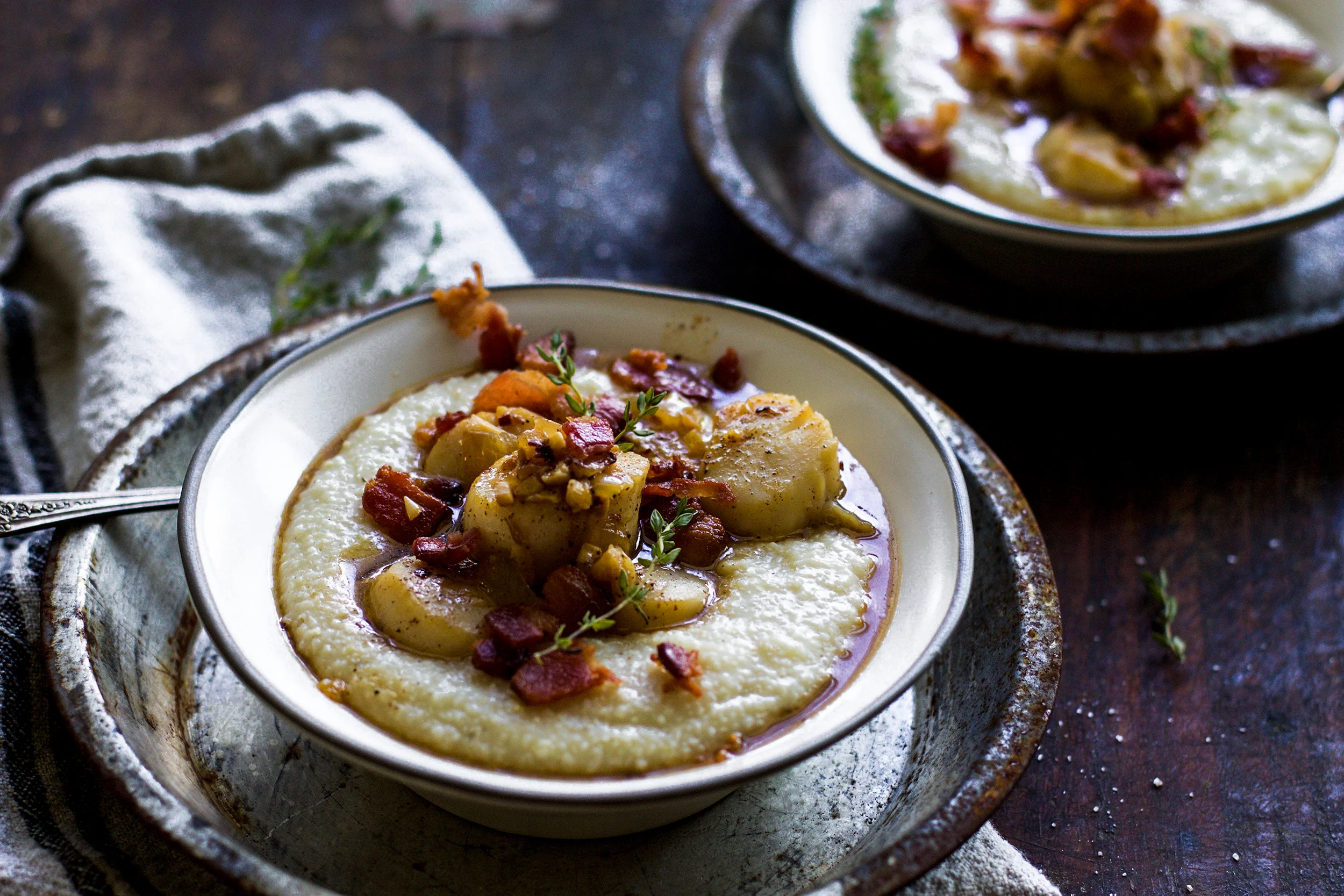 To serve spoon grits into a bowl and then top with scallops, the sauce, and crispy bacon.
