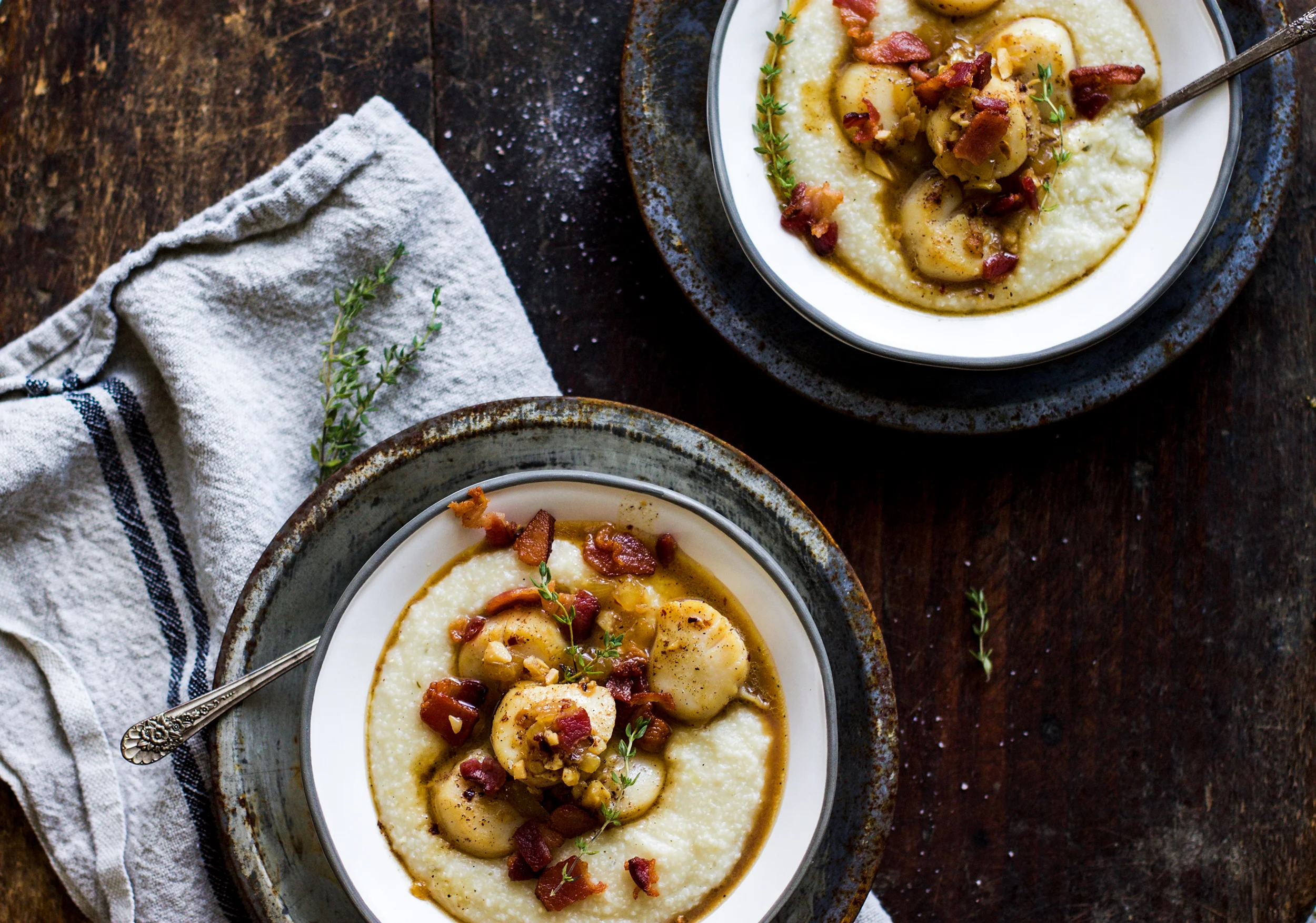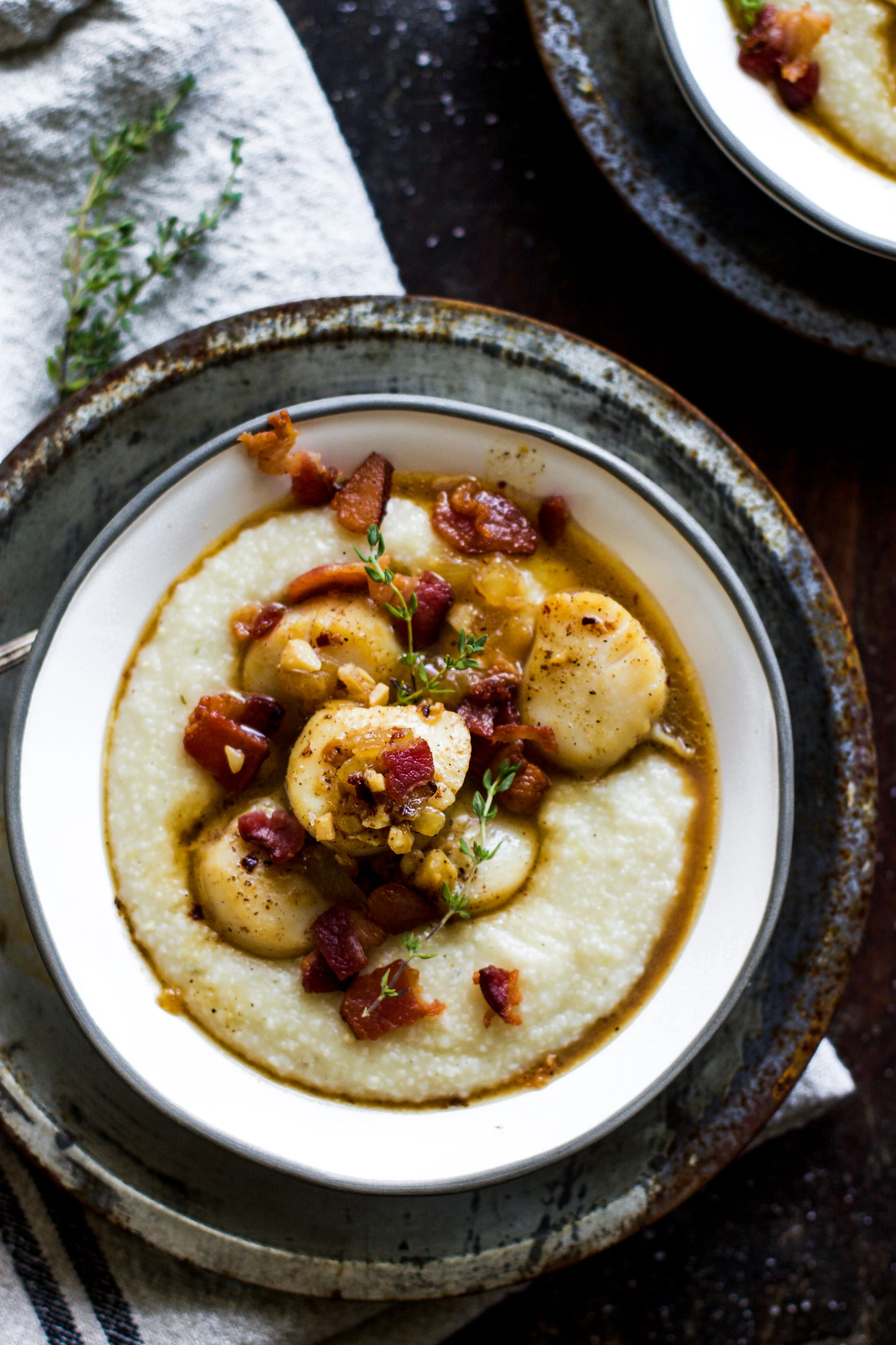 But listen, any way you can get your hands on some scallops is fine by me, just tell me you will find some! This dish is not one you are going to want to pass up! The grits are infused with fresh thyme and then finished off with parmesan and butter to make them so creamy AND then they get topped with tender scallops, crispy bacon, and delicious sauce!