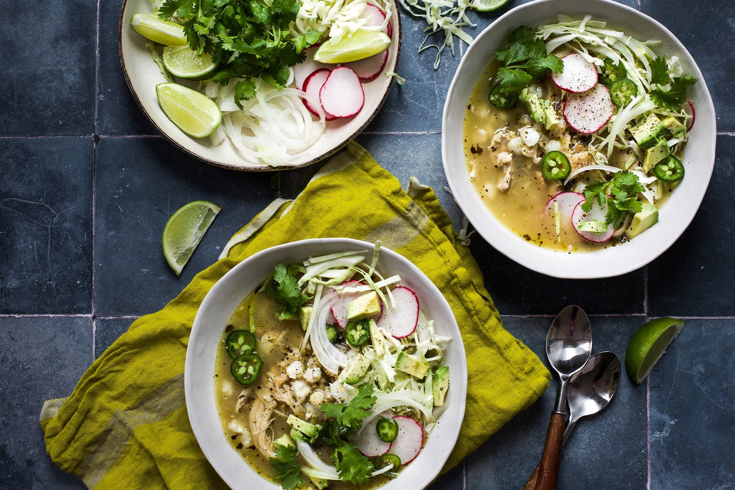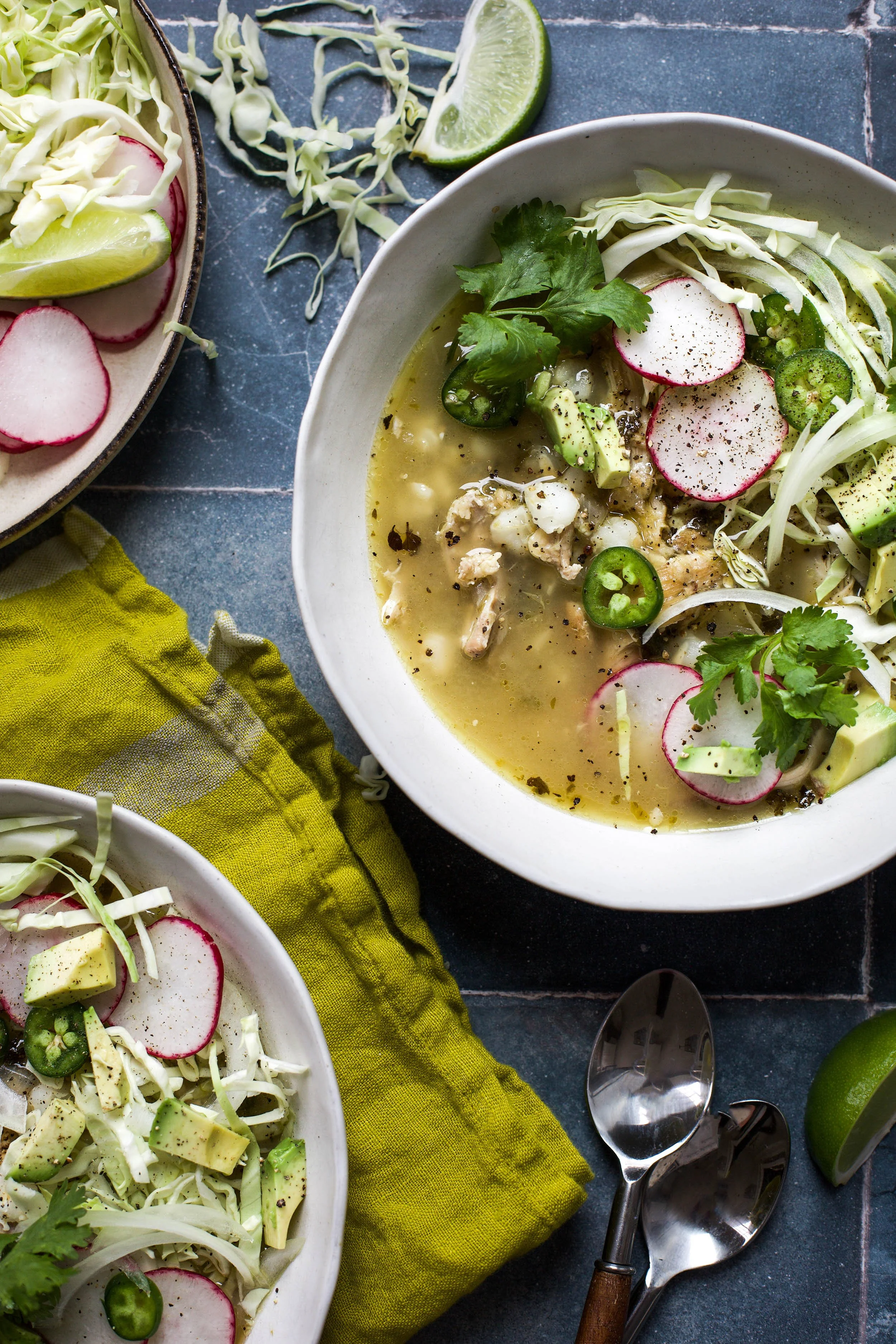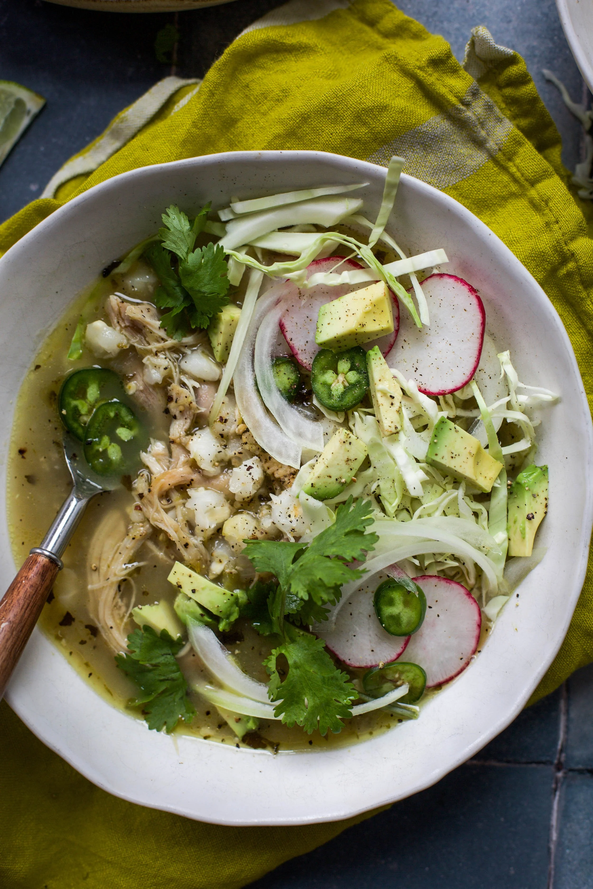 Traditionally the broth is cooked with a whole chicken along with tomatillos and chiles to create a delicious green chile broth. I however eliminated the cook time and steps by using store bought broth and store bought salsa verde, which essentially has all of the ingredients that you need already pureed up for you. I amp up the flavor so it tastes homemade by browning my chicken thighs and using really good quality chicken bone broth or stock if I don’t have any homemade in the refrigerator.