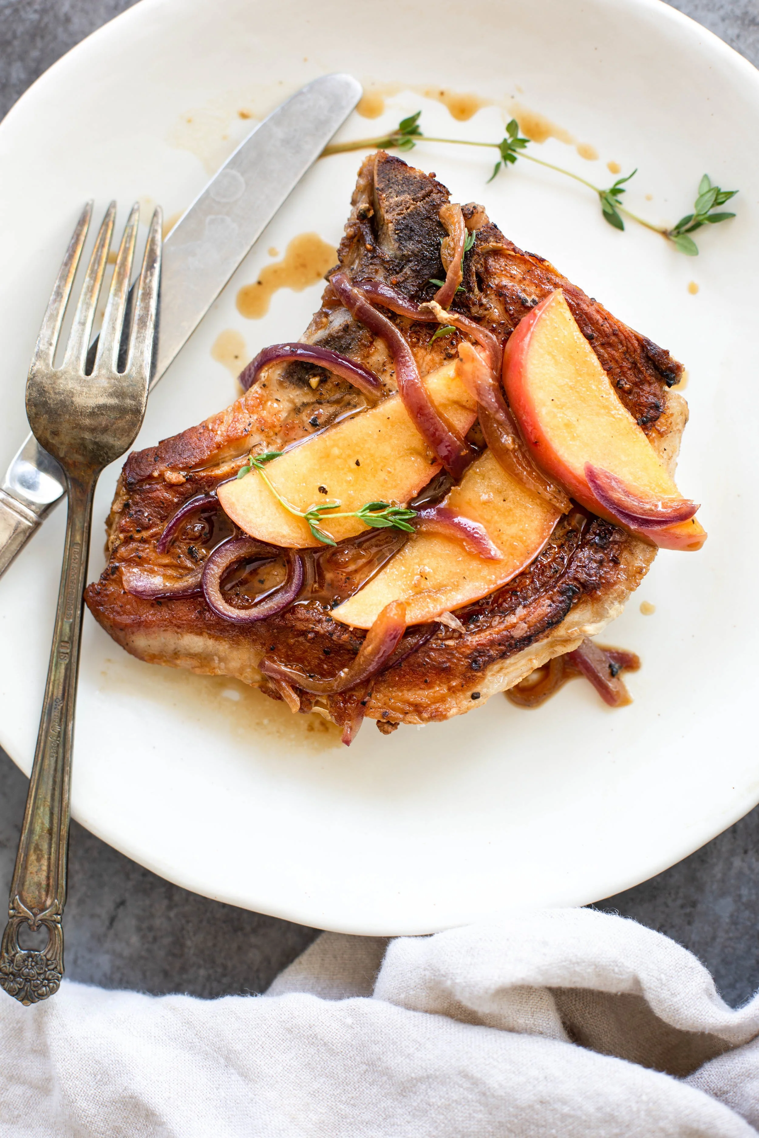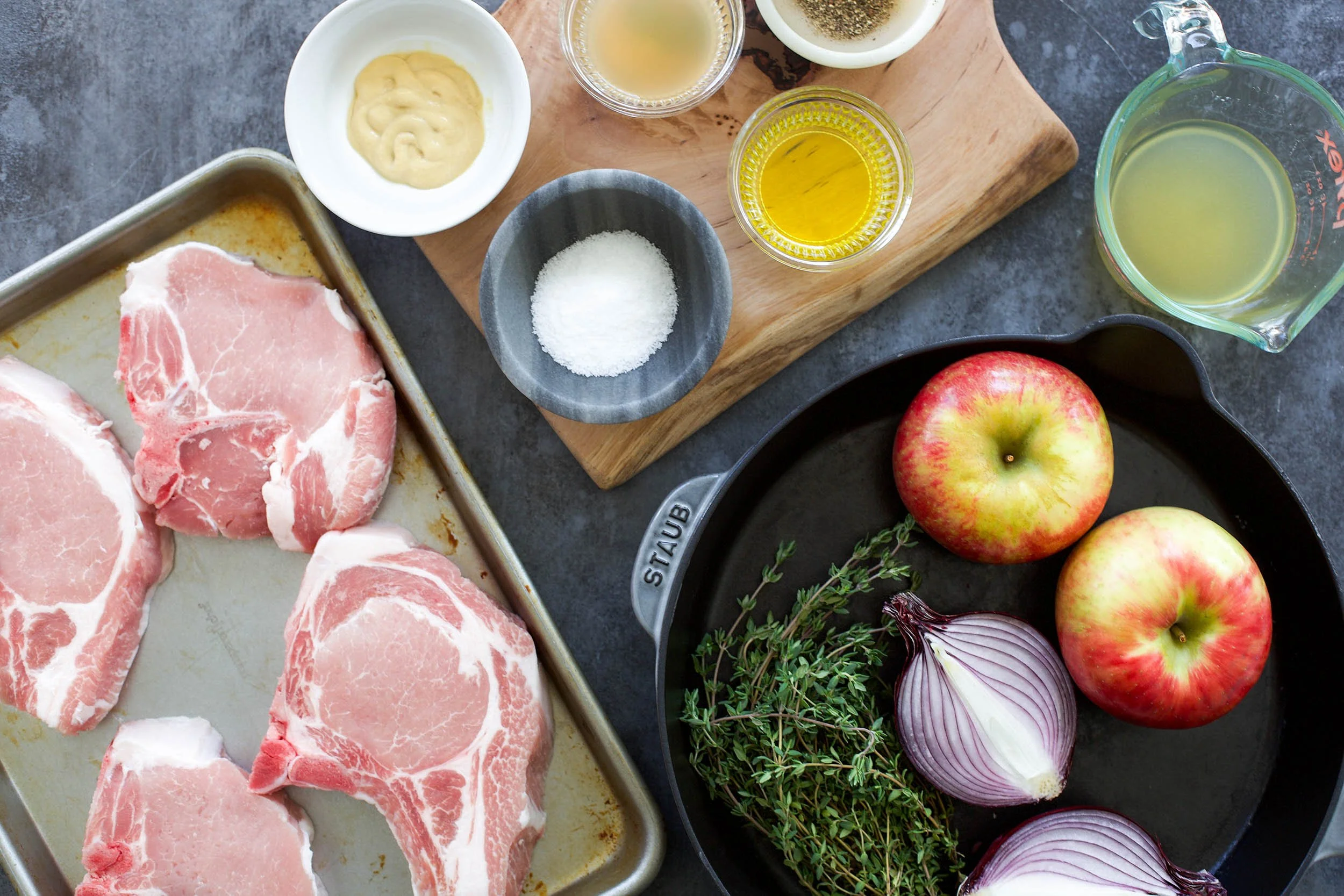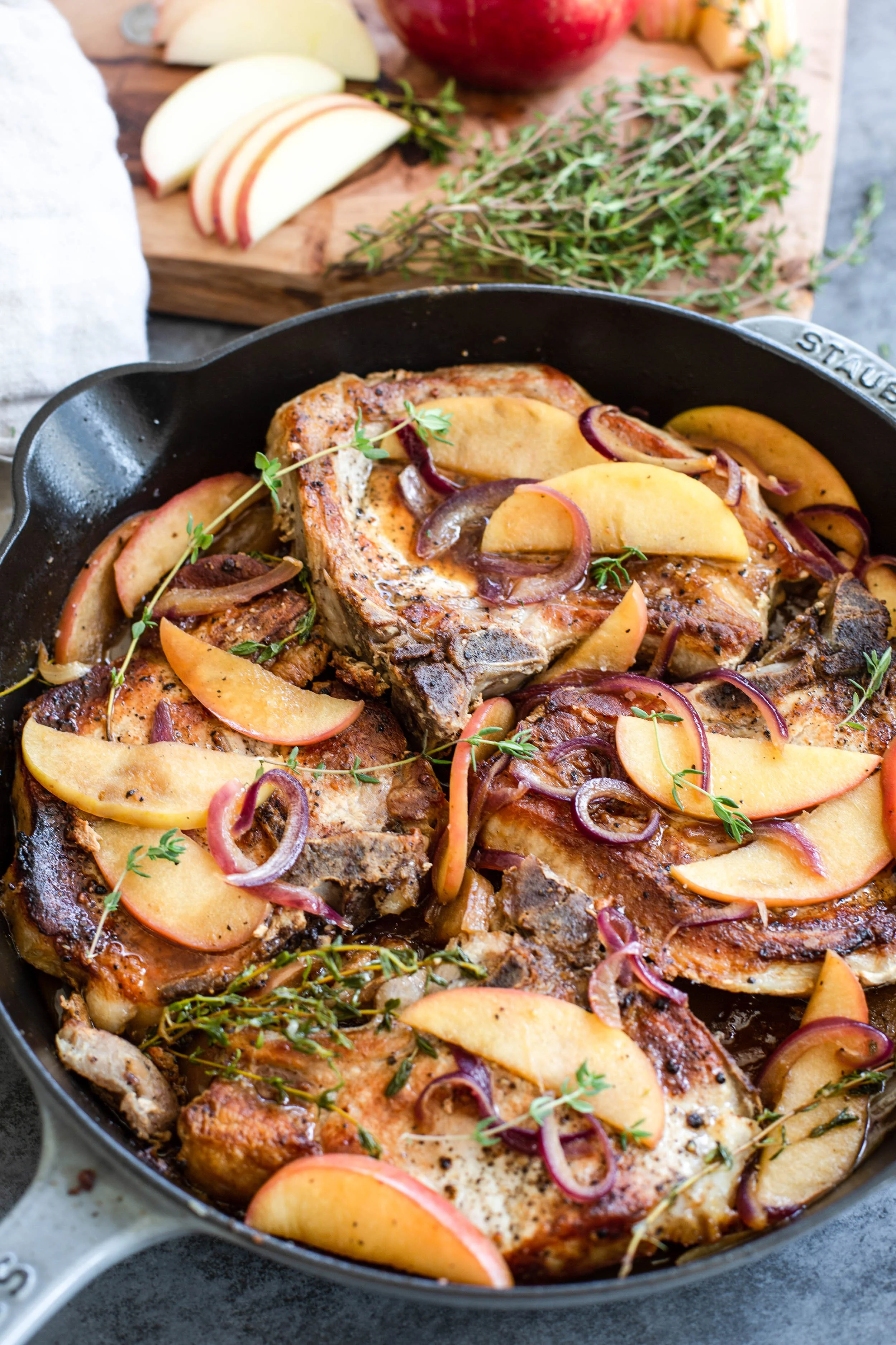 Pork chops are a dinnertime staple at our house. I love their versatility and flavor and they are just perfect paired with the apples in this skillet meal. I like to use bone-in chops for this recipe because the bone adds a ton of flavor and I find that the pork chops are more tender when the bone is left in. I also love using honey crisp apples here because I love the tart, yet sweet flavors that the apples have. You could definitely swap out a granny smith or a pink lady apple here as well if you prefer. The apples and pork chops combined with fresh thyme and onion come together beautifully in a delicious apple cider vinegar dijon sauce. Your house is going to smell amazing!
