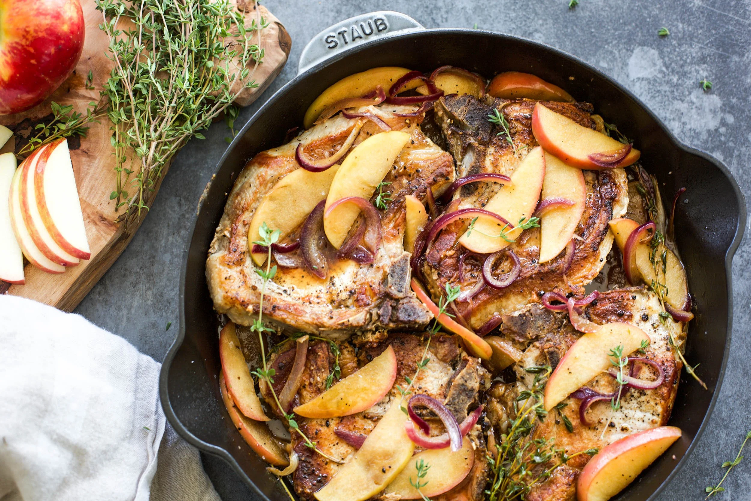 This weeknight dinner idea is simple enough to make on even the busiest night of the week, but could easily be served for entertaining as well. Pork chops, apples, onion, and a delicious sauce come together in one skillet to create a delicious meal that the whole family can enjoy. I partnered with my friends at Staub to create this one pan meal using my favorite Staub Cast Iron 11” Deep Skillet. It’s easy to clean, creates the most delicious sear on the chops, and is my go to pan in the kitchen! This recipe for skillet pork chop with apples is going to quickly become a weeknight dinner favorite.