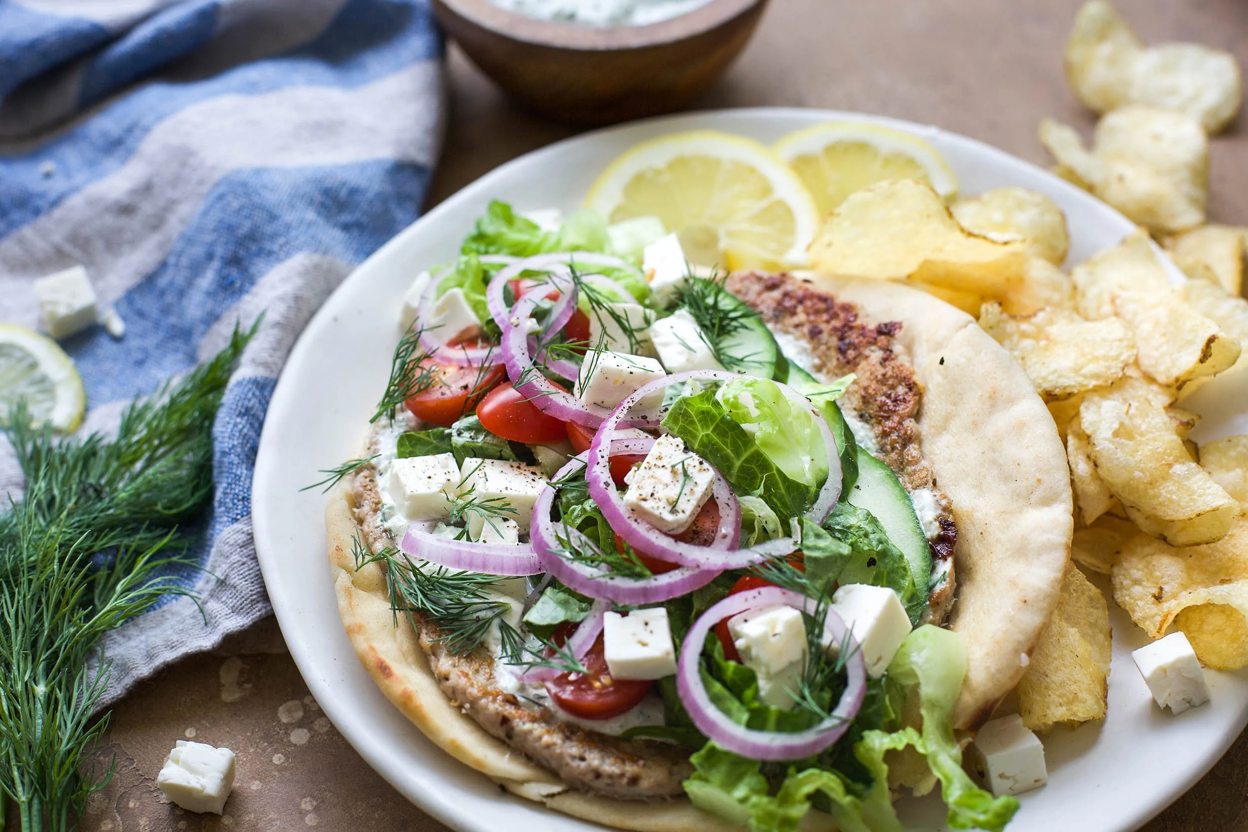 I use lean ground turkey, which is dark and white meat and stays juicier and has more flavor in my opinion. You can also substitute ground lamb or ground beef here if you prefer. I season the burgers simply with Greek seasoning, a little olive oil, salt, and pepper and then smash them under a pita on a hot skillet. This creates a super thin but flavorful turkey burger that is the size of a pita so you get the perfect amount of burger with each bite. Once the burger is cooked through, I like to slather a good amount of tzatziki over the burger and then top with lettuce, cucumbers, tomatoes, onion, and feta cheese.