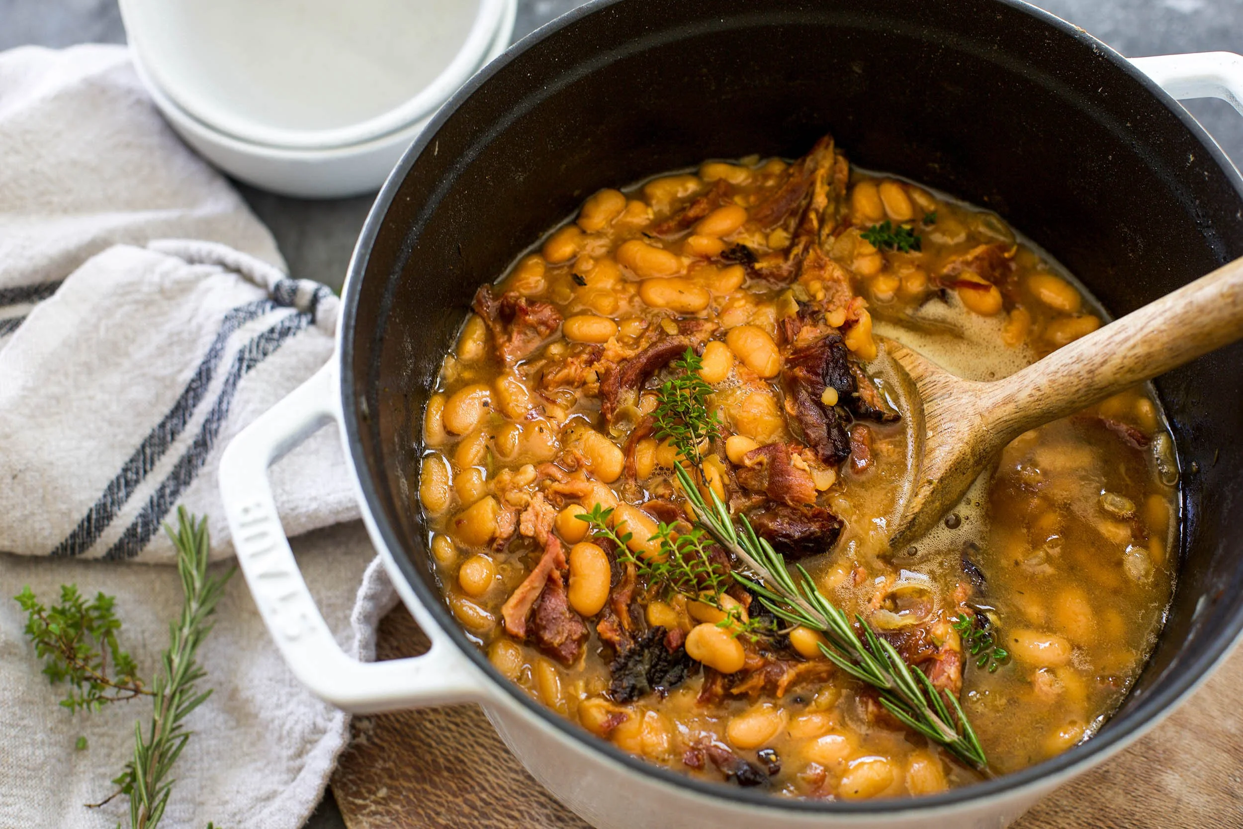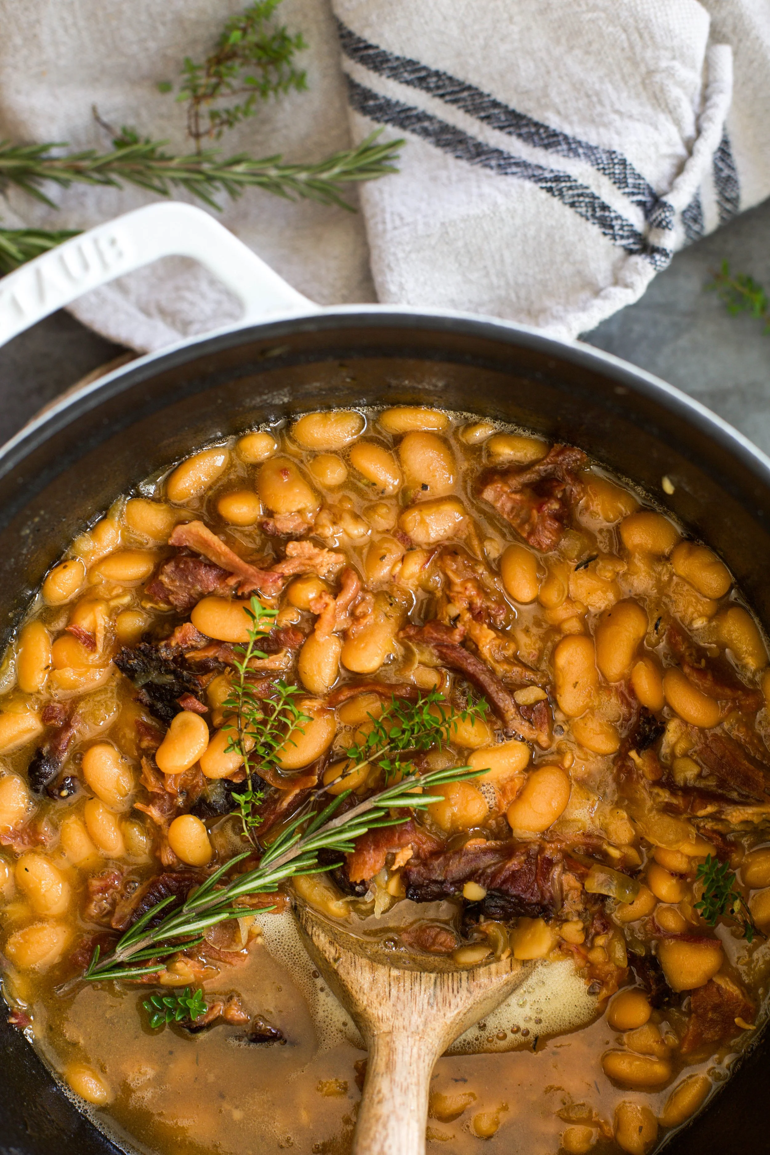 You can buy your ham hock at your local grocery or you can save the bones from a roasted ham that you might have cooked. I do not recommend skipping this key ingredient because it adds so much flavor to the beans. I also love using rosemary and thyme here which just pair perfectly with the beans and give them that delicious herby flavor. Of course you could use dried herbs here, but if you can find them fresh, it is preferred. You can also use turkey stock here or vegetable stock but I do think stock over water is the way to go because it adds another level of flavor. Also depending on the stock you use, the color of your beans might be darker or lighter, but either way they will be delicious!