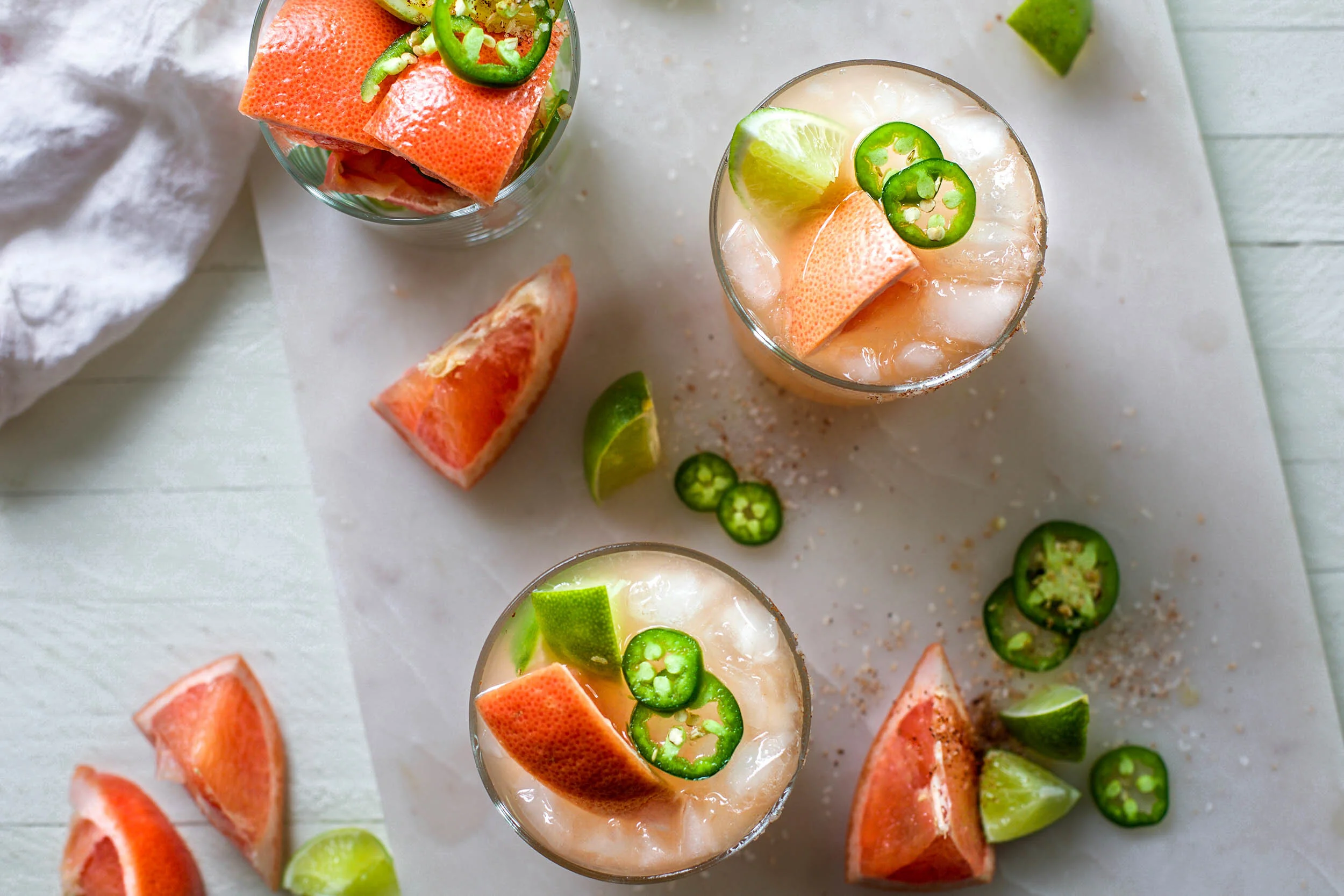 Mix grapefruit juice, lime juice, jalapeno slices, tequila, and agave in a cocktail shaker or large mason jar and shake to combine.