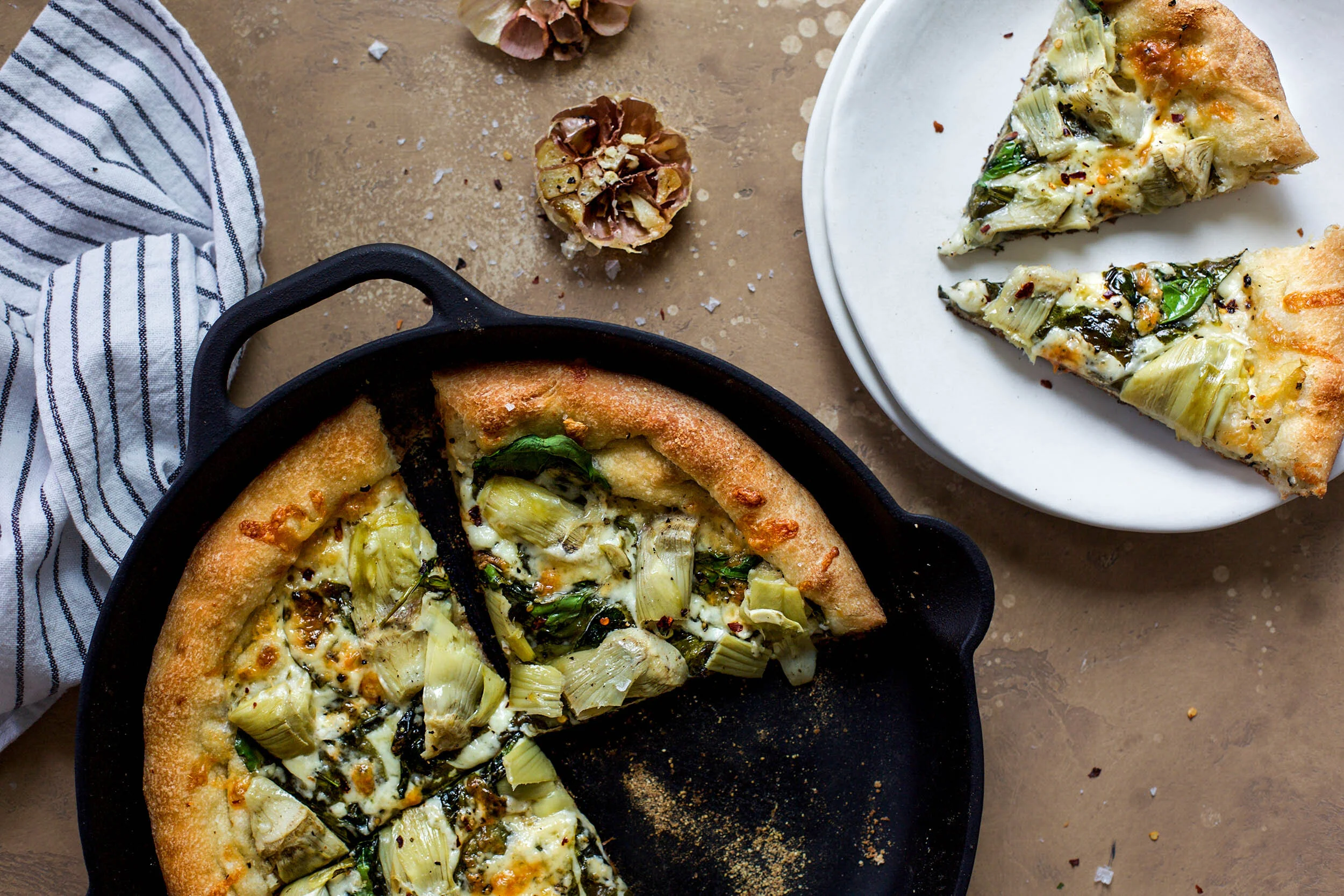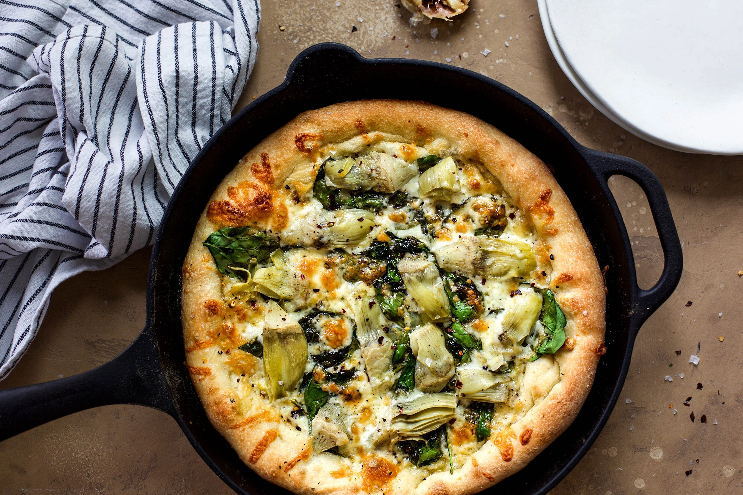 Homemade pizza is always a good idea if you ask me. We regularly have pizza night at our house and one of my favorite ways to make a pizza that is always delicious is to bake it in a cast iron skillet. Baking your pizza in a skillet ensures your crust is crispy and perfect every single time. I have a few favorite ways to top it, but a pizza that will quickly become a favorite in your house is my spinach artichoke pizza. This recipe for spinach artichoke pan pizza is going to quickly become one of your new favorite pizza recipes that you make over and over again.
