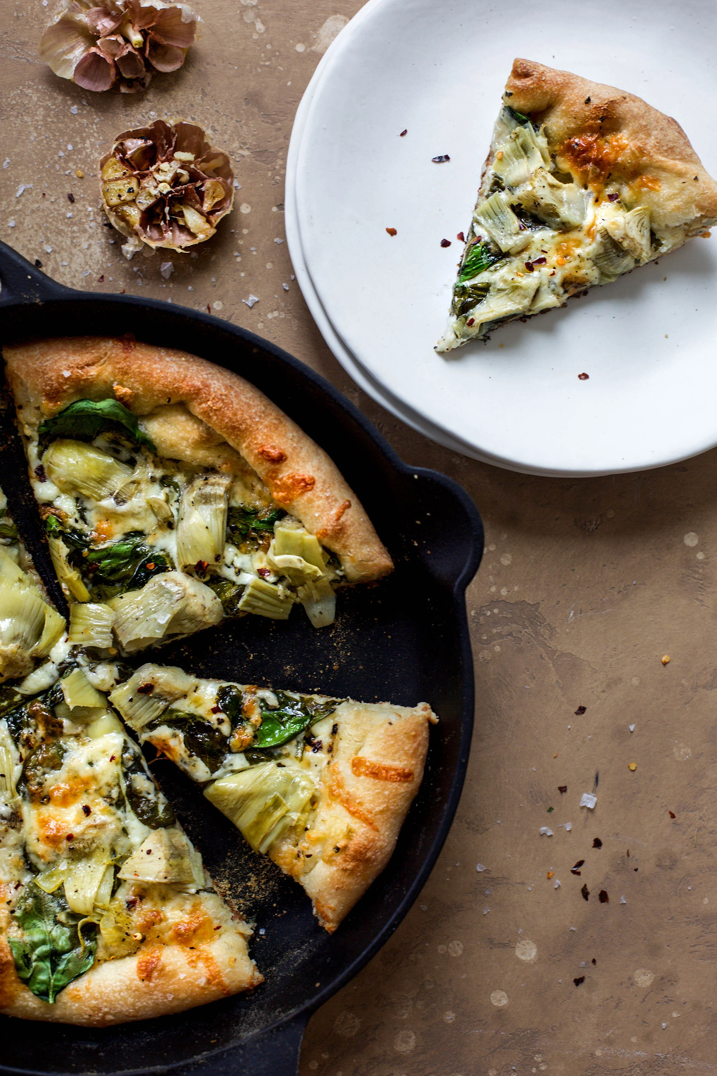 I made this recipe a while back over on my Instagram page and somehow forgot that it needed a permanent home here. But, better late than never if you ask me. If you love the classic spinach artichoke combo then you are going to flip for this pizza. I add another depth of flavor here by roasting a whole head of garlic and then slathering the golden delicious cloves over the crust before adding the cheese. Talk about a flavor explosion, it is out of this world truly. I also use a pepper jack cheese for a little heat and keep big chunks of artichoke for every bite. This pizza is mouthwateringly delicious let me tell ya.