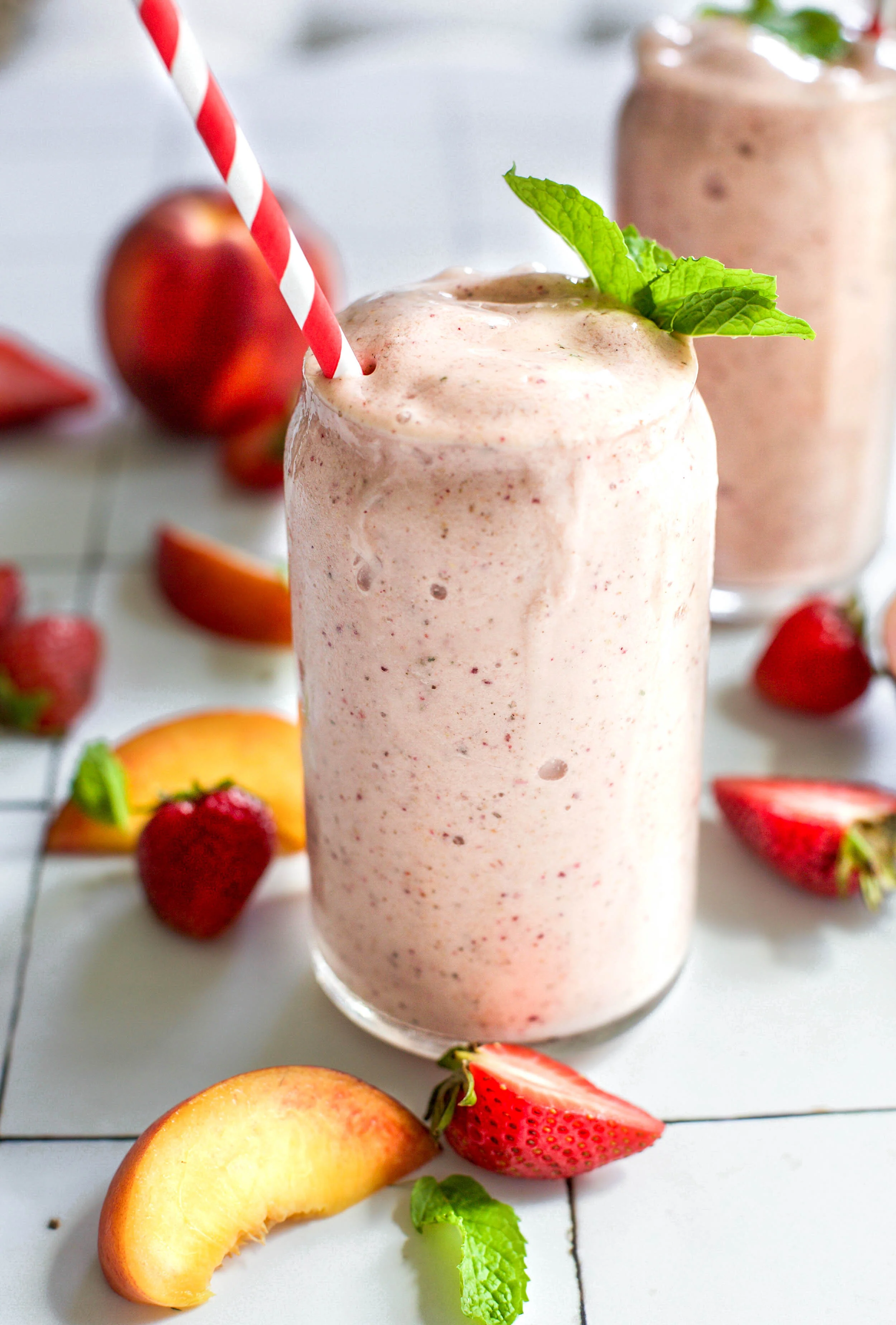 You of course could use all strawberries or all peaches here, but I happen to love the combo of the two. With a little vanilla extract added, this smoothie truly tastes like a milkshake and kiddos and adults alike will be happy to drink it right up. I tend to like my smoothies on the thicker side, but of course if you like a thinner smoothie, simply add less fruit or add more liquid here. You can also add in some frozen cauliflower if you want to add a veggie into the mix, but even without the vegetables, it’s still a super healthy smoothie.