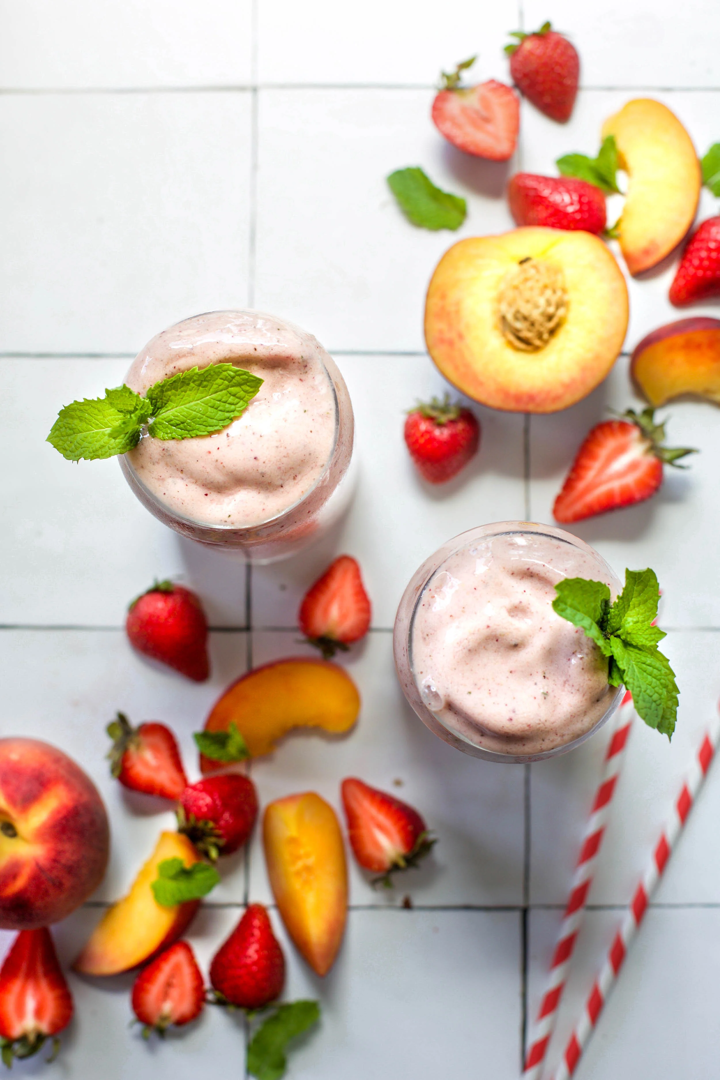 Smoothies are one of those things that we tend to make more of in the summer months. When it’s hot outside, sometimes all you want is something cold and nourishing. I love that I can pack my smoothies with good for you ingredients and that they always taste delicious too. I tend to use fruit that is in season and buy it in bulk and then freeze some of it when it gets perfectly ripe and sweet. Peaches are particularly great for this because they ripen so quickly. This recipe for my strawberry and peach smoothie tastes like a milkshake, I kid you not, and you are going to love making it all summer long!