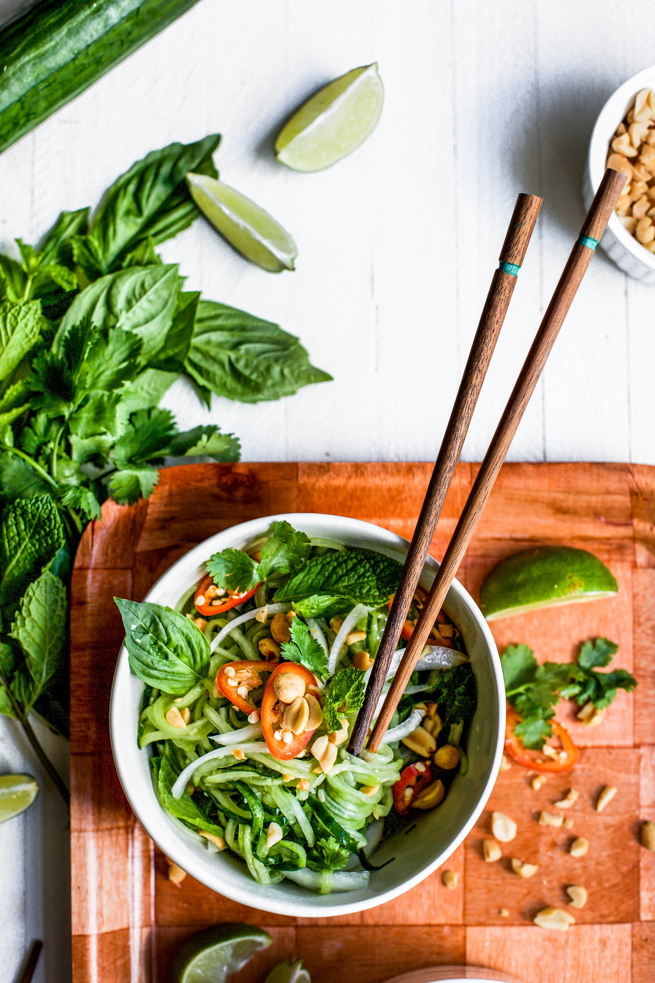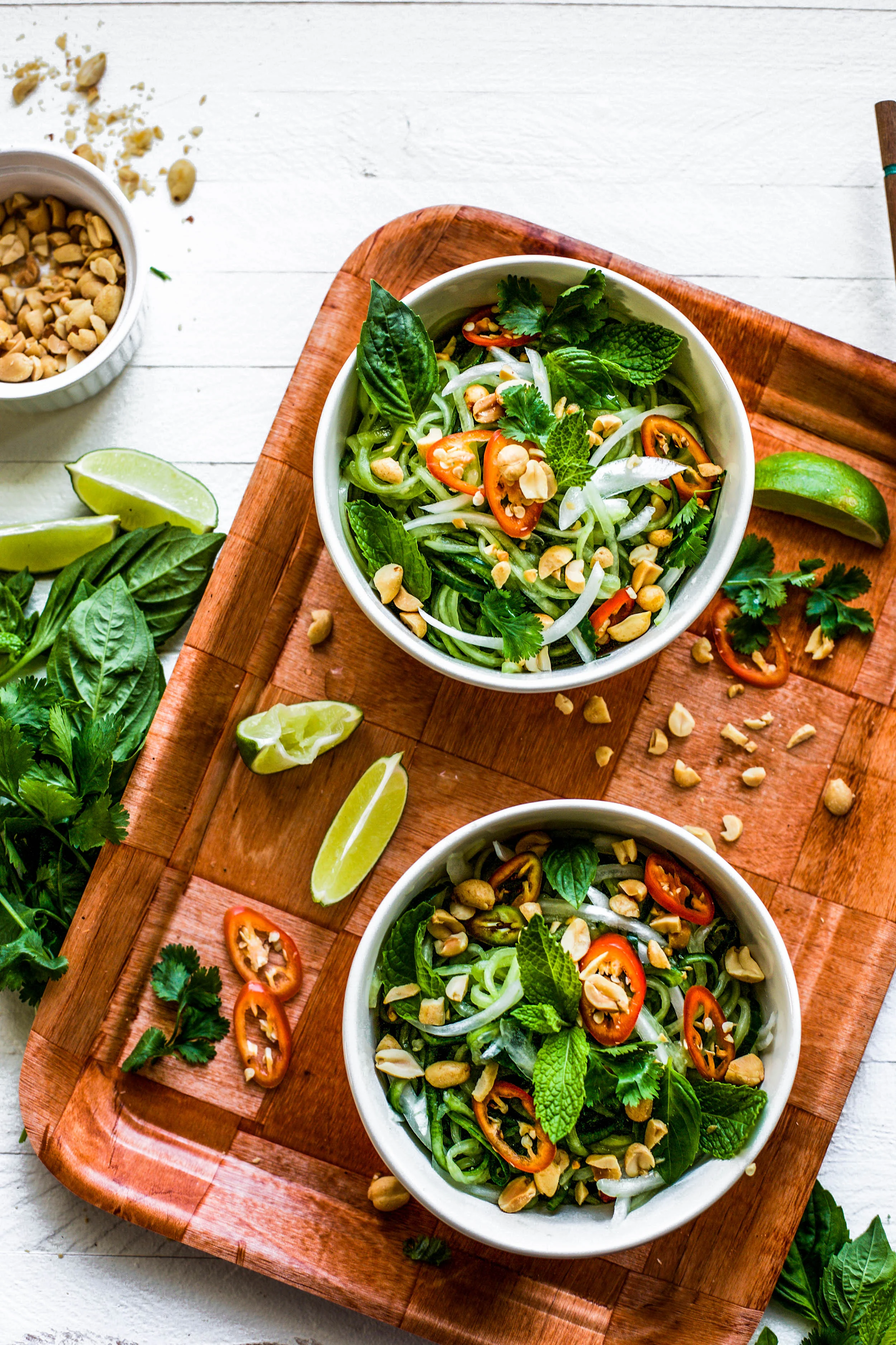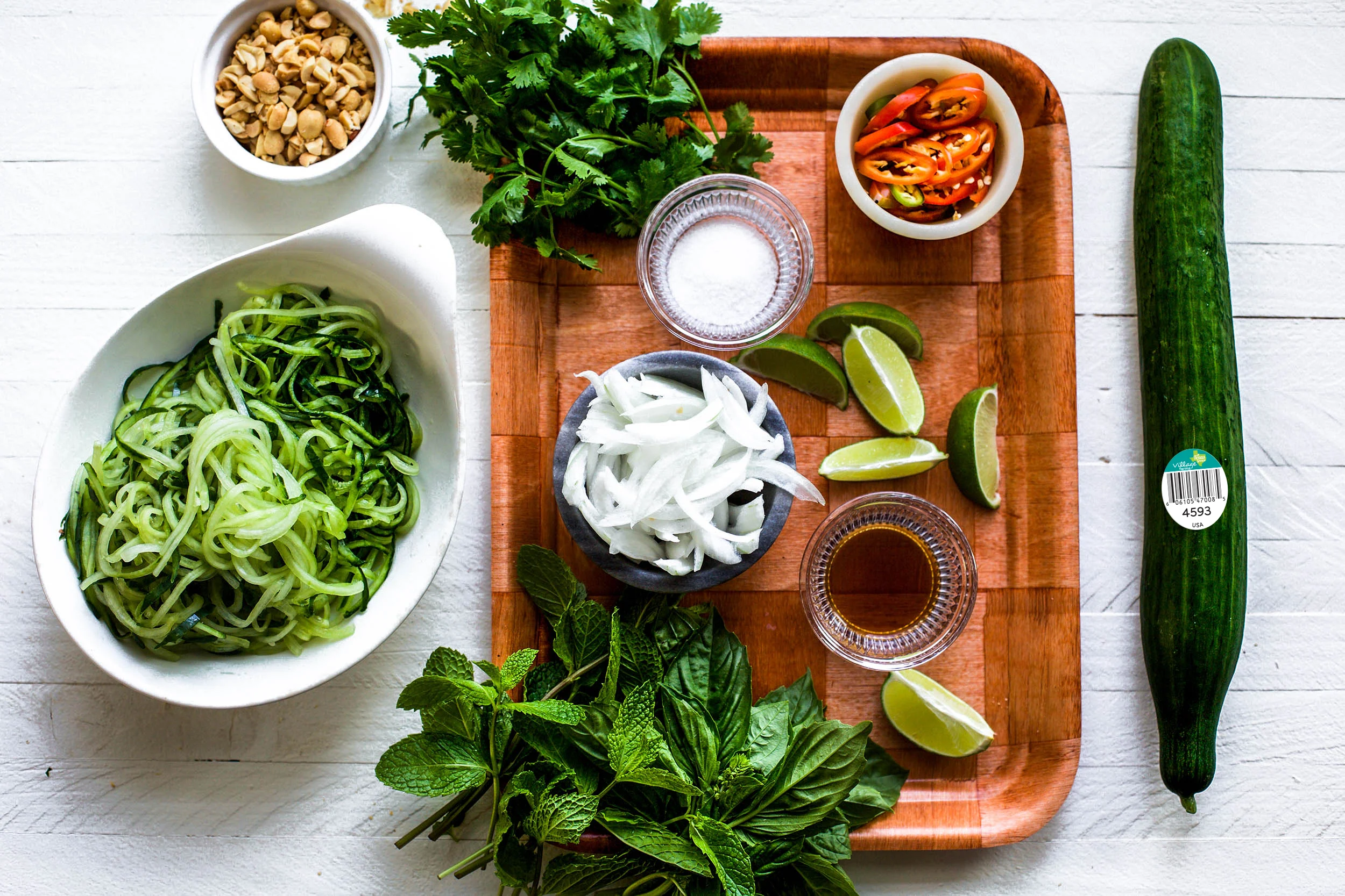The first recipe we are going to cook up is my Spicy Asian Cucumber Noodle Salad that is the perfect side dish to bring to potlucks, or to serve up any of the night with some grilled chicken thighs or seafood! I used Village Farms Luscious Seedless Long English® Cucumbers to make crisp cucumber noodles, which are so fun for this salad! I toss them with a Thai inspired vinaigrette and finish it all off with spicy peppers, fresh herbs, and crushed peanuts! This salad is one for the books and couldn’t be more beautiful either! I could seriously eat this dish every day of the week and never get tired of it and you are going to love it too!