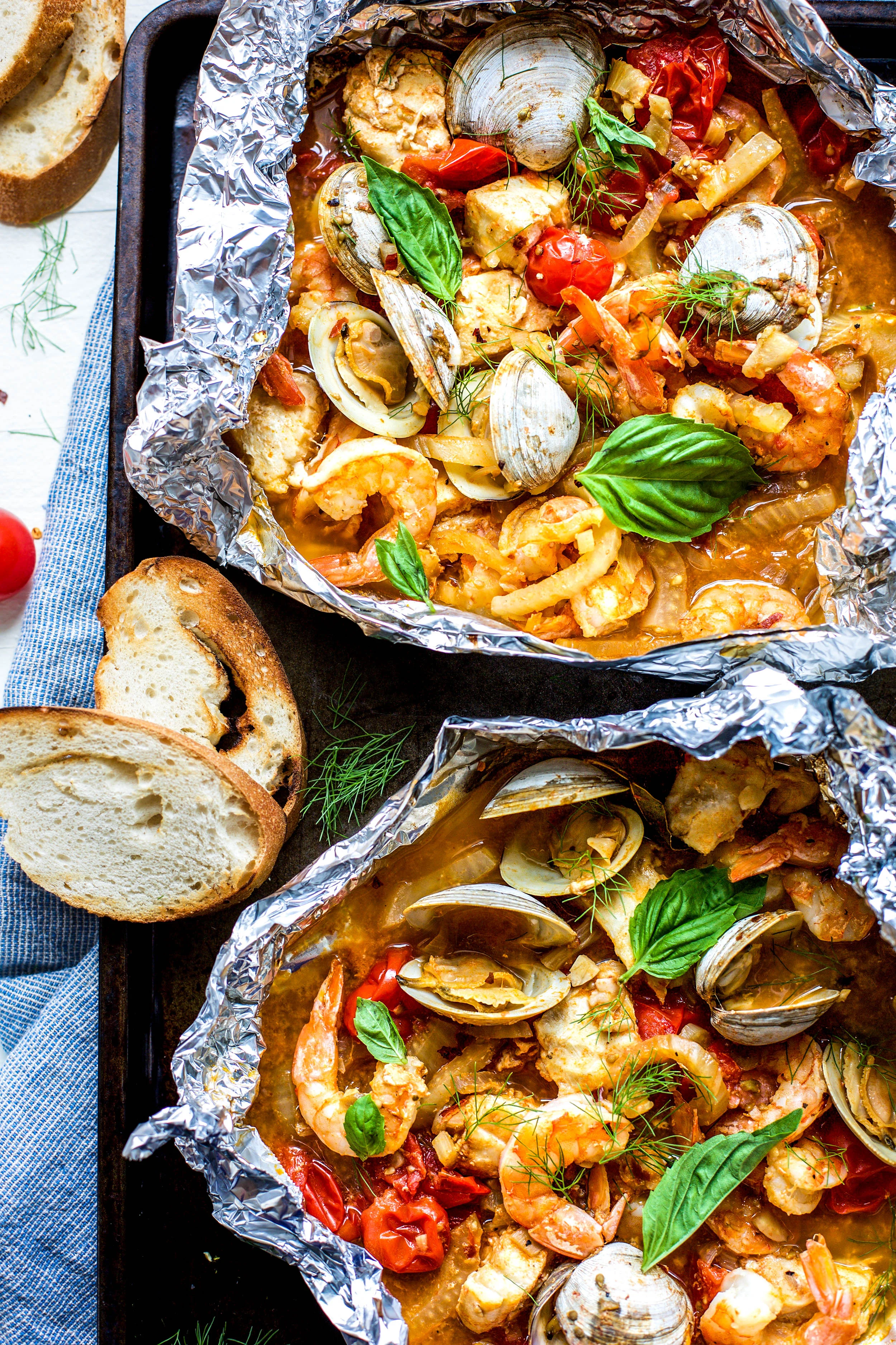 To serve open foil packets, garnish with fresh basil, and serve with grilled bread for dipping.
