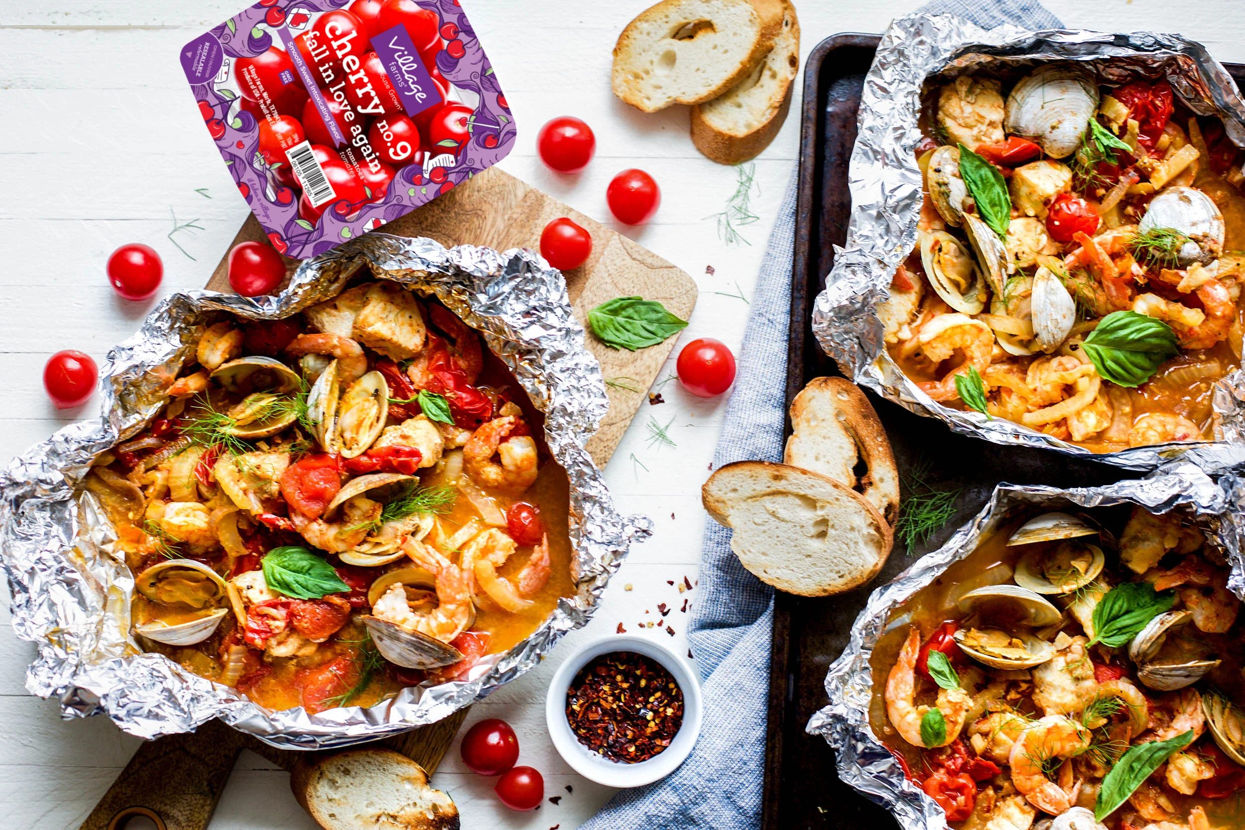 For the second recipe, we are heading to the coast of Italy! Not really, but we are going to pretend! My Grilled Cioppino Foil Packets are perfect for warm summer nights complete with a crisp glass of your favorite white wine! If you don’t know what cioppino is, it’s a seafood stew, typically served in a large pot on the stove, but I turned it into an easy recipe that can be made into individual packets on the grill perfect for entertaining! I took one of my favorite tomatoes, Village Farms Cherry no. 9 Fall in Love Again® tomatoes and turned them into a luscious sauce that is a delicious base for lots of fresh seafood! These cioppino foil packets are packed full of flavor and your guests are going to flip over how tasty and beautiful they are!