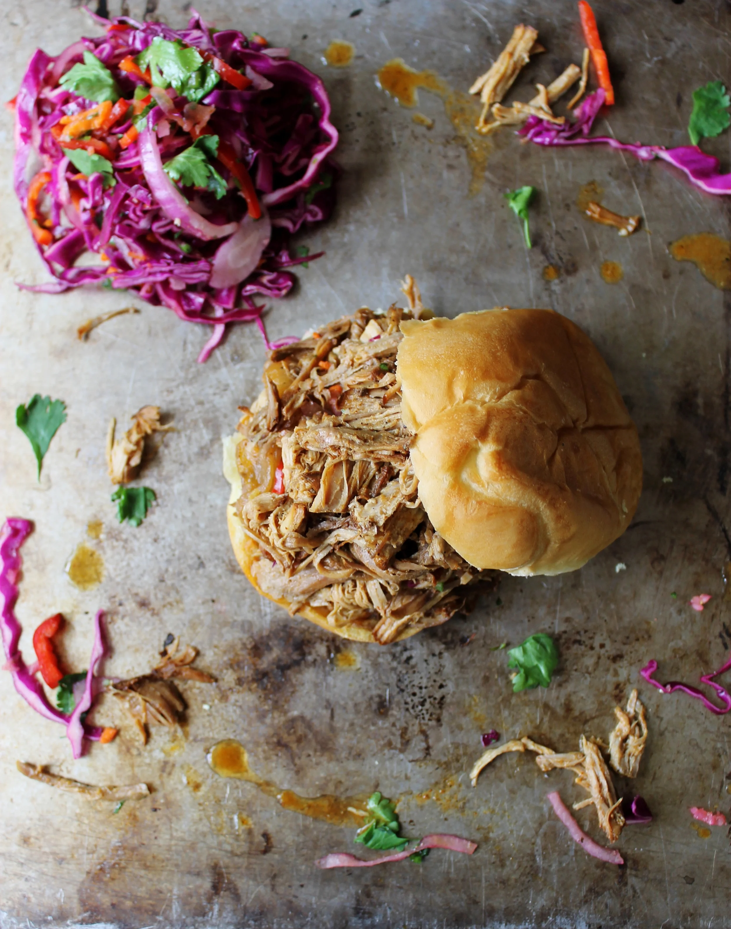 It's football time guys, and while you might be really excited about your big game tomorrow, I am all about what we are eating for the big game. I grew up in a football house, and I can't really remember a weekend that football wasn't always on TV or we were at a game. Still to this day I love nothing more than to hear the crowd roar as background noise throughout the house. It's a comfort thing for me, but what I love more is the food thing that happens during football season. Burgers, wings, dips, and things like my crock pot pulled pork sandwiches with garlic, cumin, and lime slaw.
